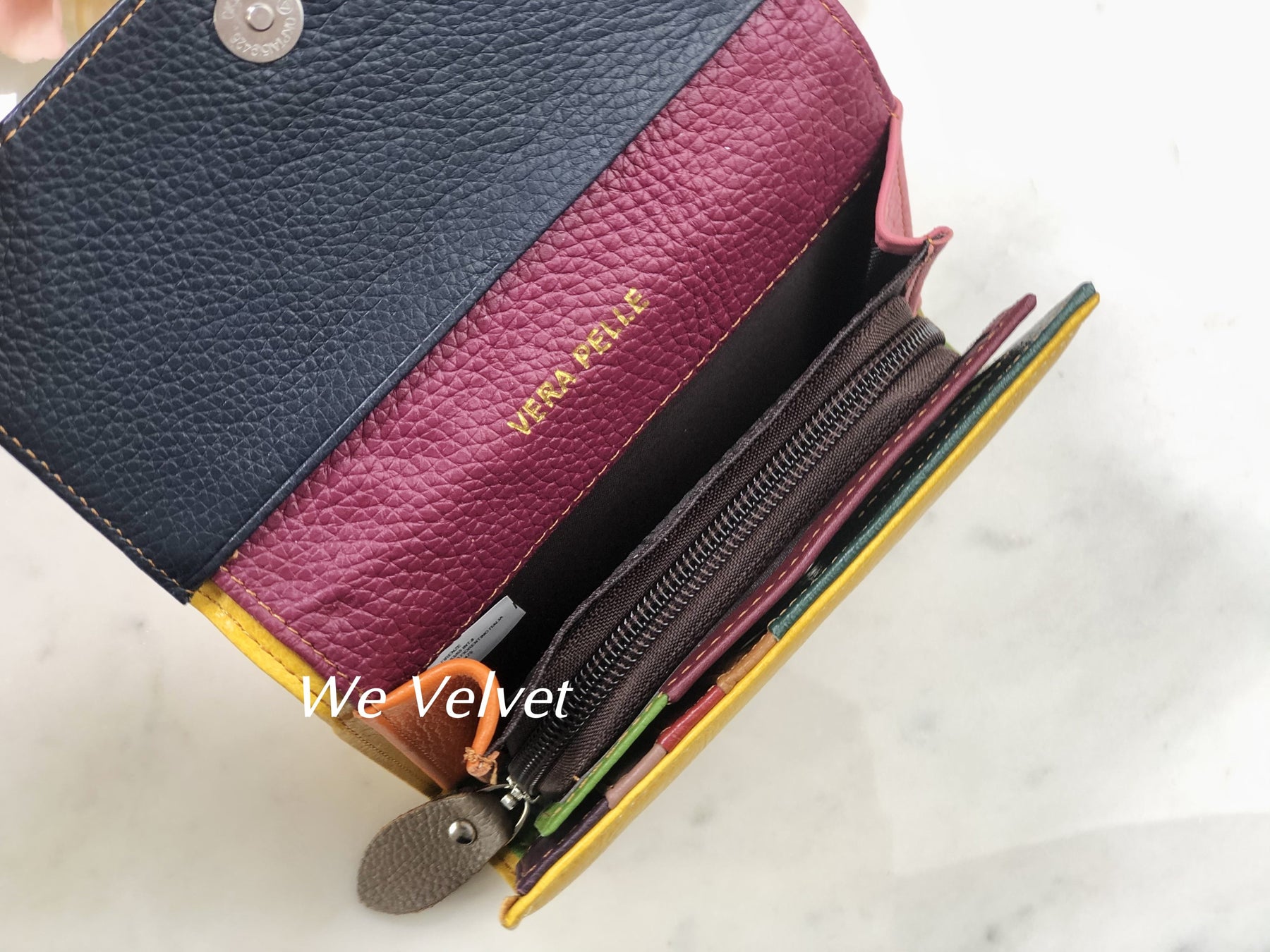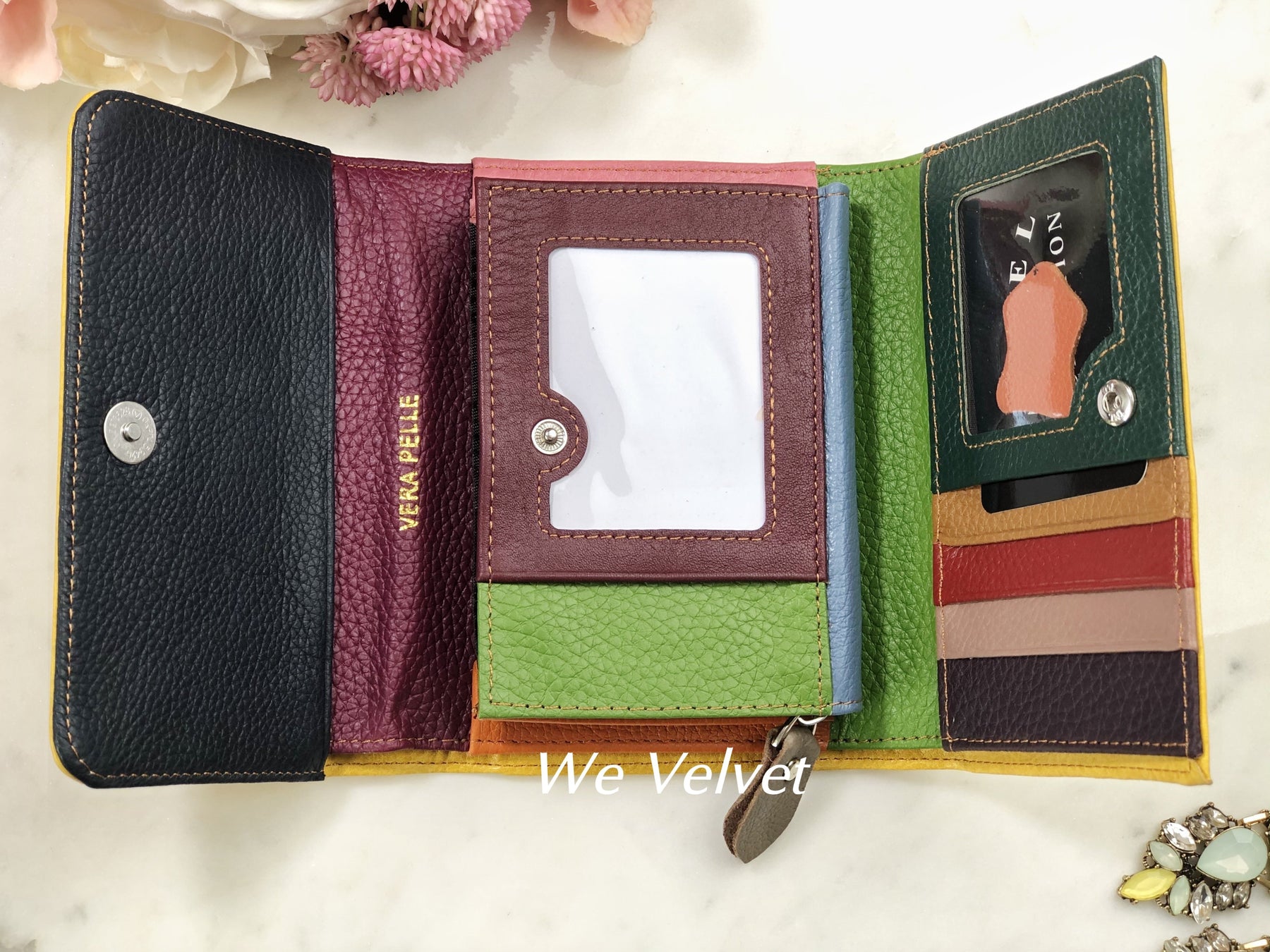 • La interior dispune de 5 compartimente pentru carduri, 3 compartimente libere pentru bancnote și documente și un buzunar cu fermoar