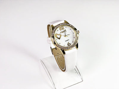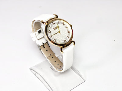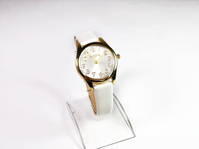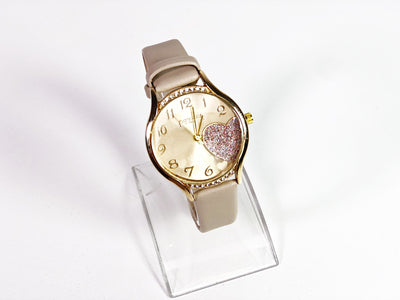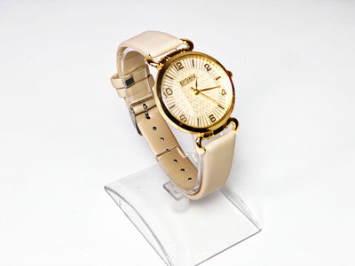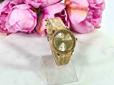 Ceas auriu și curea bej din piele eco lăcuită C287