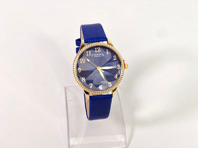 Ceas auriu și curea bleumarin din piele eco lăcuită C301