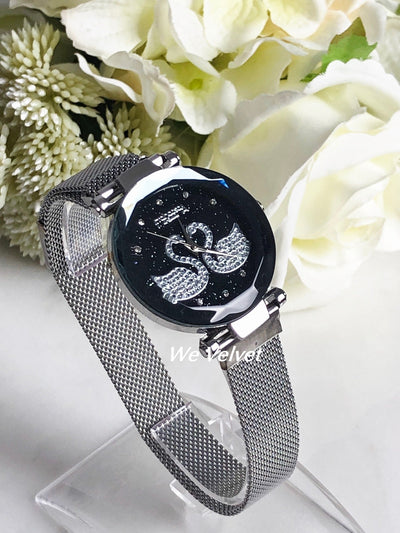 Ceas argintiu cu lebede strălucitoare și brățară magnetică Francesca di Geneva C52