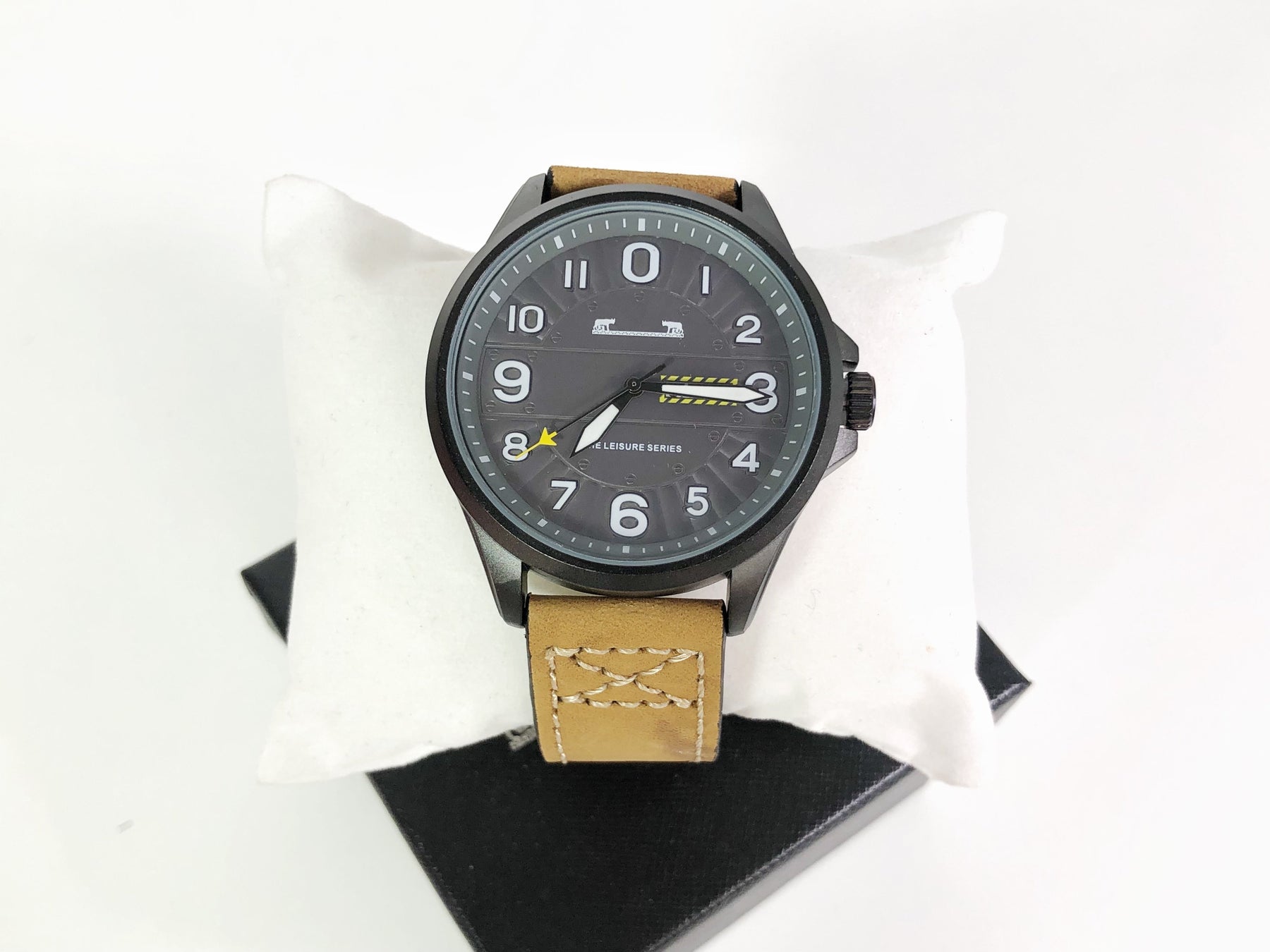 Ceas bărbătesc negru și curea maro din piele eco și cutie cadou C242
