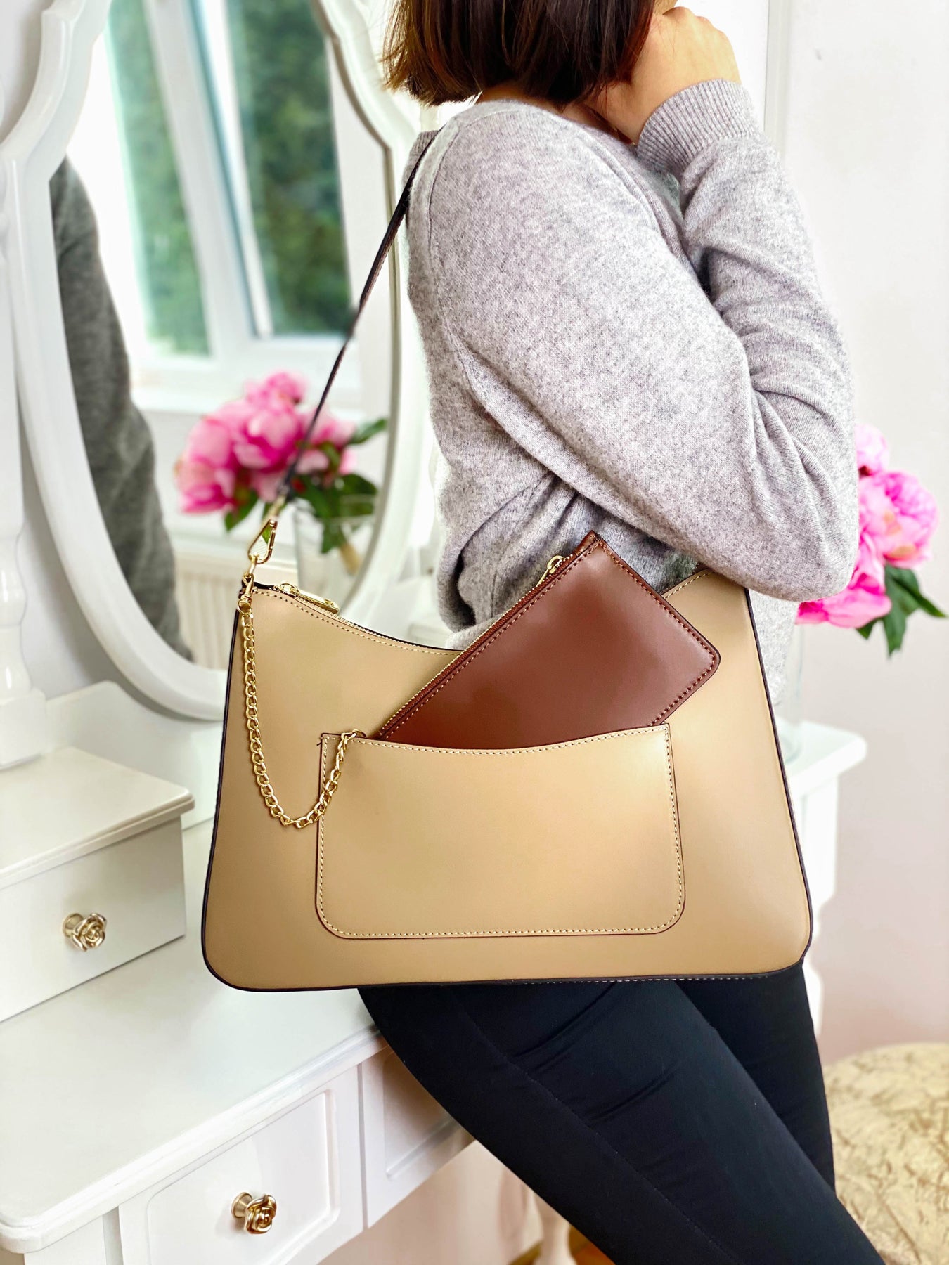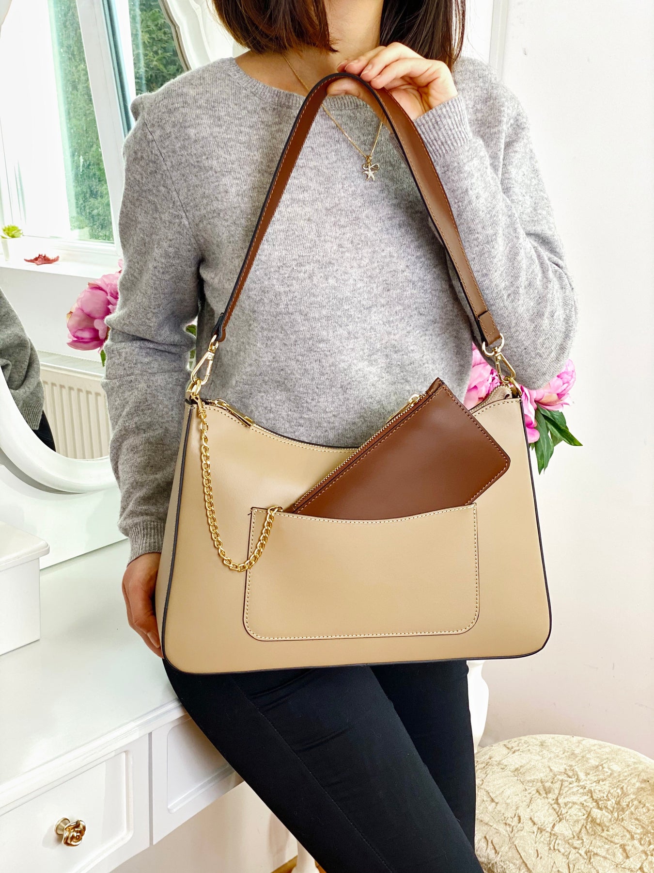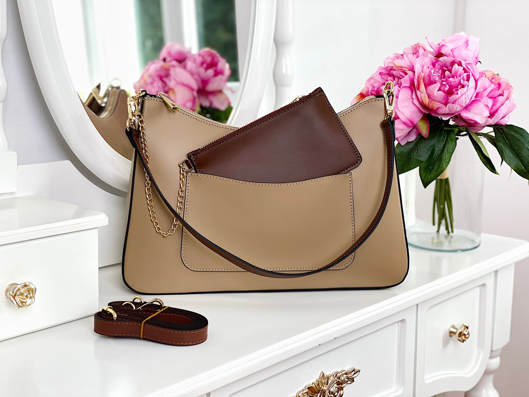 Set geantă nude piele naturală cu portofel maro Carmelina