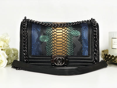 Geantă neagră piele eco cu print snake bleumarin, verde și portocaliu Destiny