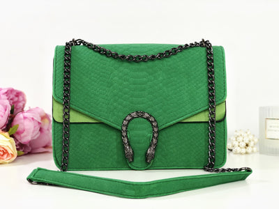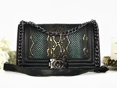 Geantă neagră piele eco cu print snake verde și gold Destiny