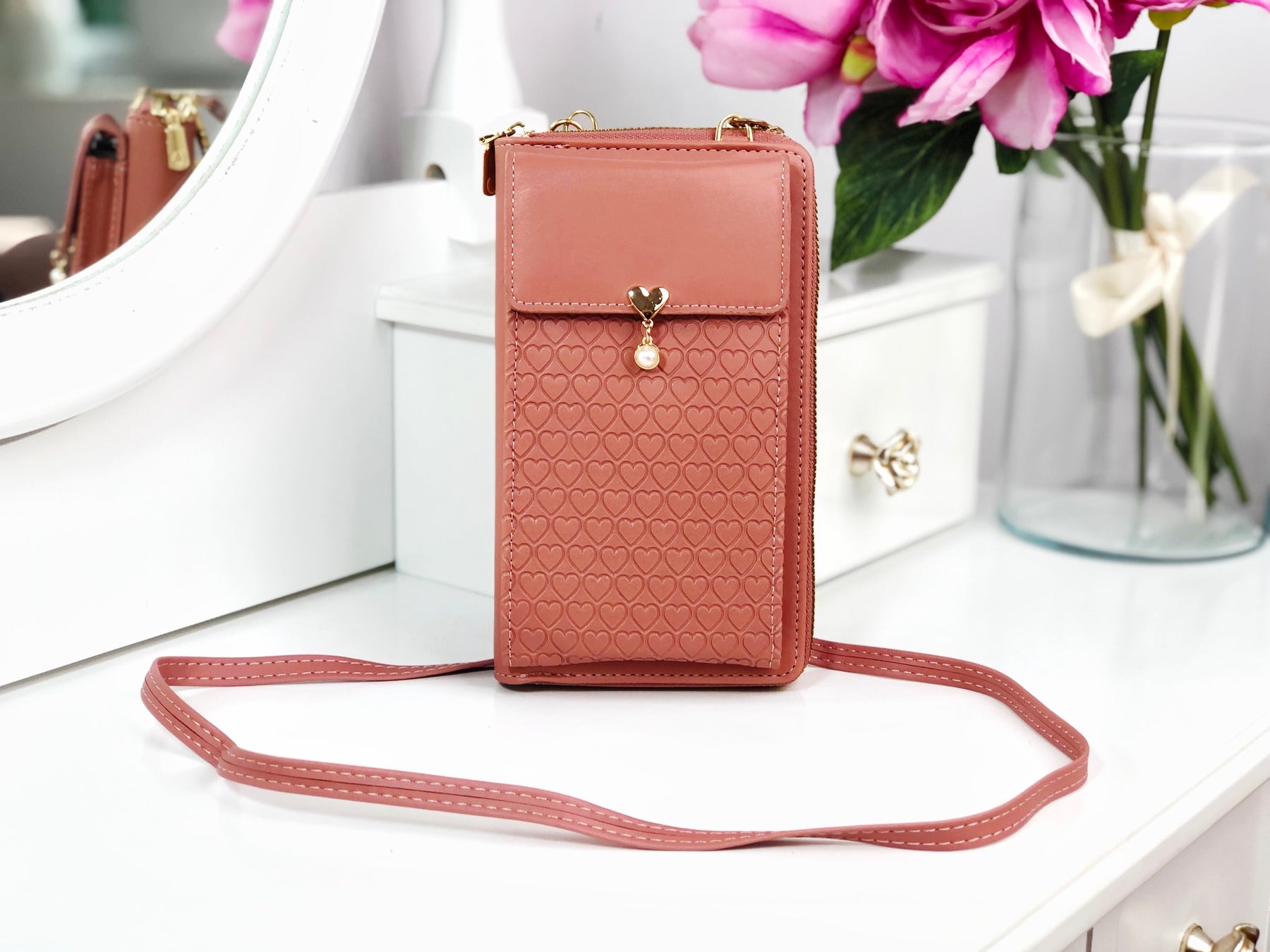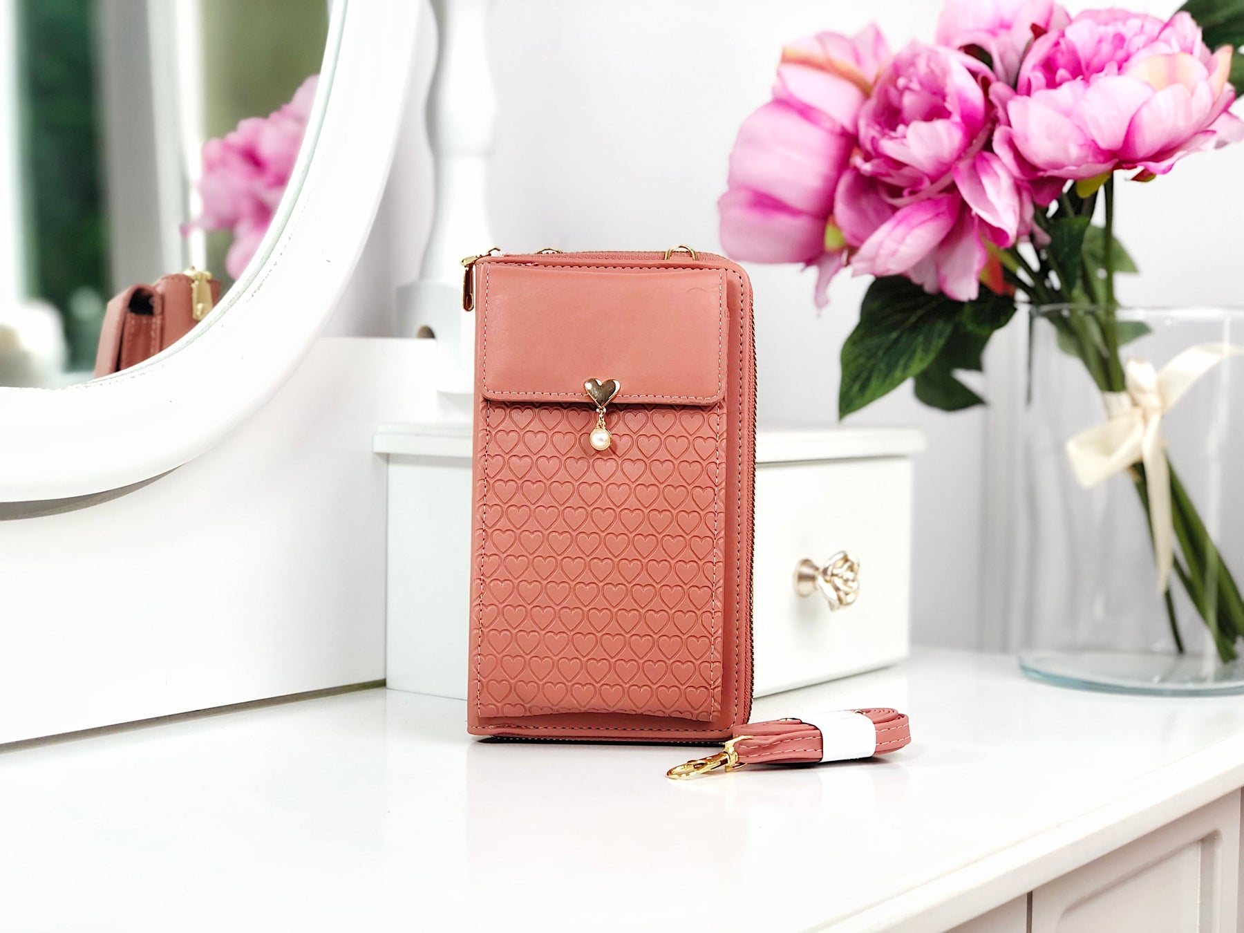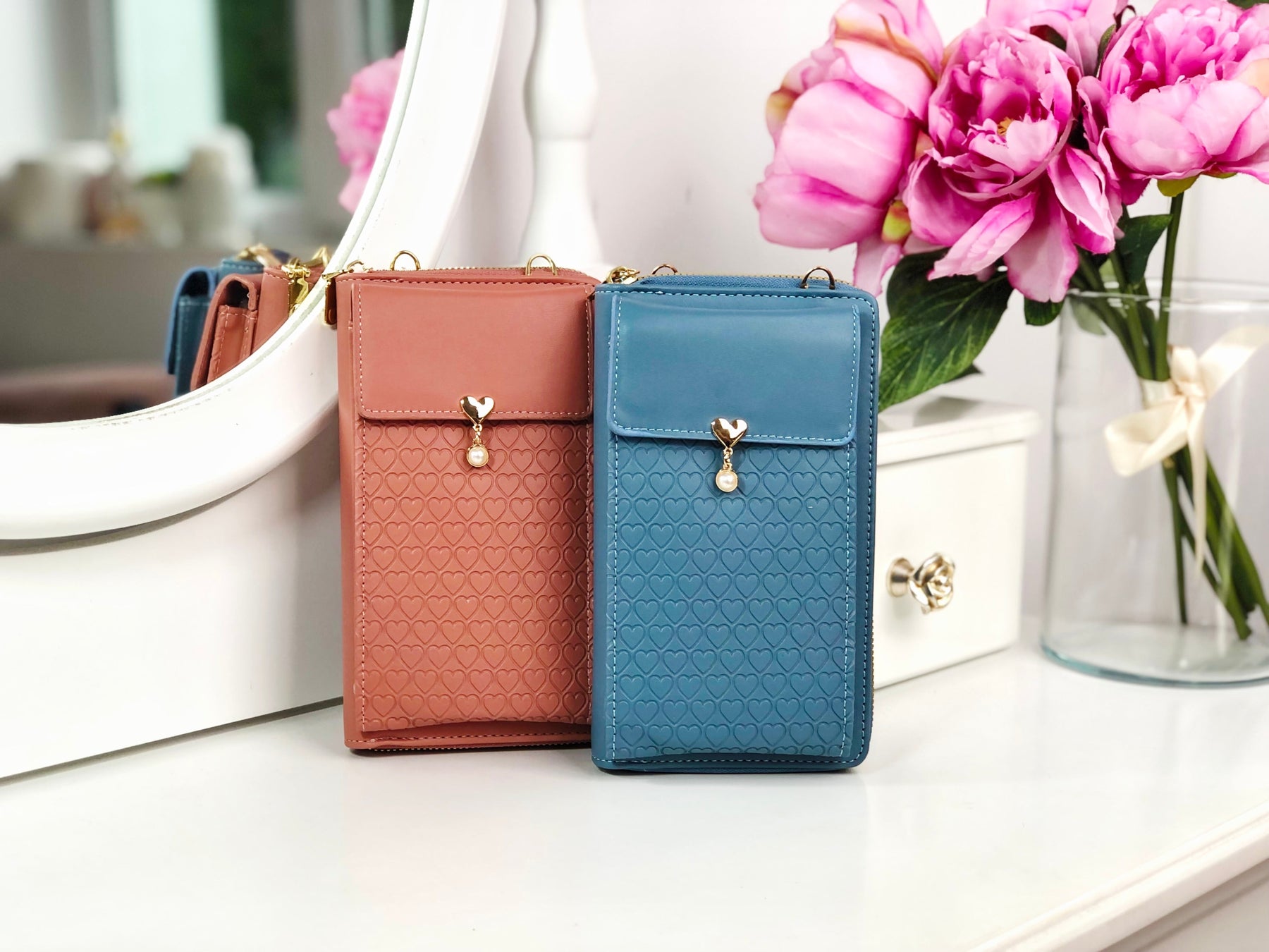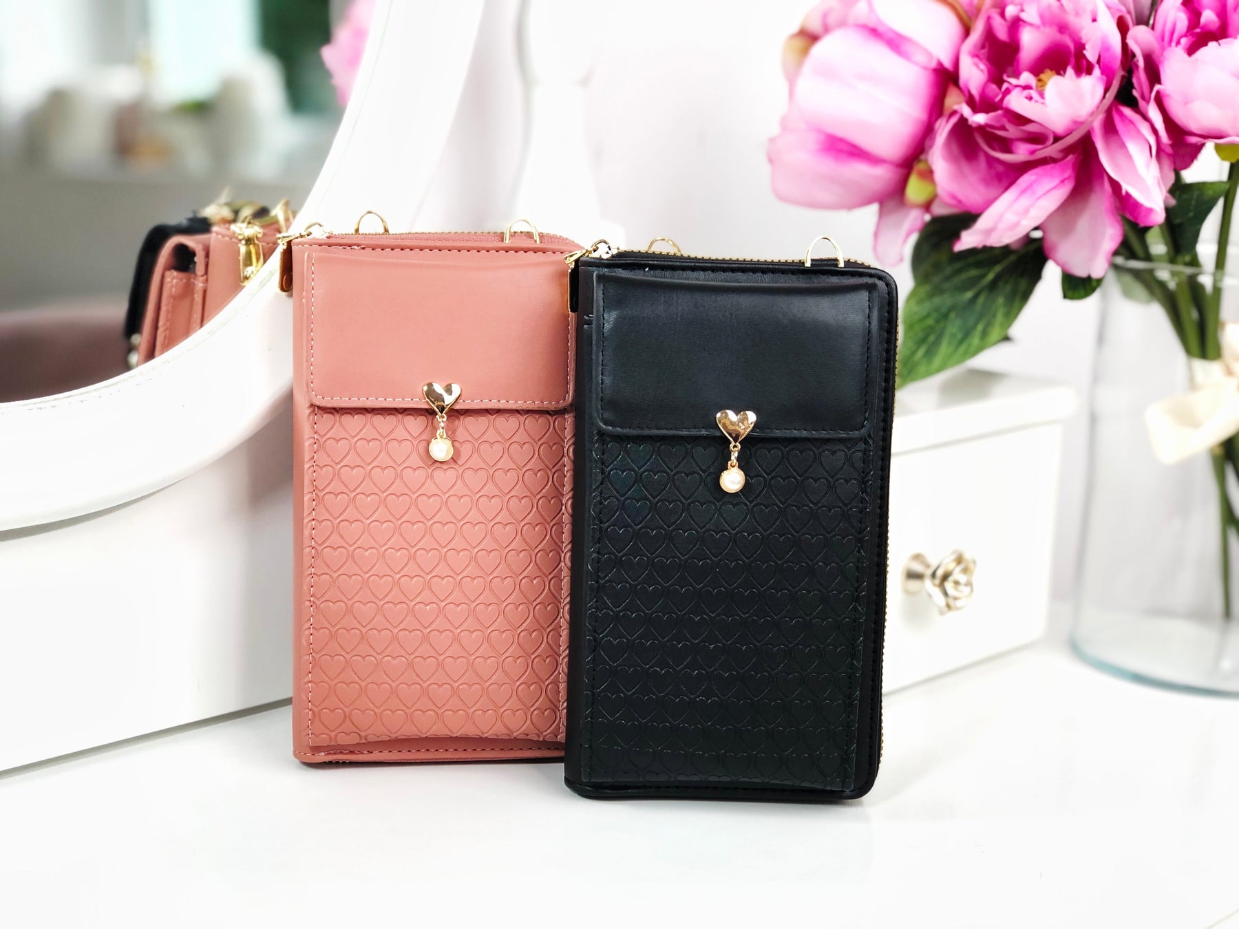 Mini geantă pentru telefonul mobil și un suuuper portofel! Drăgălaș, decorat cu muuulte inimioare simpatice, pentru a-ți infrumuseța zilele!