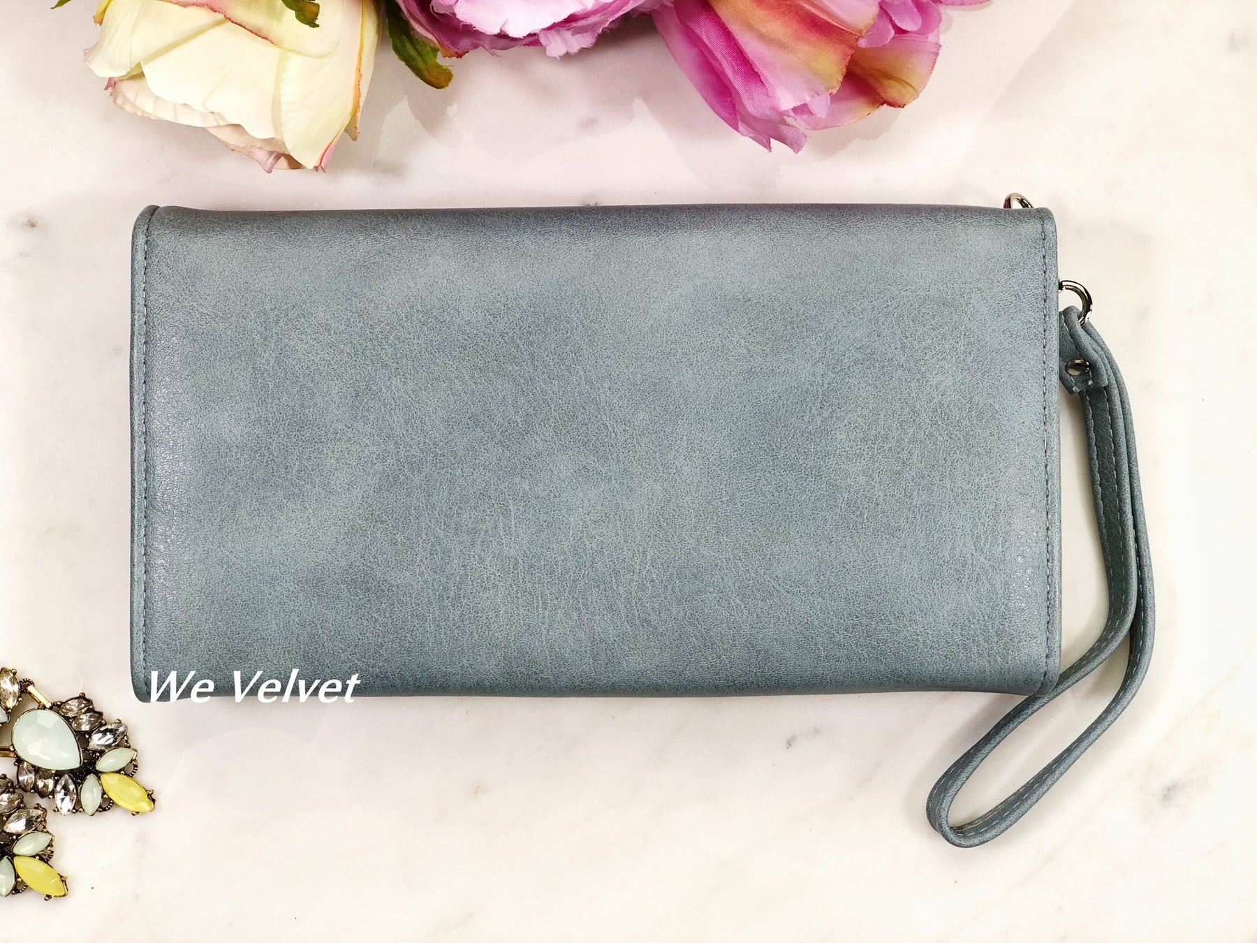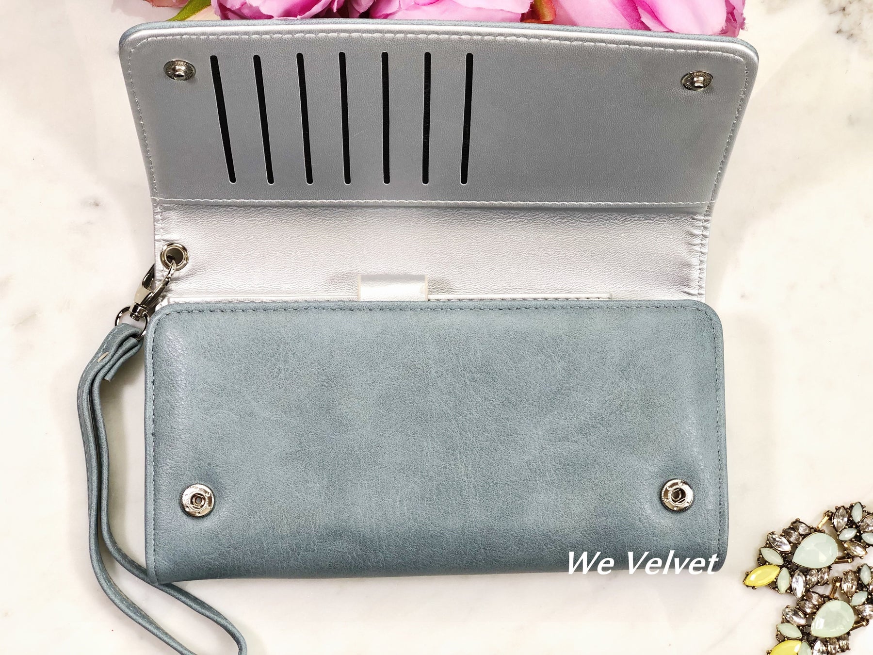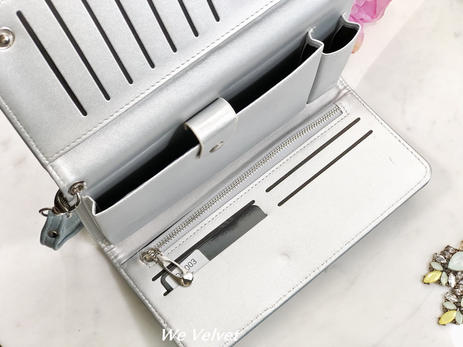 • Dispune de 11 compartimente pentru carduri, 2 compartimente pentru bancnote, un buzunar cu fermoar, un compartiment liber și un compartiment cu capsă.