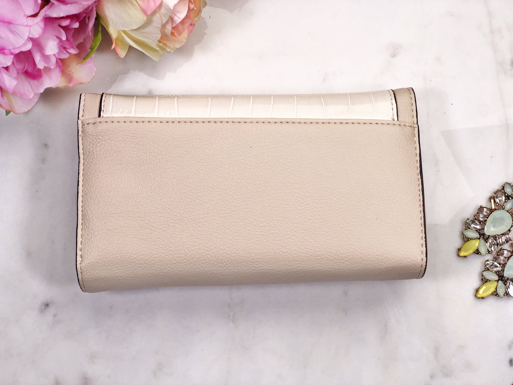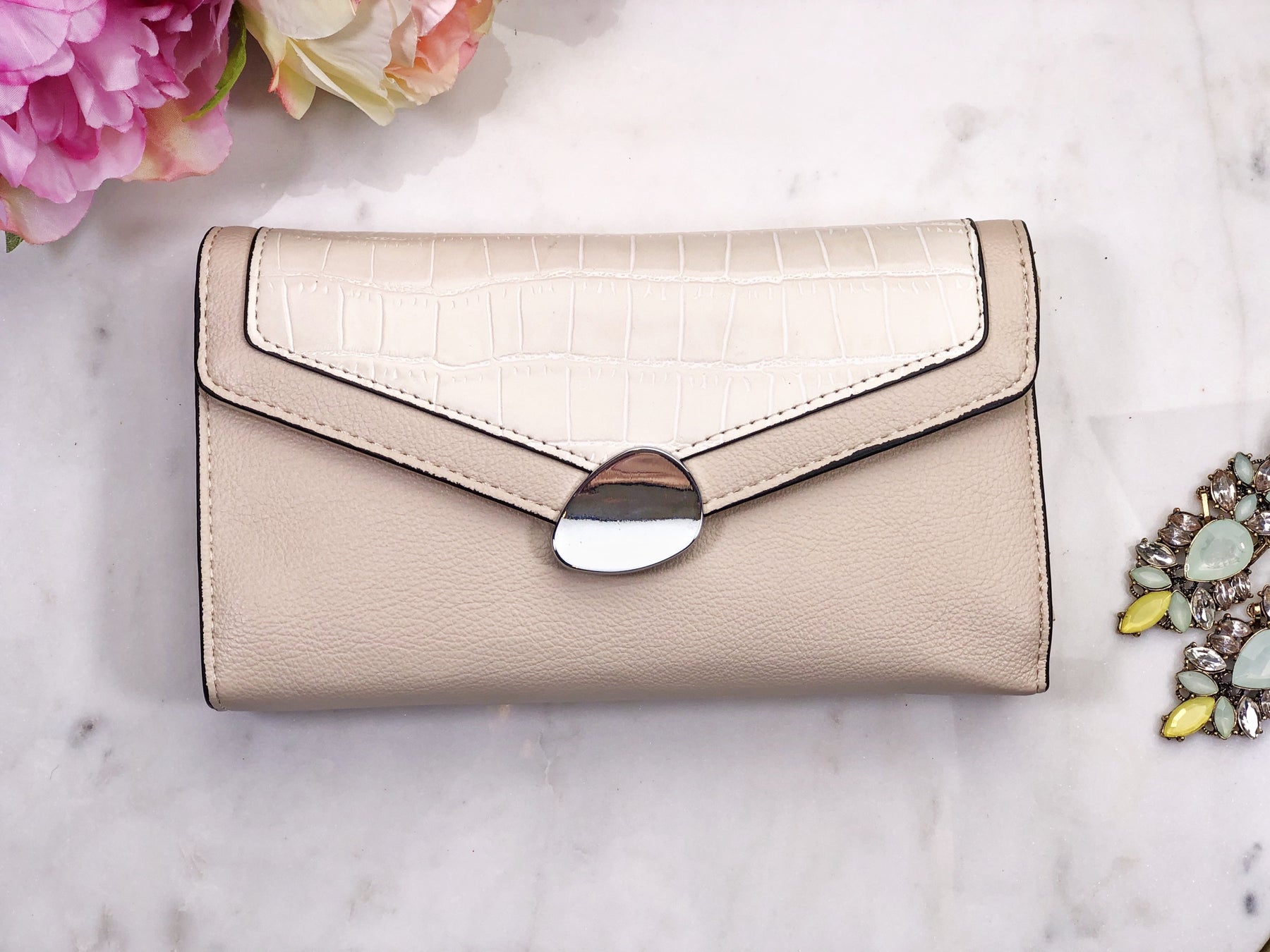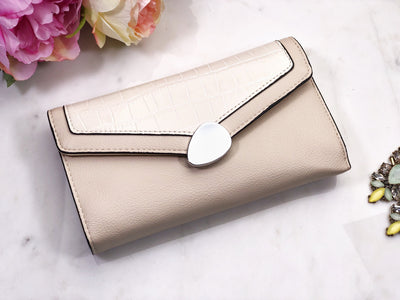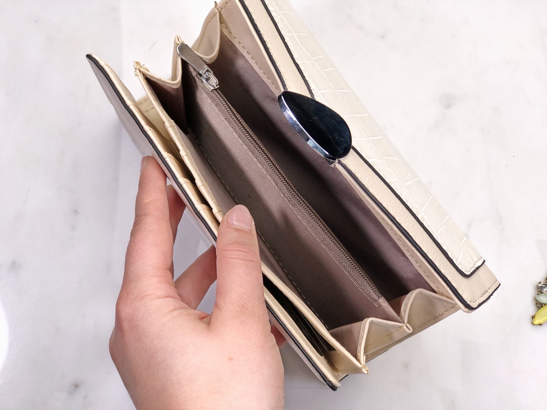 Nici nu ai crede că portofelul Eunice este din piele ecologică! Materialul de cea mai bună calitate îi conferă o textură foarte plăcută la atingere iar finisajele și detaliile fine își vor păstra aspectul mult timp. Contrastul dintre pielea ecologică ușor texturată și cea cu imprimeu croco fac portofelul un accesoriu foarte stilat. În interior vei descoperi o mulțime de compartimente pentru carduri, un buzunar cu fermoar și 2 compartimente libere. Portofelul se închide cu un magnet mascat de un accesoriu metallic.