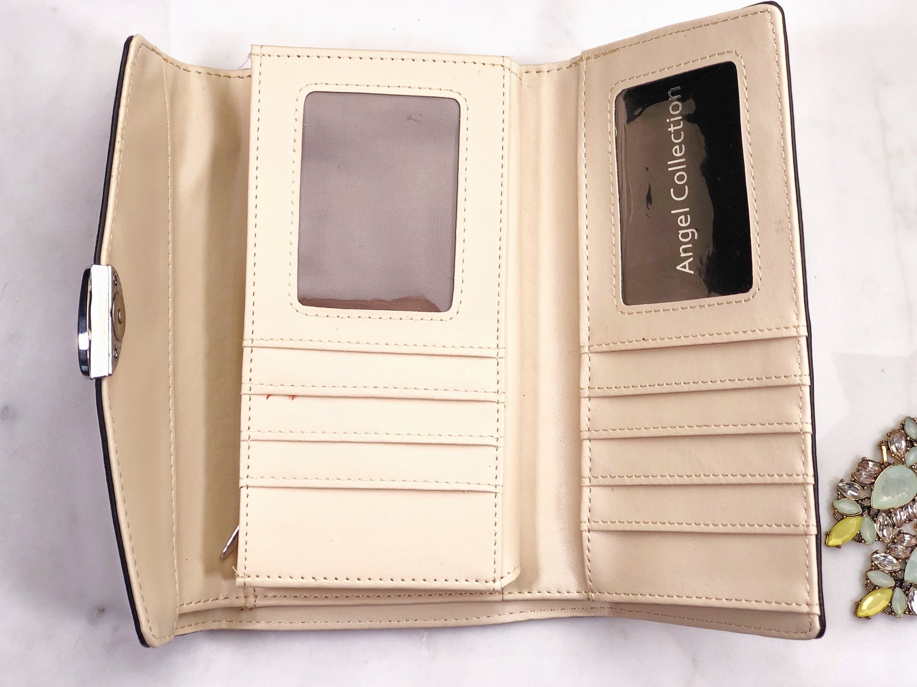 - La interior dispune de 9 compartimente pentru carduri, 4 compartimente pentru bancnote și documente și un compartiment cu fermoar pentru monede