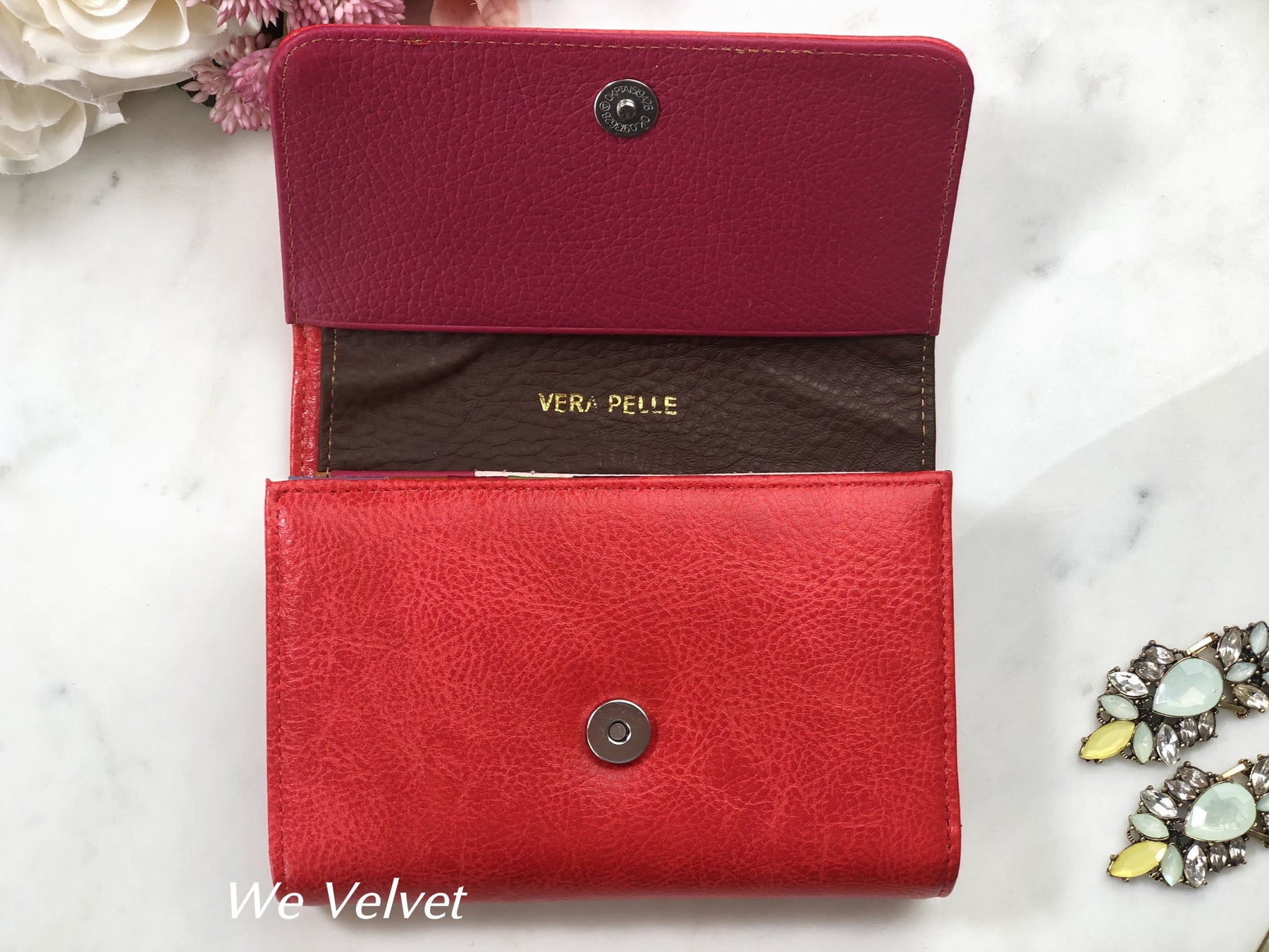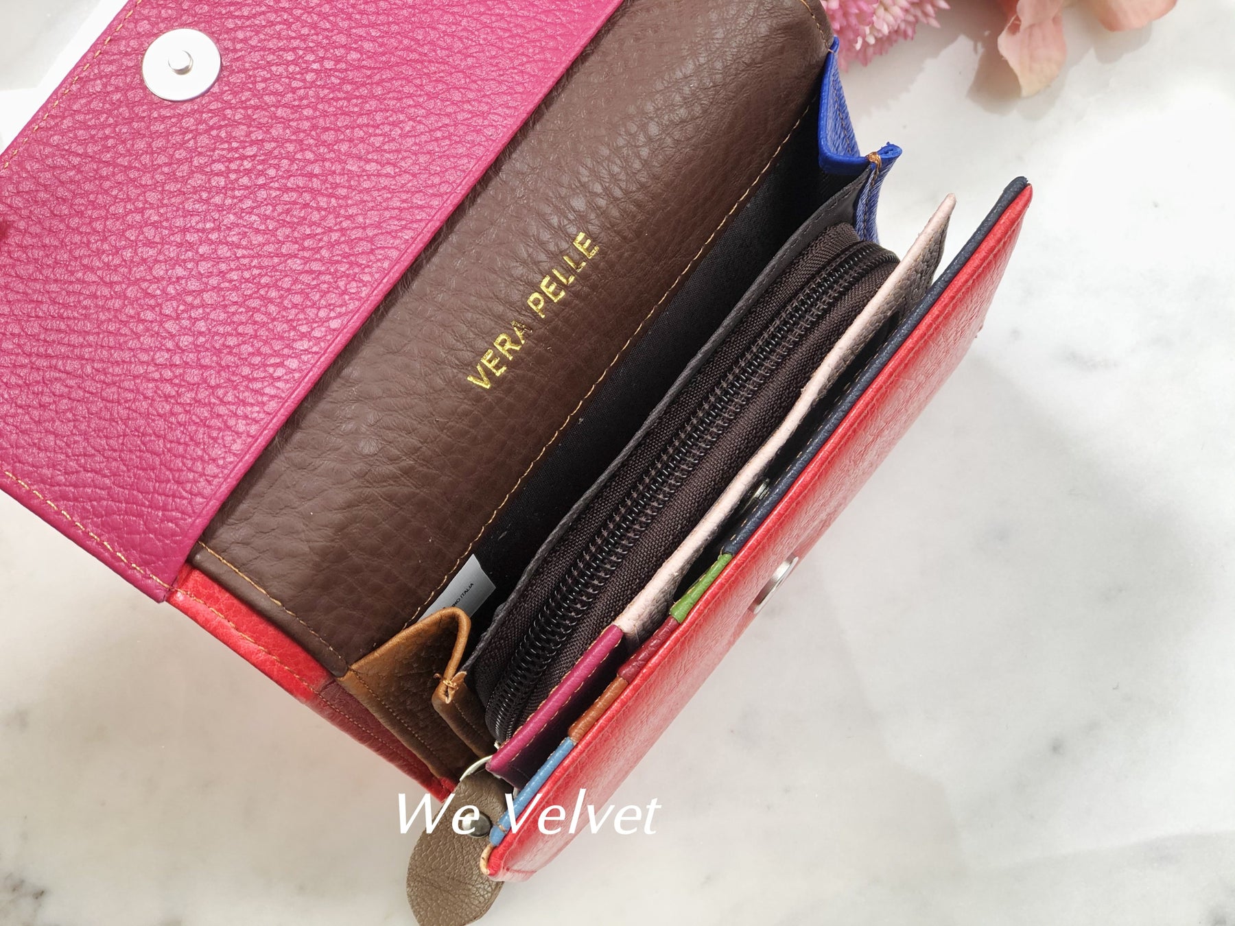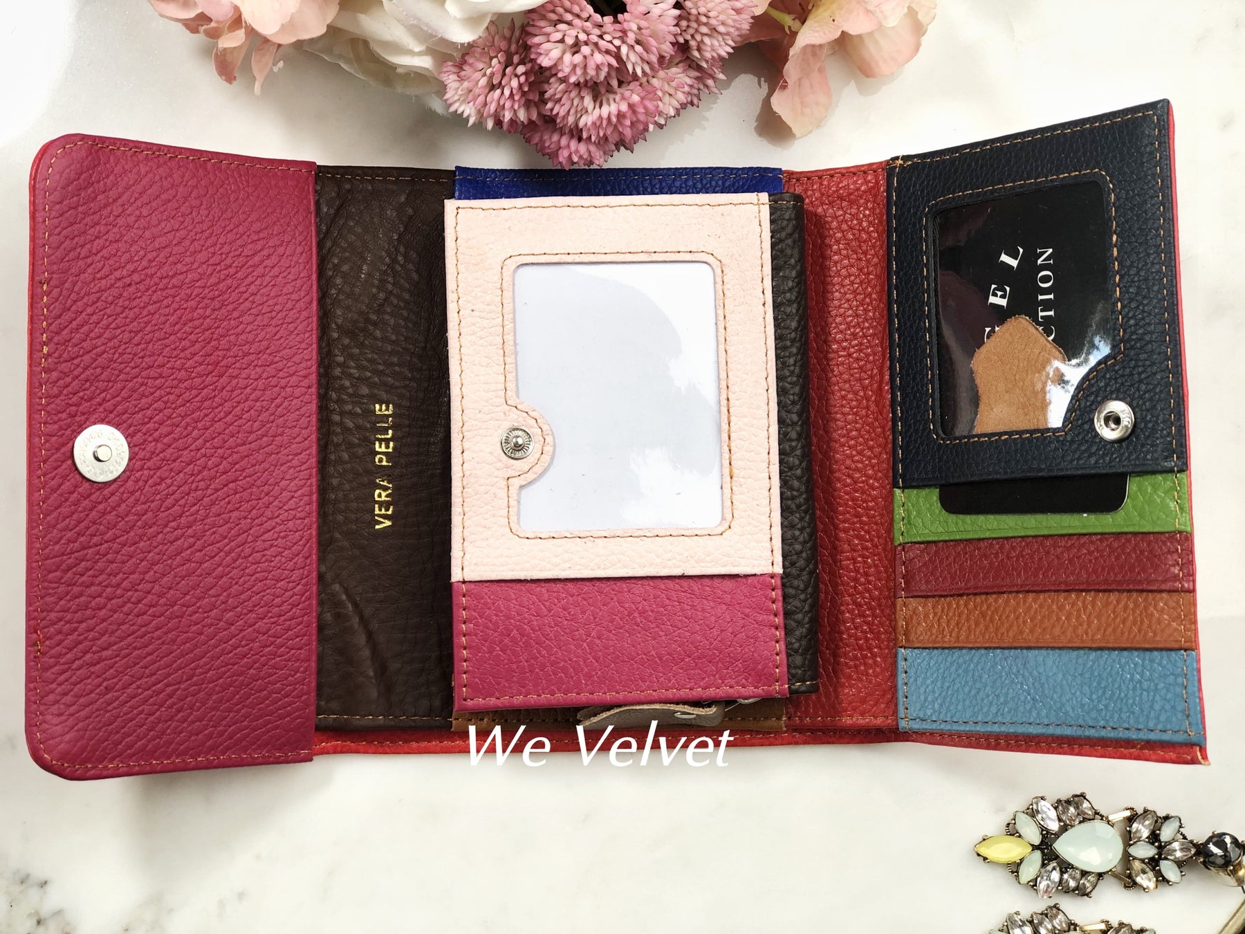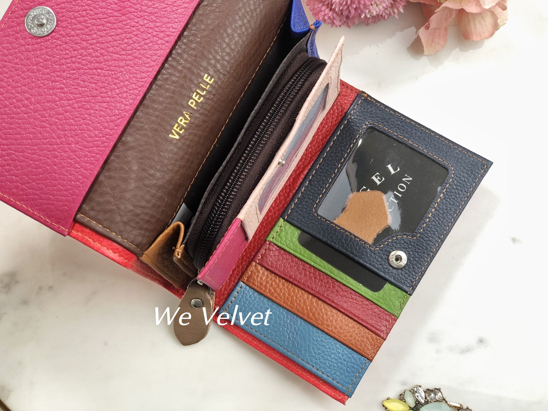 - La interior dispune de 5 compartimente pentru carduri, 3 compartimente libere pentru bancnote și documente și un buzunar cu fermoar
