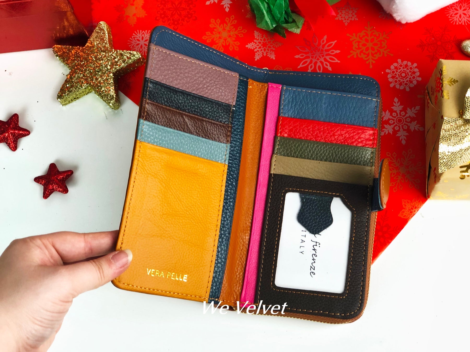- La interior dispune de 16 compartimente pentru carduri, 6 compartimente pentru documente, 4 compartimente pentru bancnote și un buzunar cu fermoar pentru monede