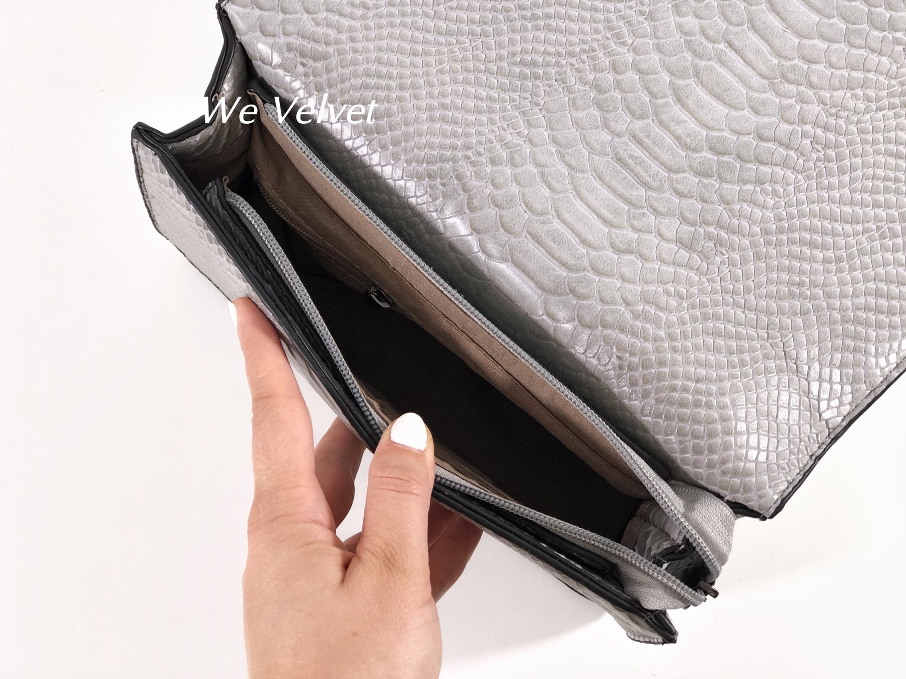 • La interior dispune de un compartiment spațios, un buzunar cu fermoar și un buzunar fără fermoar