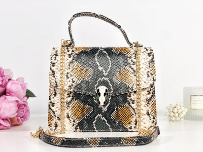 Geantă albă piele eco cu print snake gri și caramel Kora Ly