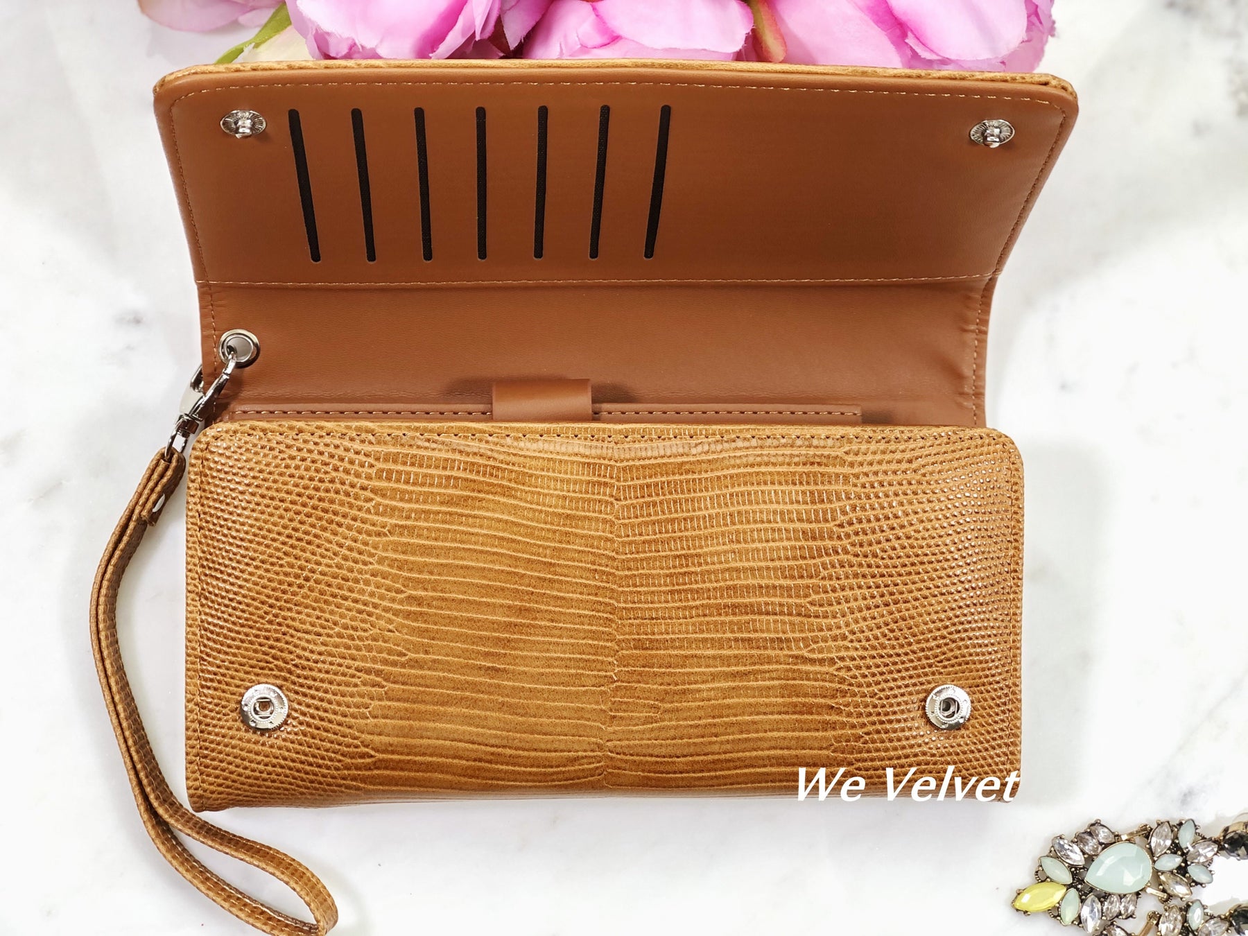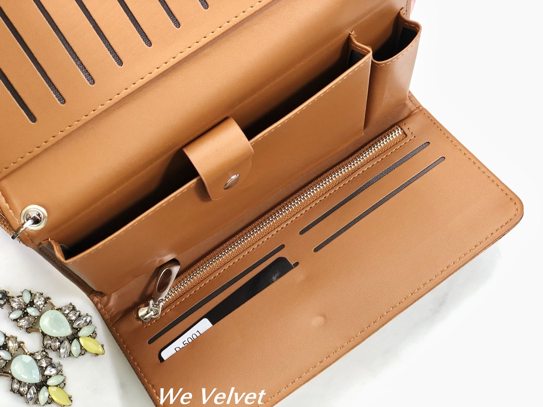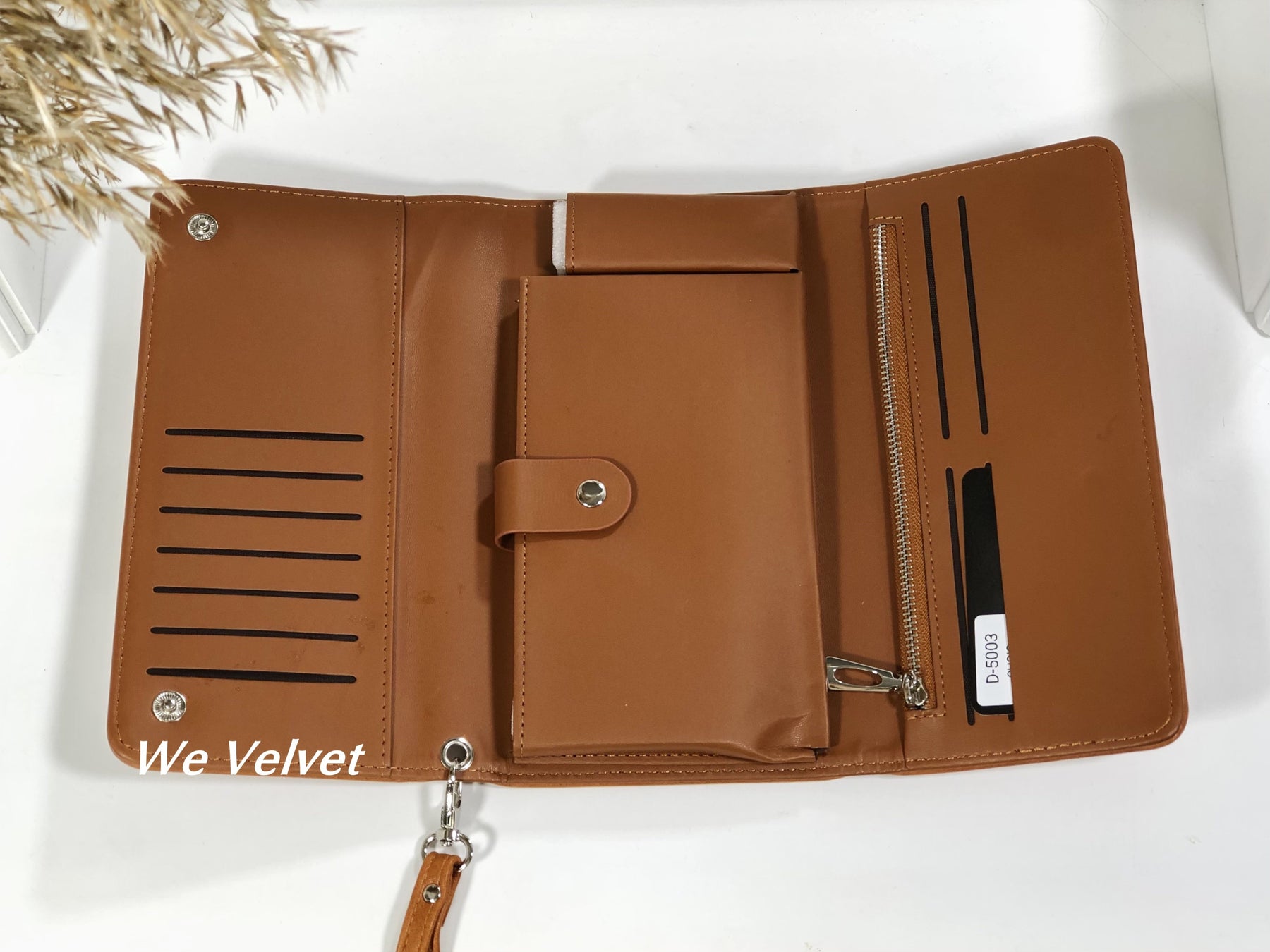 • Dispune de 11 compartimente pentru carduri, 2 compartimente pentru bancnote, un buzunar cu fermoar, un compartiment liber și un compartiment cu capsă.