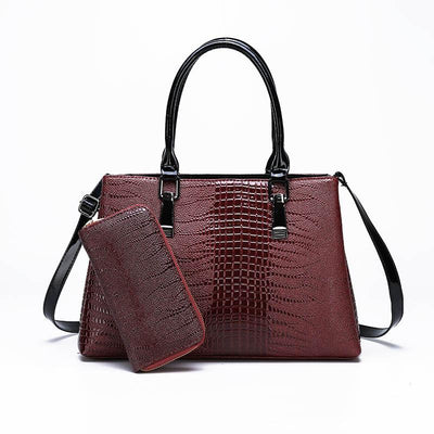 Set geantă burgundy piele eco lăcuită cu imprimeu croco și portofel Norma