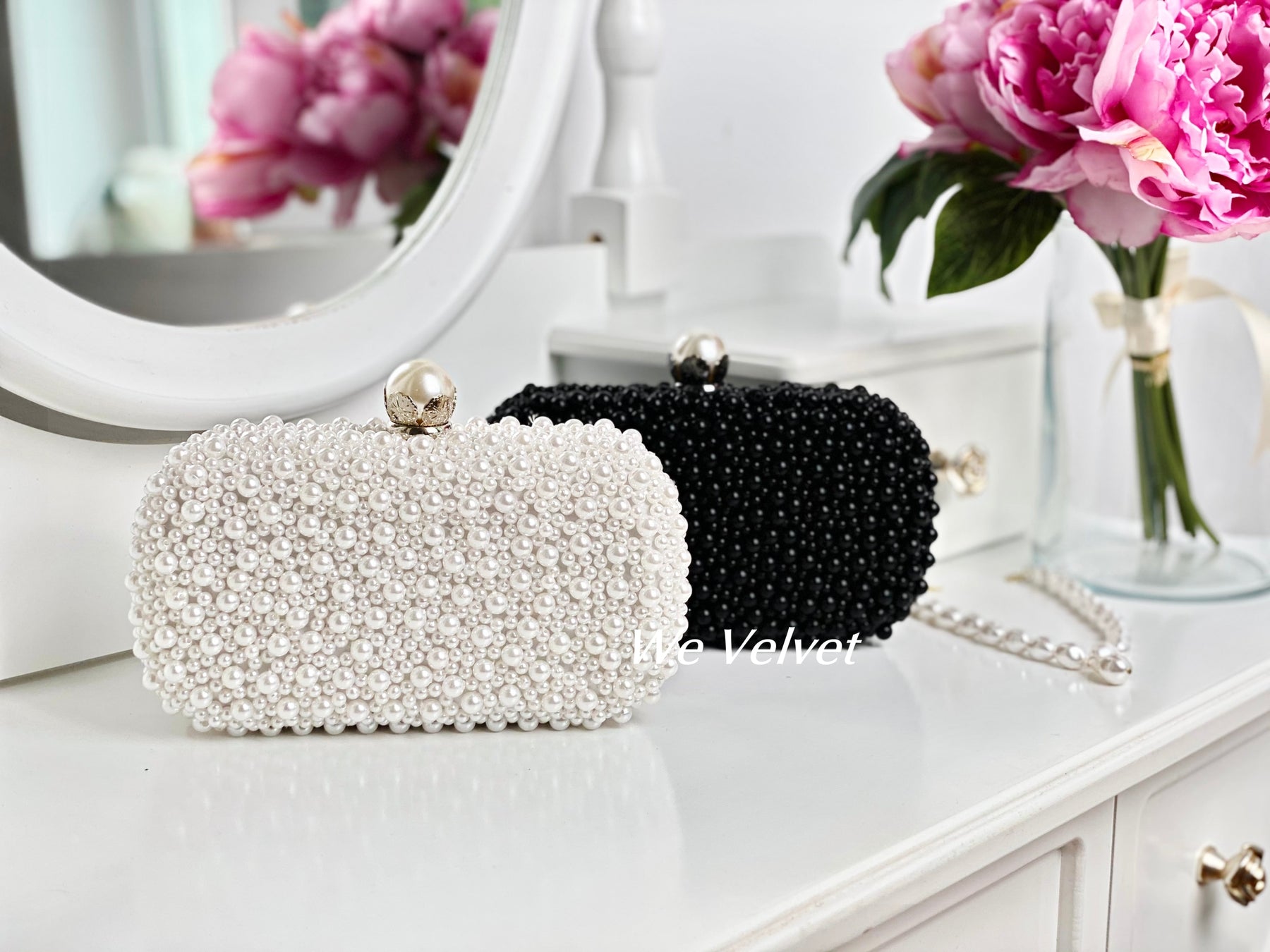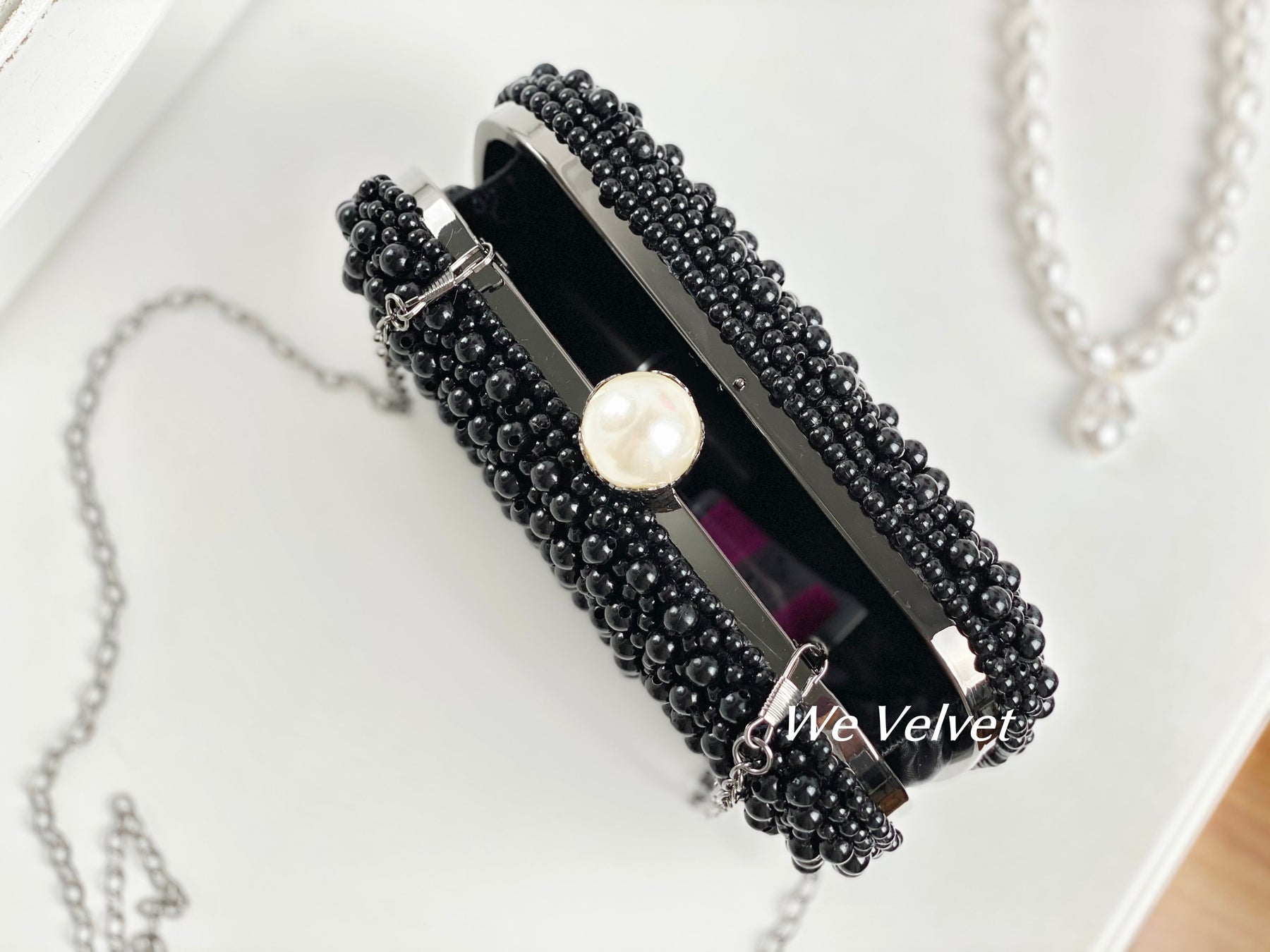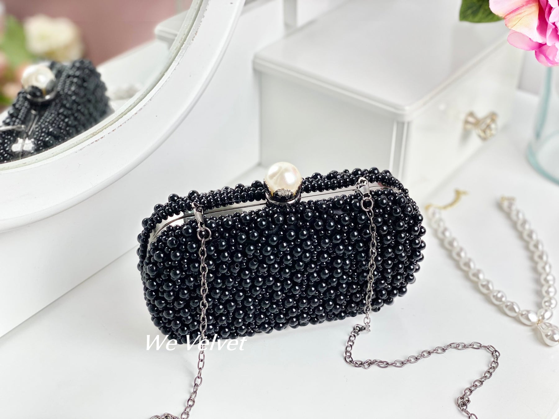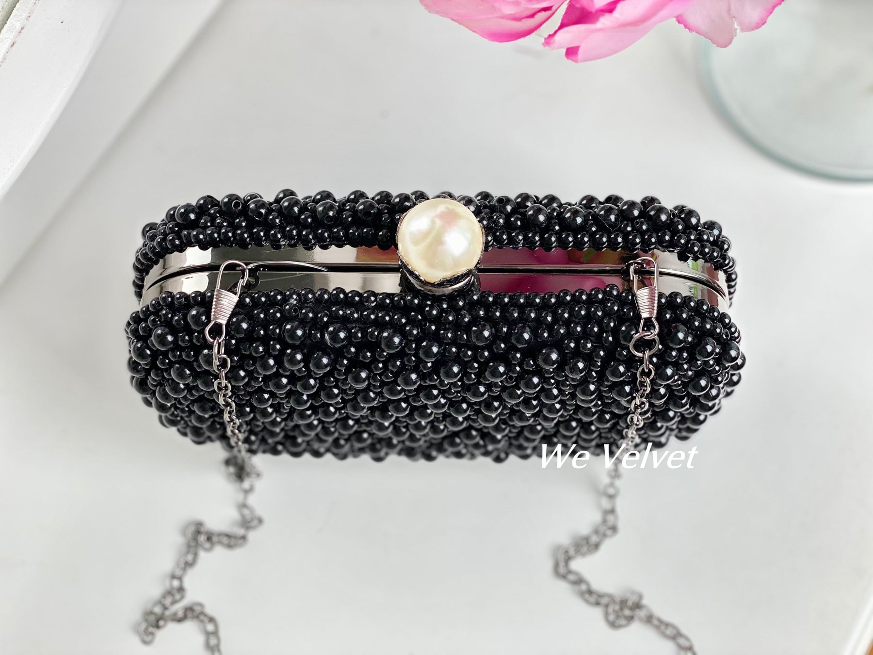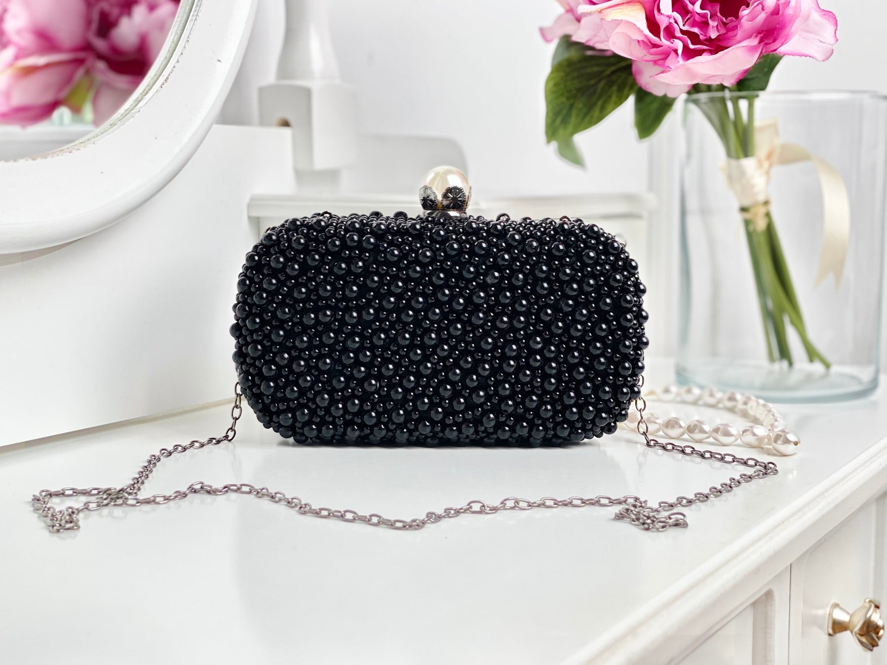 O geantă elegantă, tip clutch, perfectă pentru orice ocazie specială din viața ta! Este decorată cu perluțe finuțe ce îți vor scoate în evidență toate ținutele!