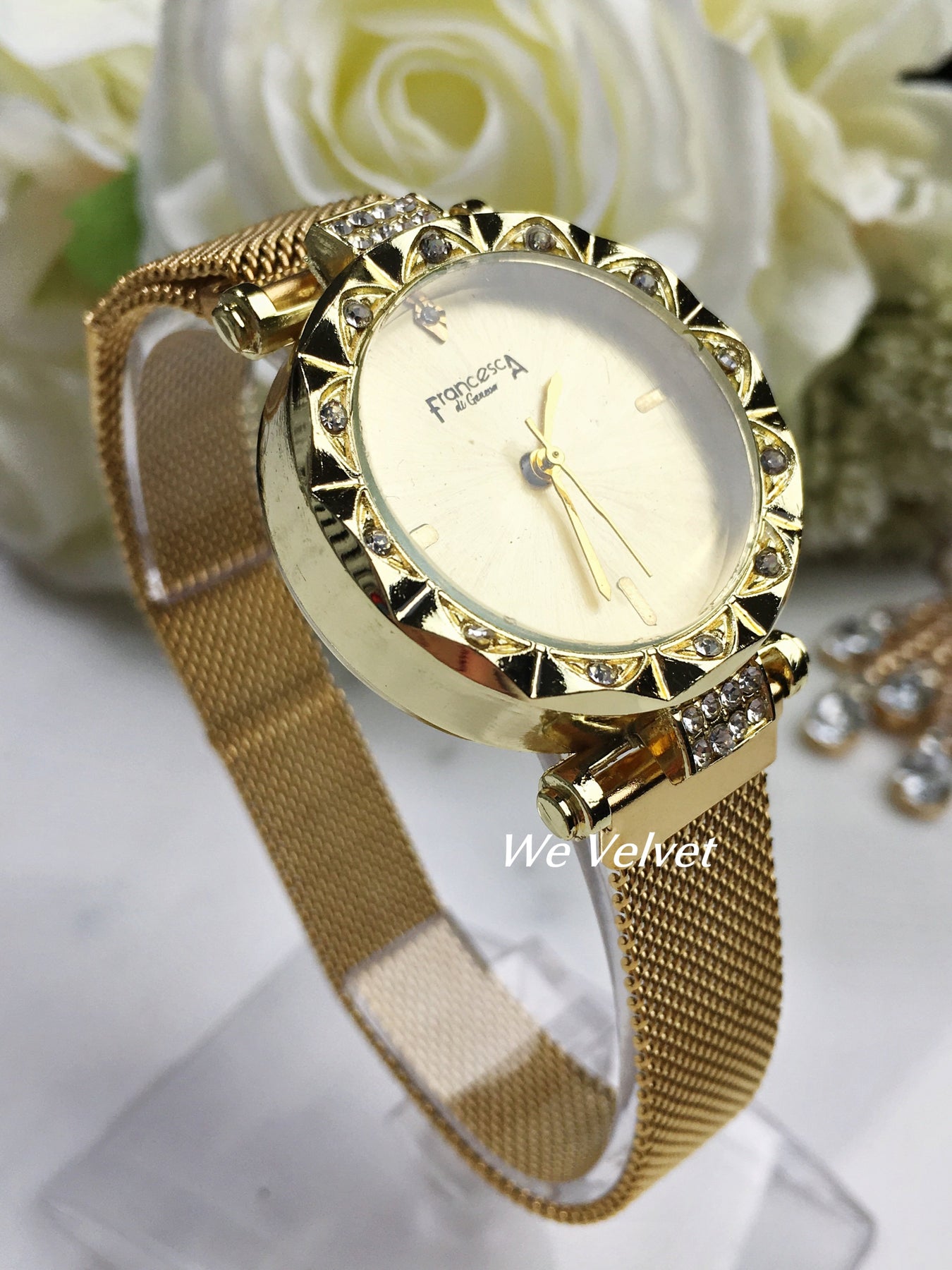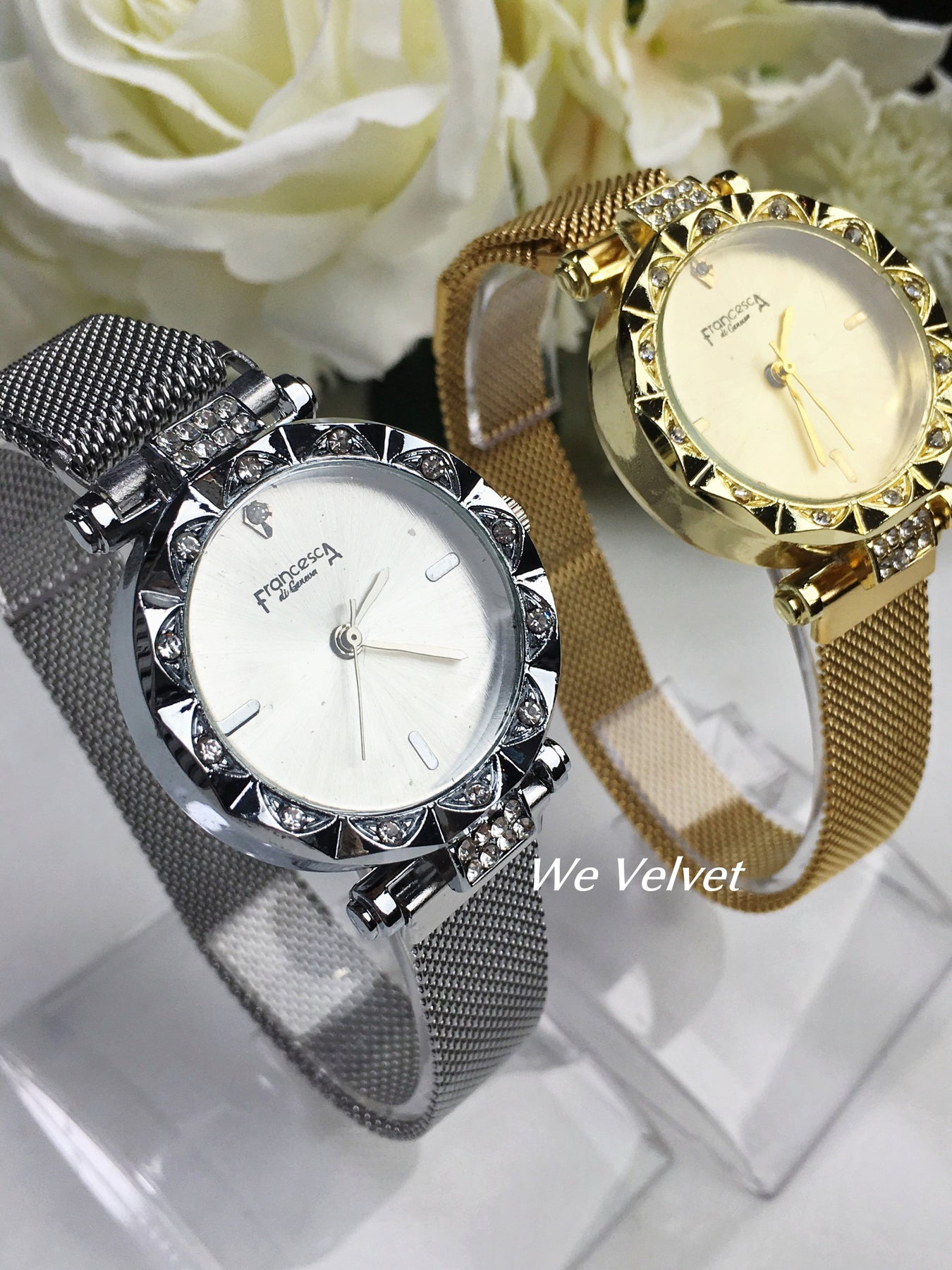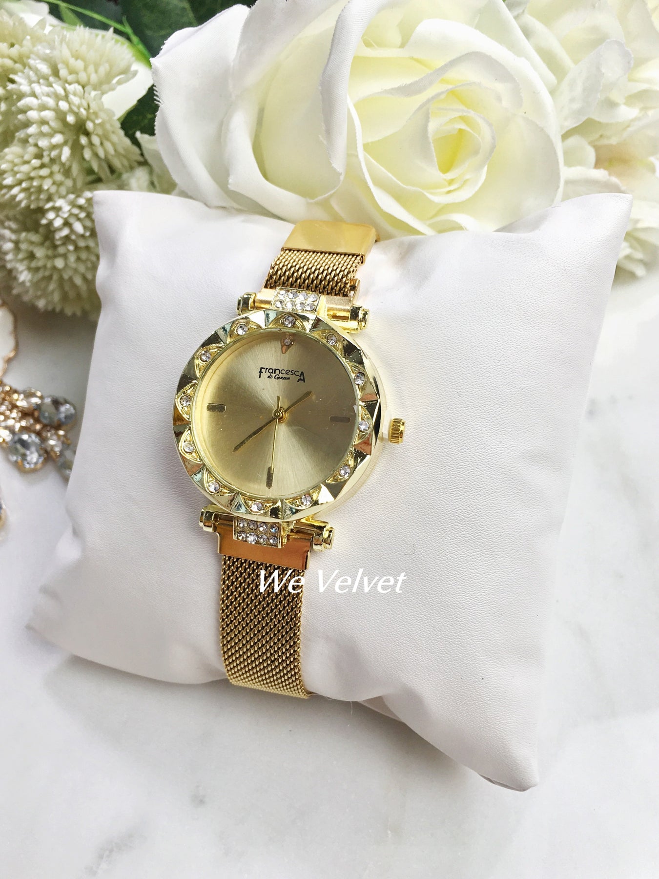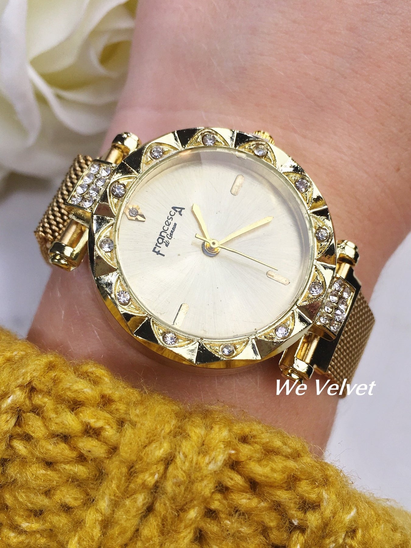 Acest inedit ceas este perfect pentru orice tip de ținută, reușind să adauge un plus de strălucire și farmec lookului tau. La exterior este de corat cu pietricele strălucitoare.