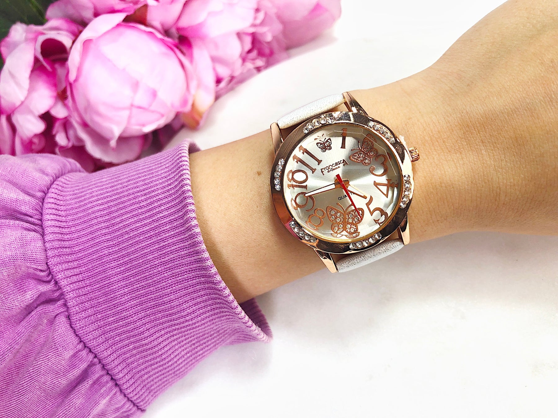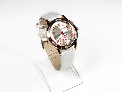 Un ceas feminin, decorat cu fluturași drăgălași și o curea silver sidefată.