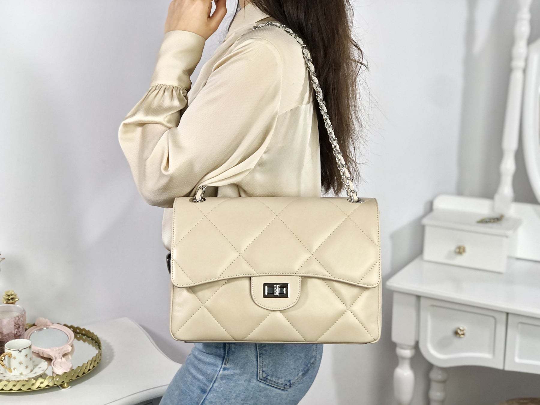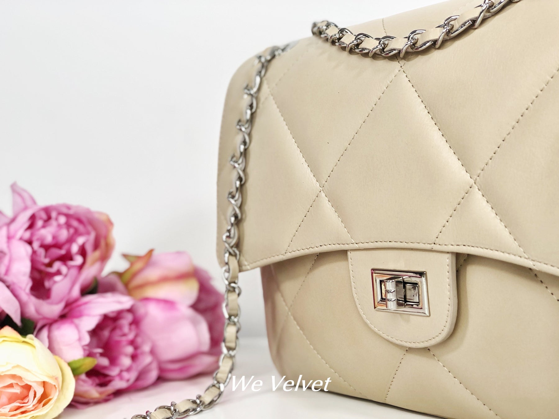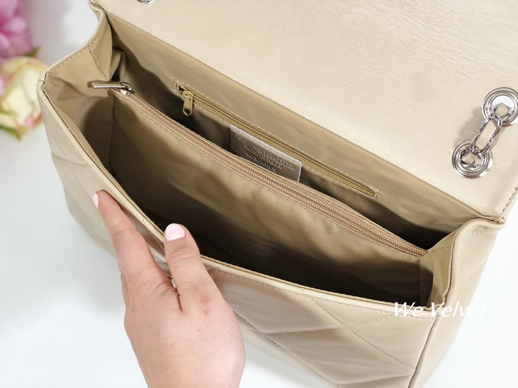 Un accesoriu ca o atingere tandră, cu finisaje delicate și accesorii metalice feminine. Gentuța este confecționată integral din piele naturală, cu model geometric, atent brodat cu o cusătură fină. Deși compactă, geanta dispune de un interior foarte încăpător dotat cu două compartimente cu fermoar și două compartimente libere. Poate fi purtată pe umăr, cross body sau pe braț cu bareta din piele naturală împletită cu un lănțisor metalic foarte rezistent.