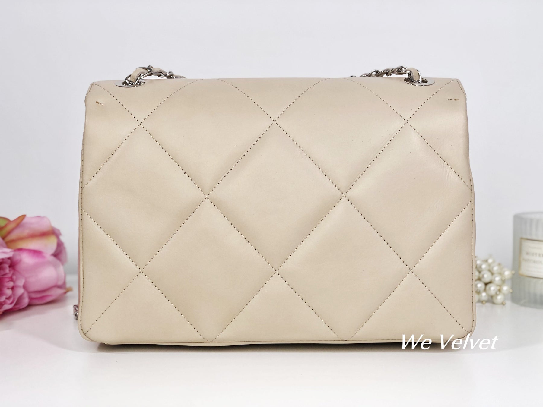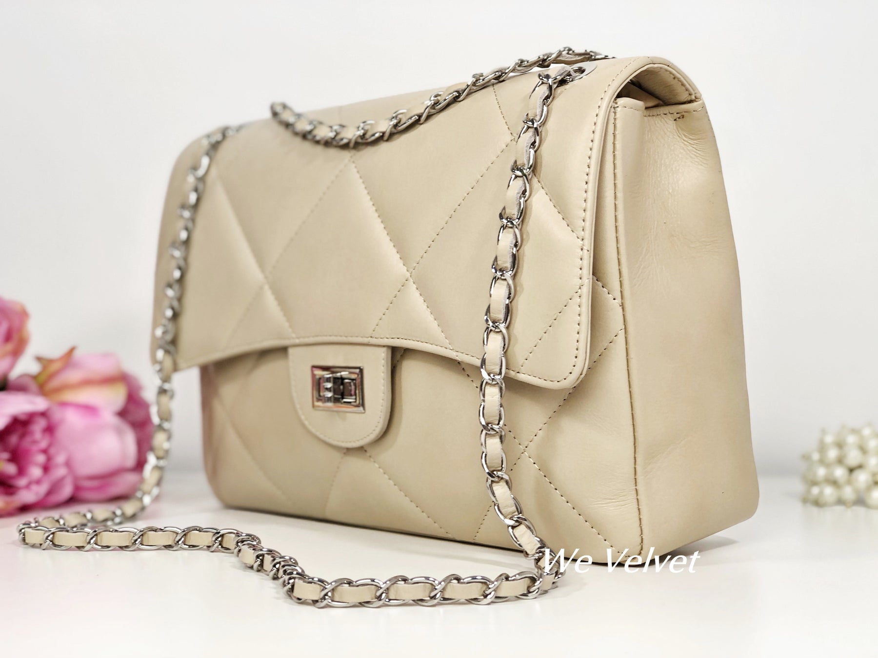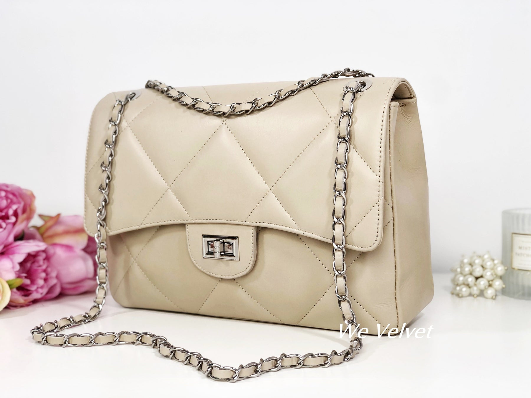 Un accesoriu ca o atingere tandră, cu finisaje delicate și accesorii metalice feminine. Gentuța este confecționată integral din piele naturală, cu model geometric, atent brodat cu o cusătură fină. Deși compactă, geanta dispune de un interior foarte încăpător dotat cu două compartimente cu fermoar și două compartimente libere. Poate fi purtată pe umăr, cross body sau pe braț cu bareta din piele naturală împletită cu un lănțisor metalic foarte rezistent.
