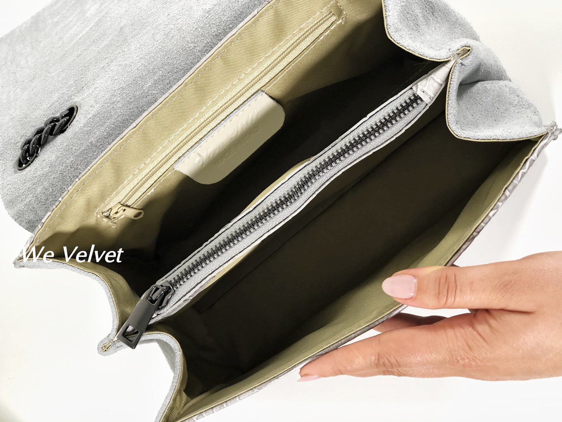 - La interior dispune de 2 compartimente spațjoase despărțite printr-un buzunar cu fermoar, și un alt buzunar cu fermoar mai micuț