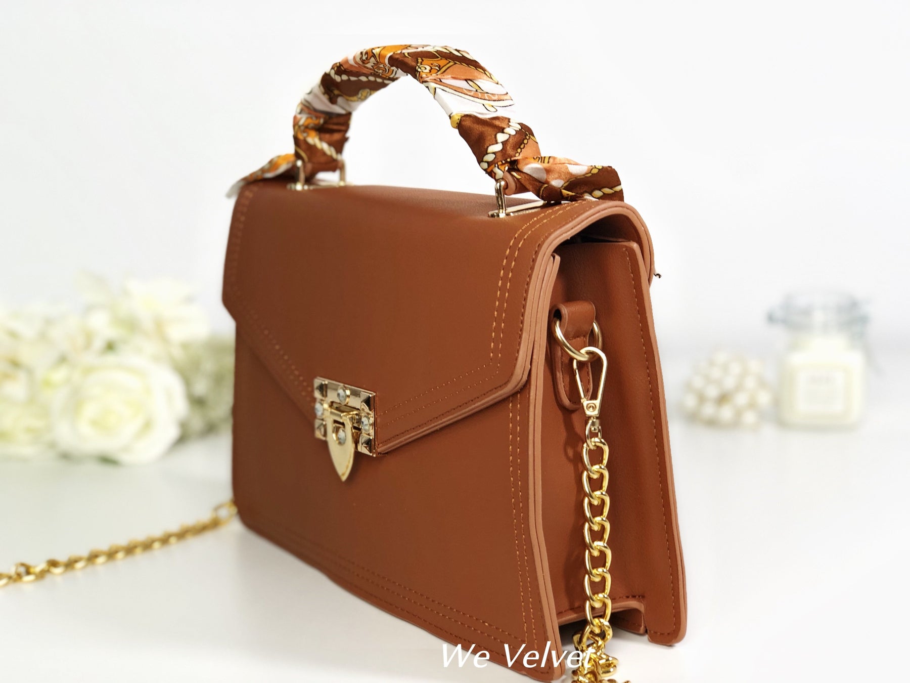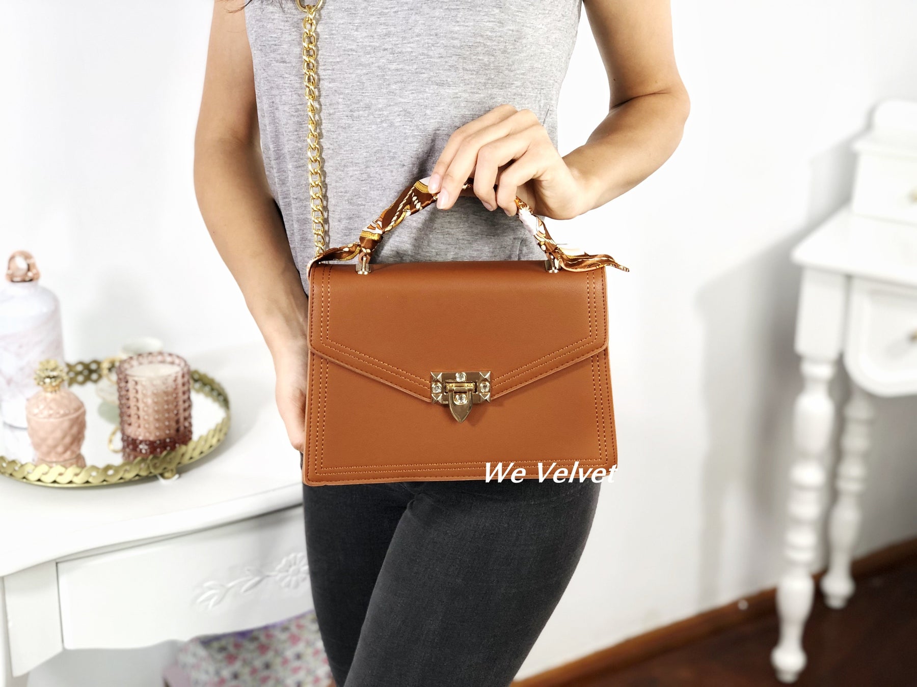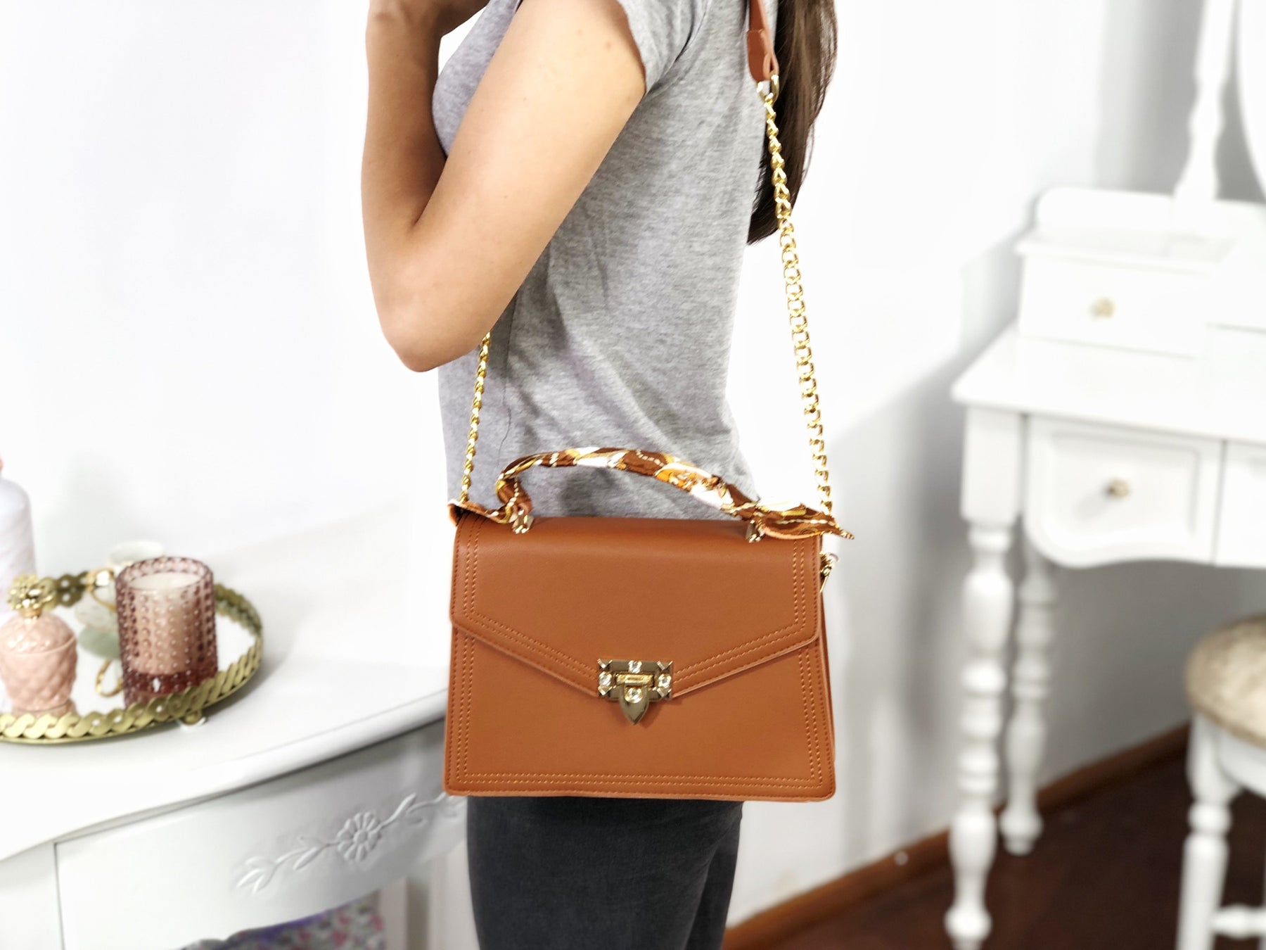 Este un model cochet, feminin și extrem de versatil. Îl poți purta atât cu ținute de tip casual cât și office, pentru un plus de stil și eleganță. Mânerul este decorat cu o superbă eșarfă ce îi oferă un look aparte, iar tu vei arăta demențial!