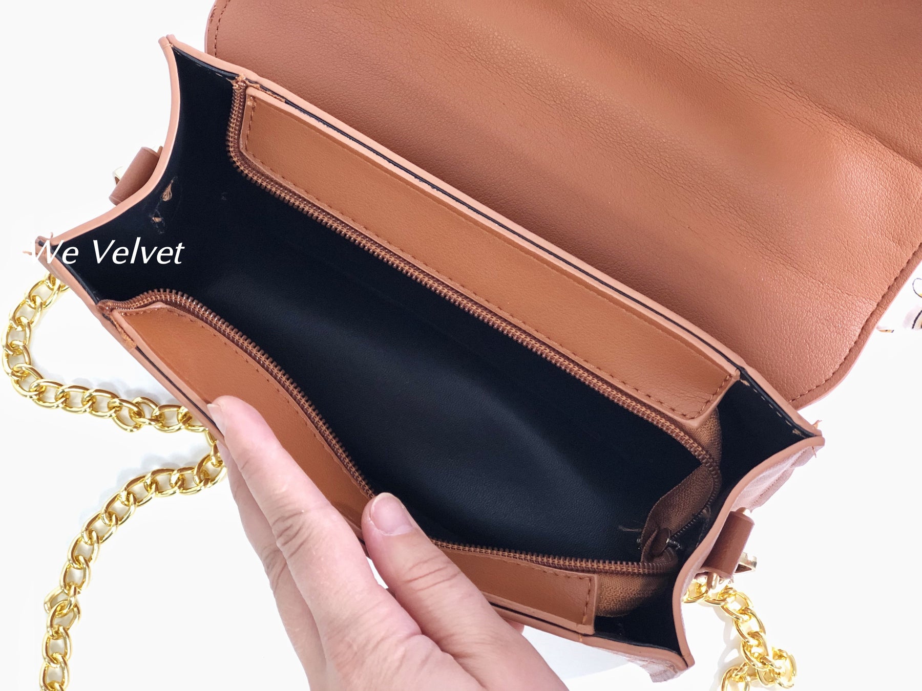 - La interior dispune de un compartiment spațios, un buzunar cu fermoar și un buzunar fără fermoar