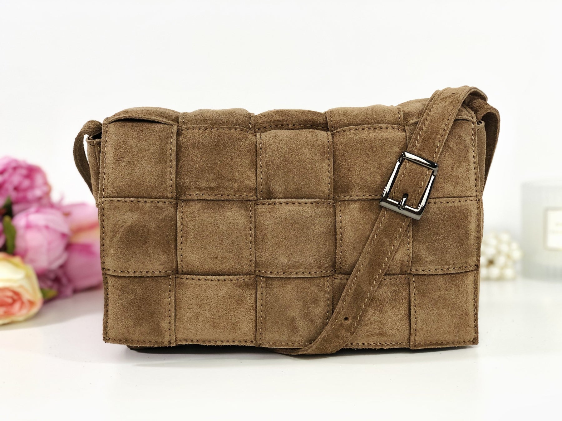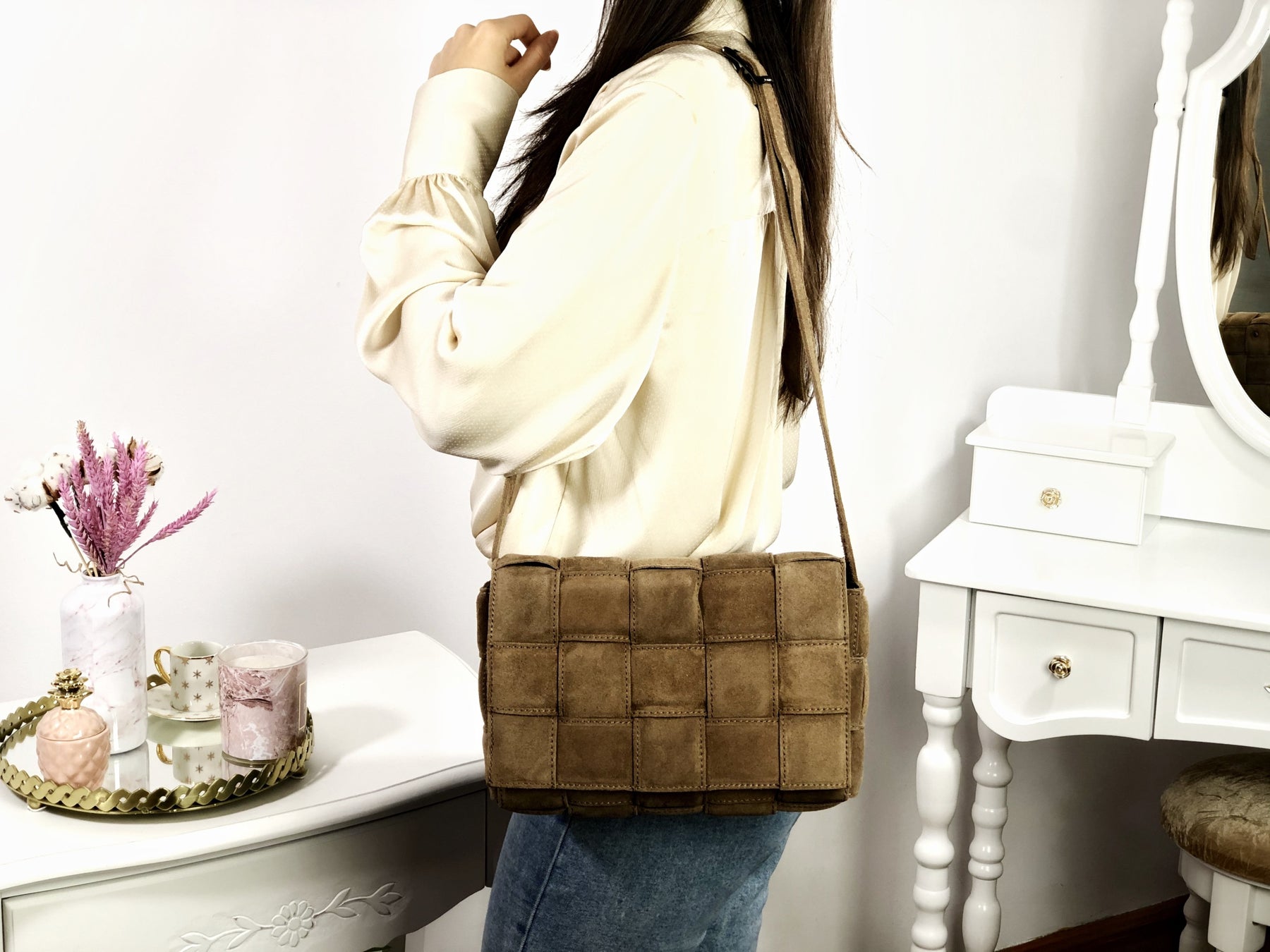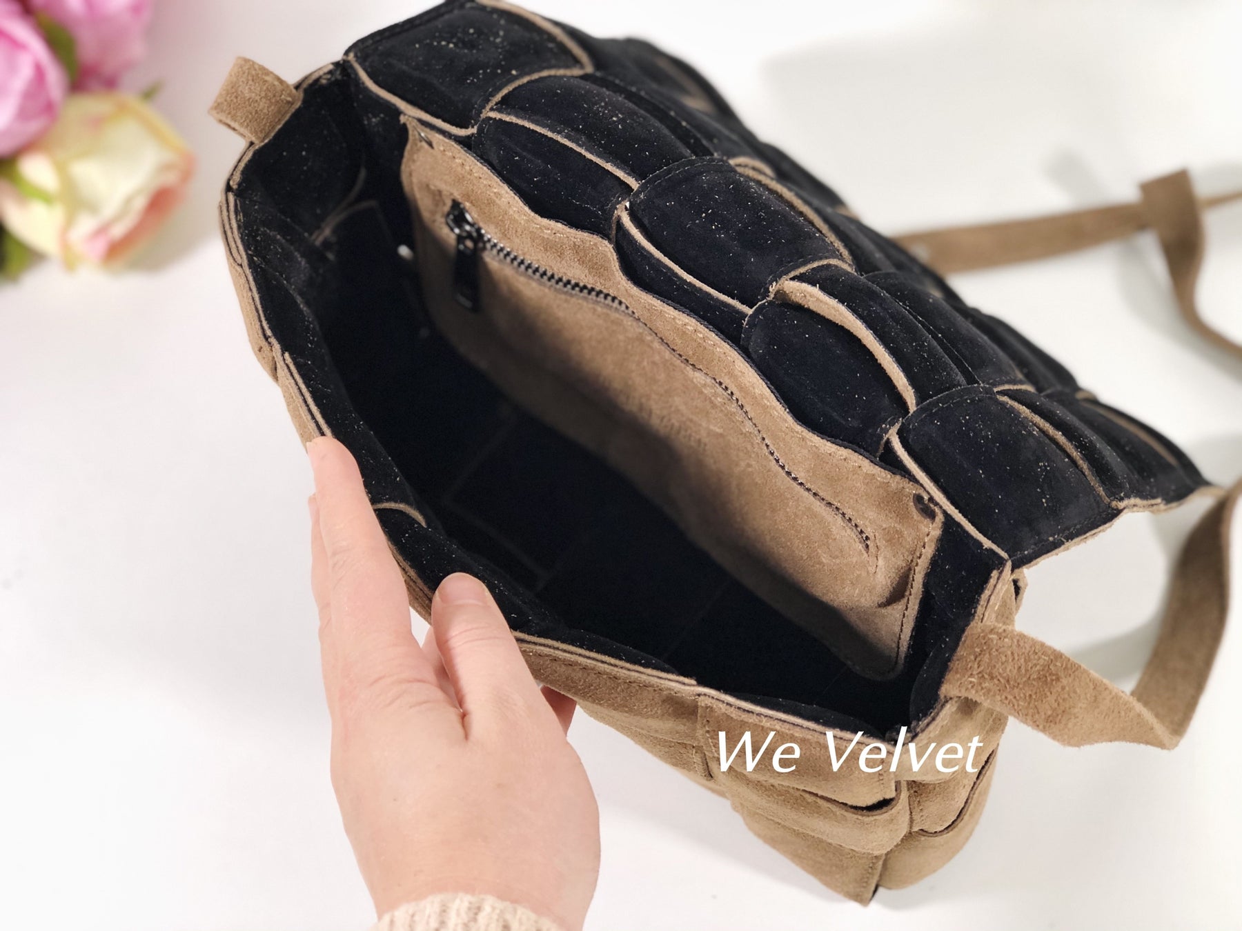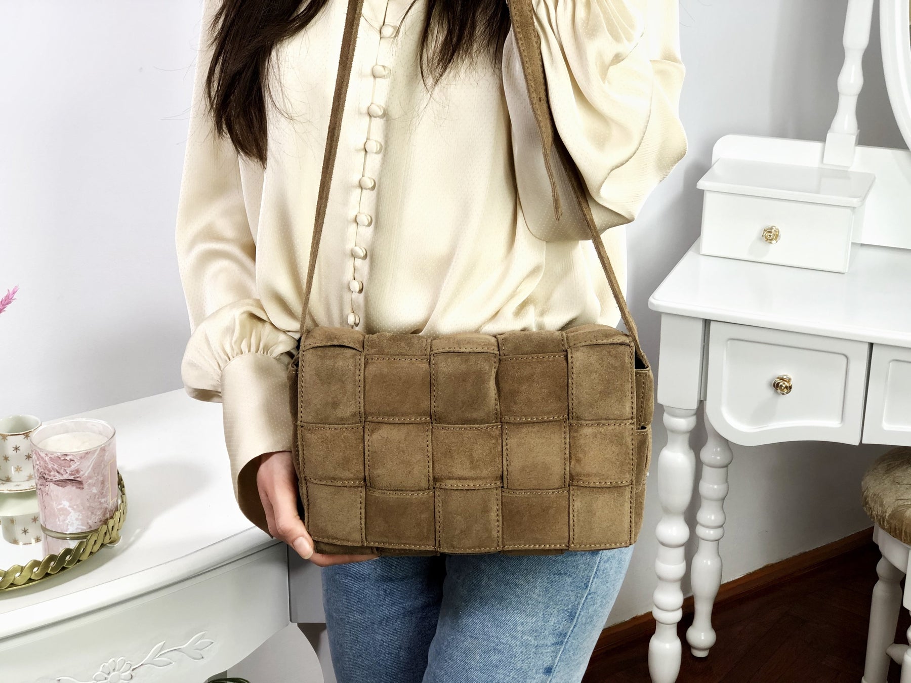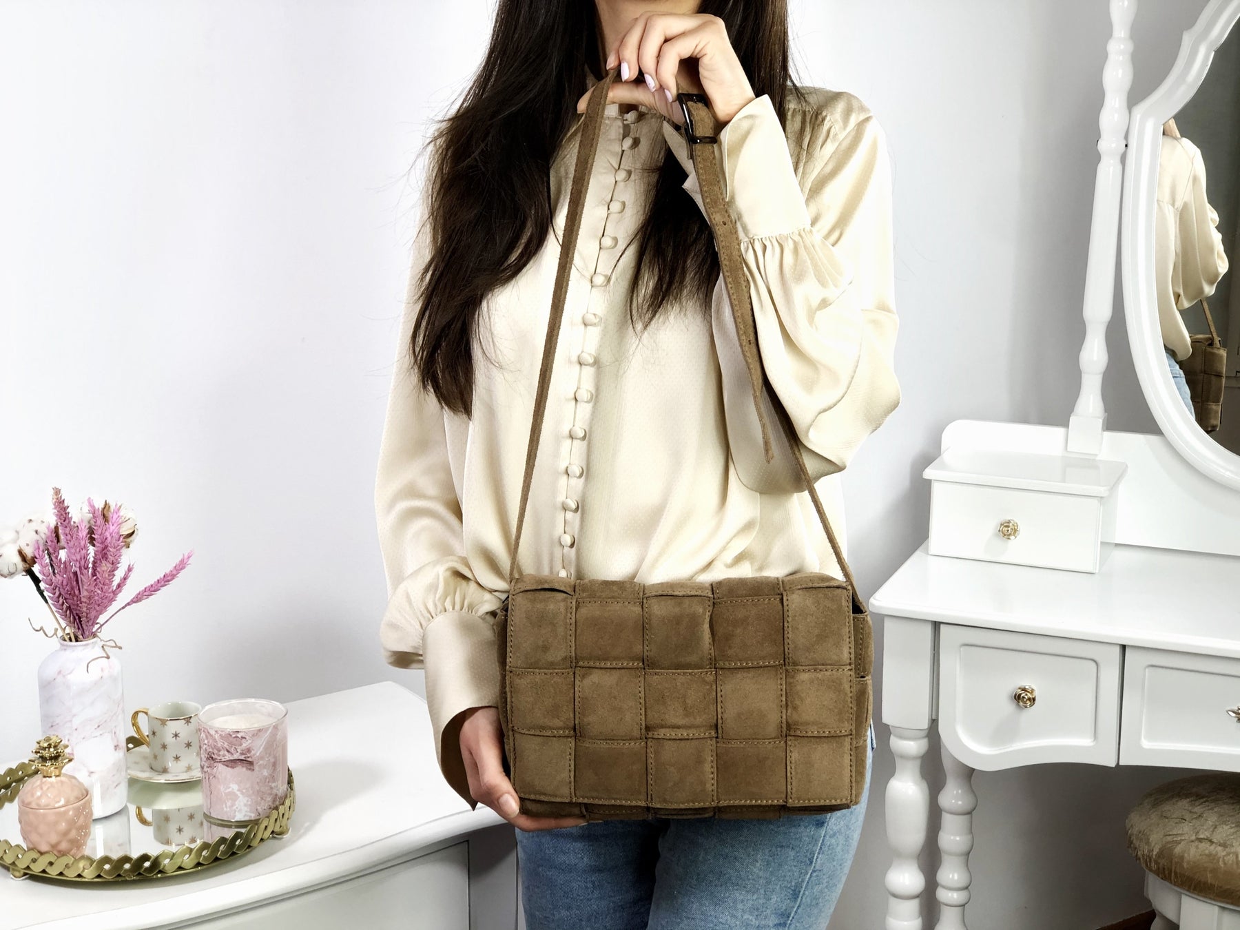 Frumusețea autentică și materialul 100% natural fac din această gentuță un accesoriu demn de o regalitate. Pielea întoarsă este recunoscută pentru rezistența și pentru textura sa catifelată ce oferă senzația atingerii unui nor pufos. Geanta este confecționată din piele naturală matlasată și dispune de un buzunar liber și un buzunar mic, cu fermoar. Barte apentru umăr este confecționată din același material și este reglabilă.