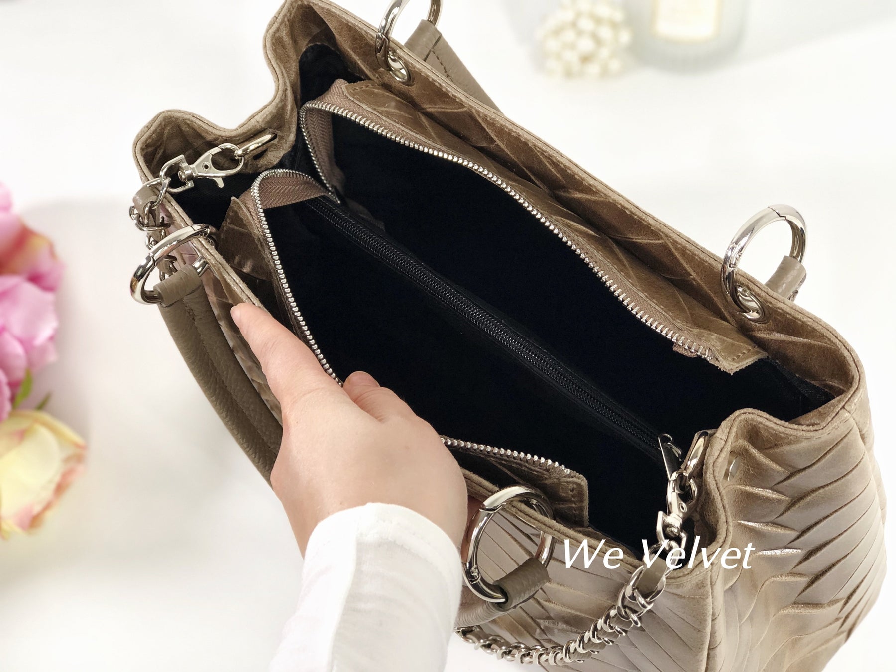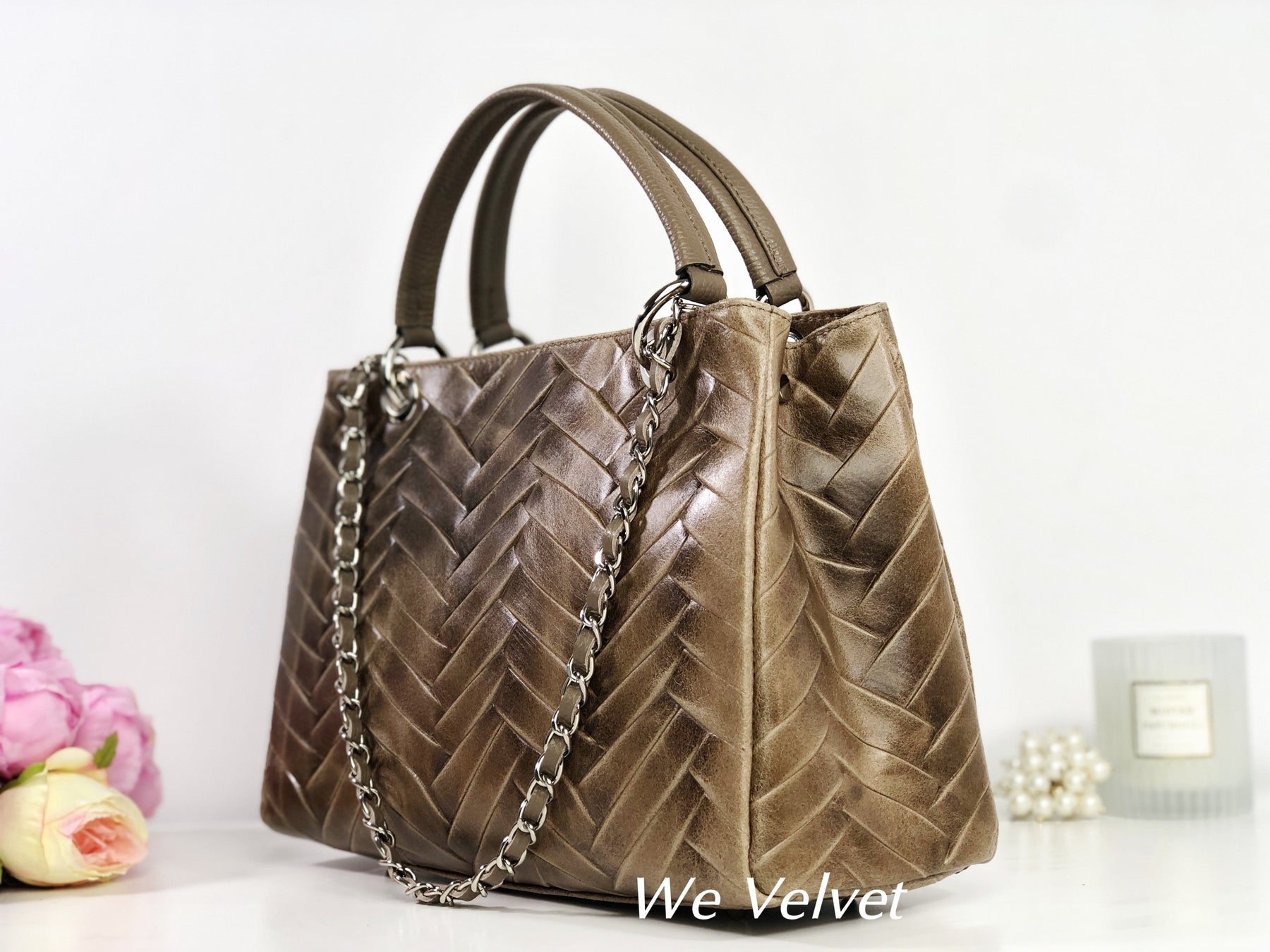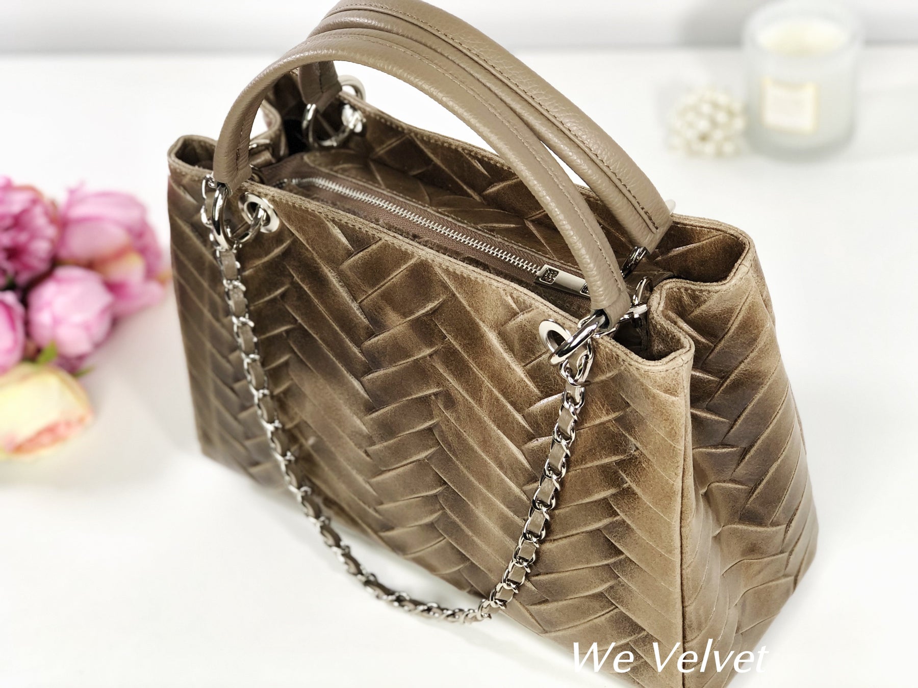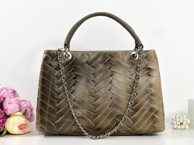 Confecționată dintr-o piele naturală de cea mai bună calitate, își va păstra strălucirea în timp, chiar și peste ani. Modelul ce se aseamănă cu o împletitură diafană va asigura o notă feminină oricărei ținute, iar mânerul de mână, foarte rezistent, va asigura o purtare confortabilă. Gentuța se închide cu un fermoar, iar la interior prezintă două buzunare cu fermoar și două compartimente libere.