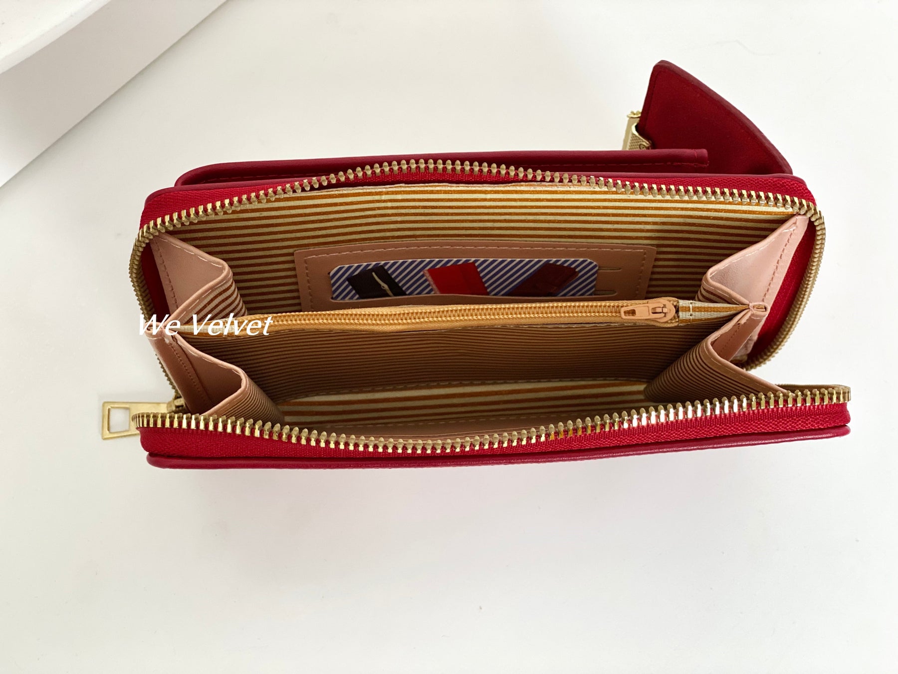 • Dispune de 4 compartimente pentru carduri, 2 compartimente pentru bancnote și documente și un buzunar cu fermoar pentru monede