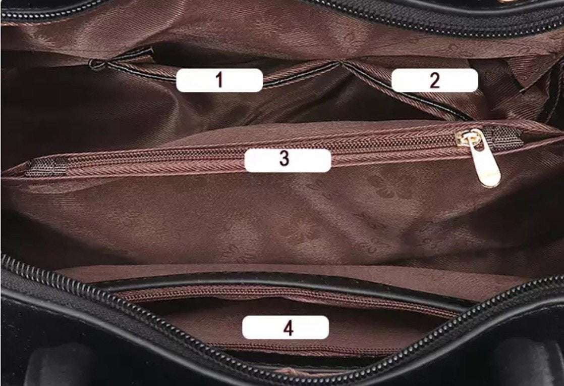 - În interior, geanta are două compartimente spațioase, despărțite de un buzunar cu fermoar, precum și două buzunare suplimentare, cu fermoar, pentru lucrurile de preț.