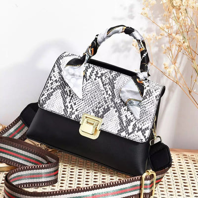 Mult stil și feminitate cu gentuța Mallory! Nuanțele calde și modelul snake print se asortează ușor iar eșarfa cadou aduce un strop de culoare în orice ținută!