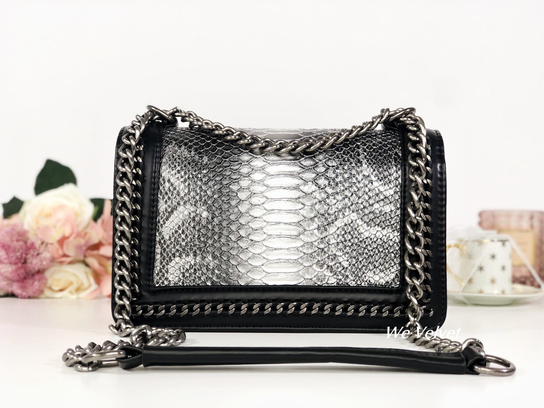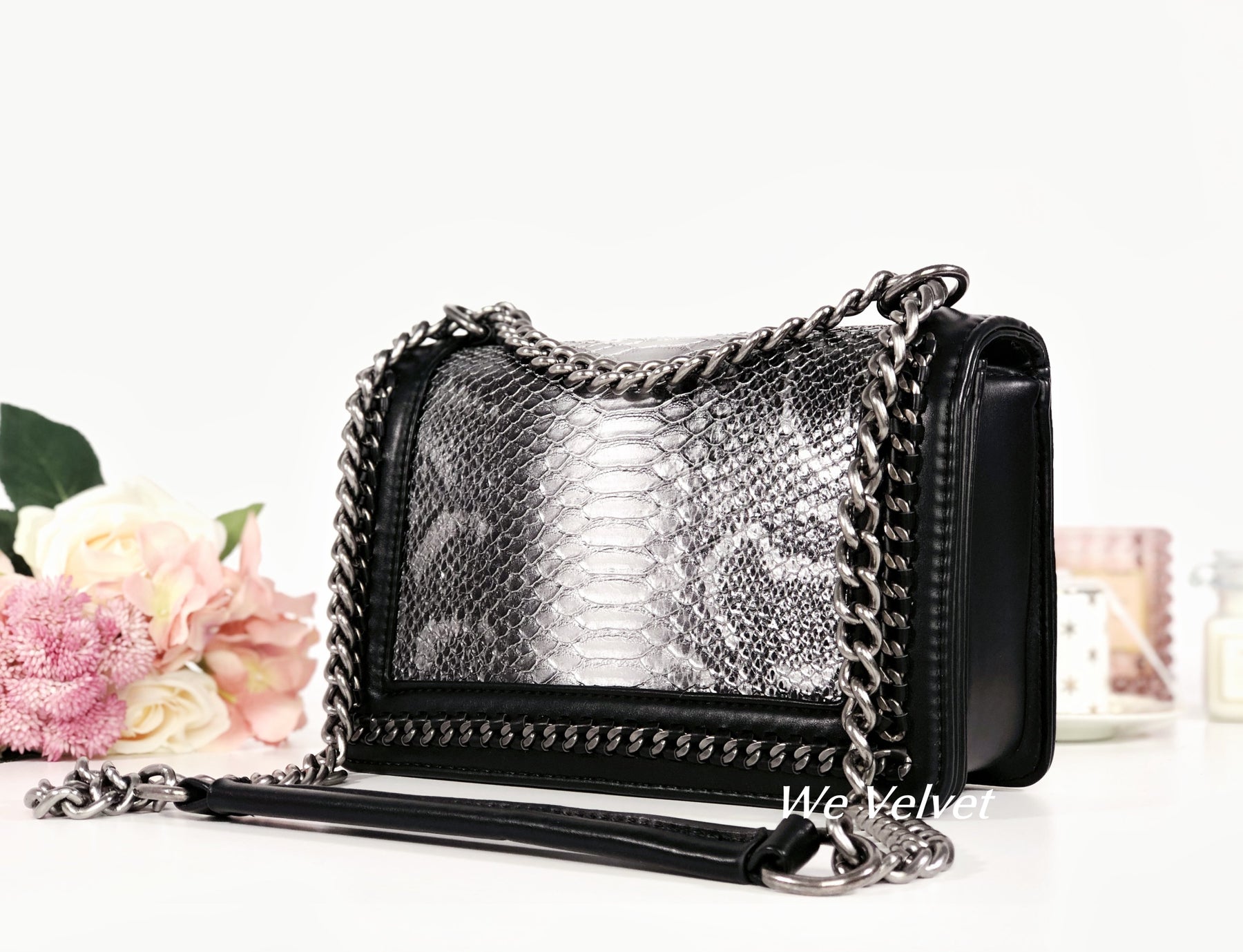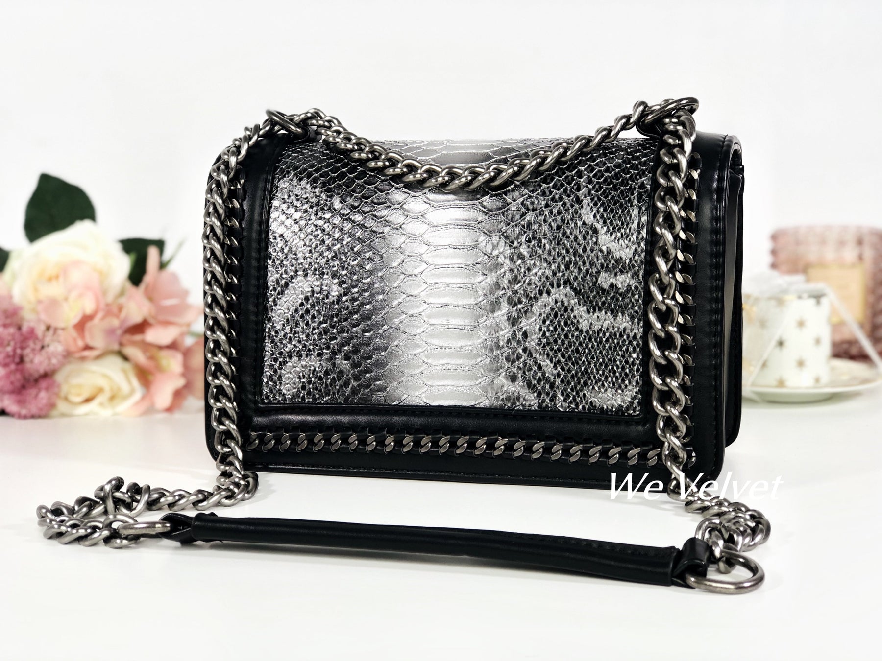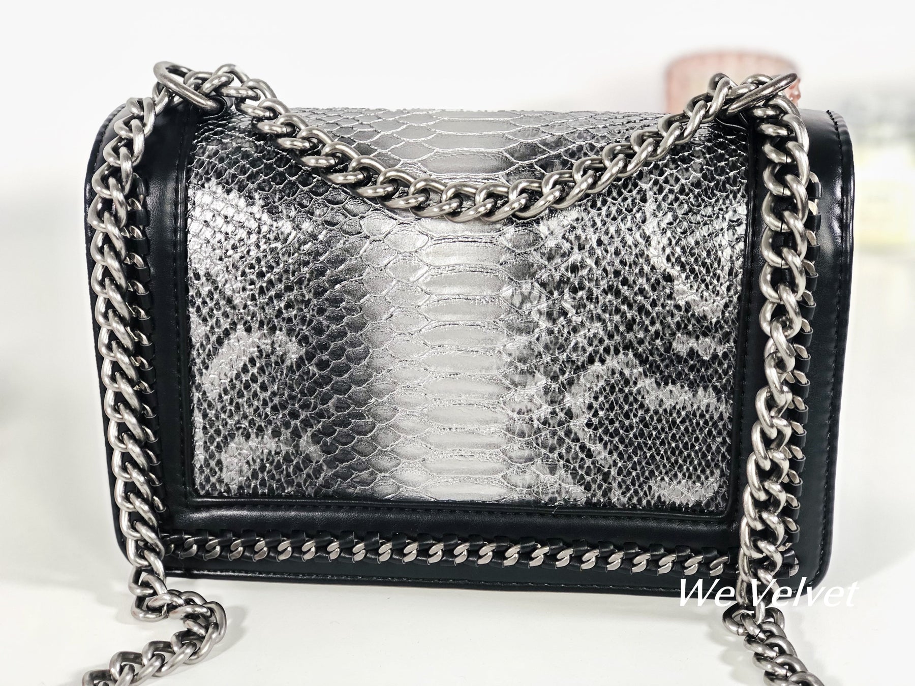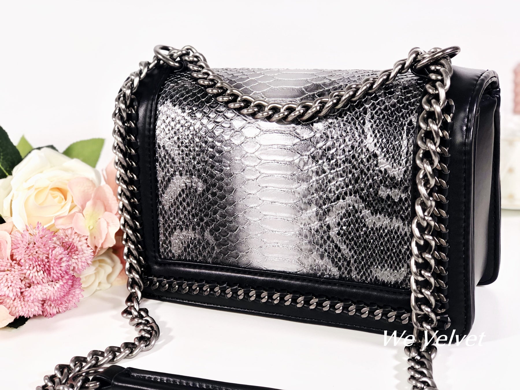 - Geanta se poate purta pe umăr sau crossbody cu ajutorul lanţului cu care este prevăzută.