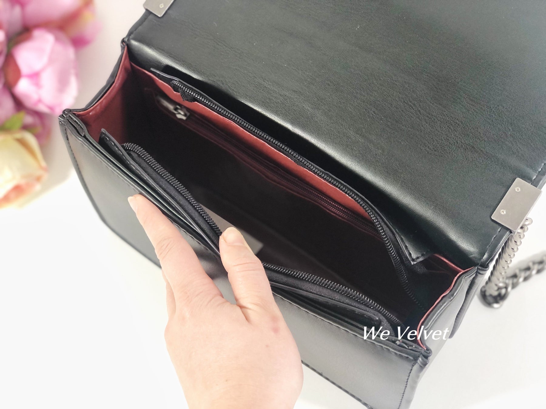 - La interior geanta dispune de un compartiment spațios, un alt compartiment micuț, un buzunar liber și un buzunar cu fermoar