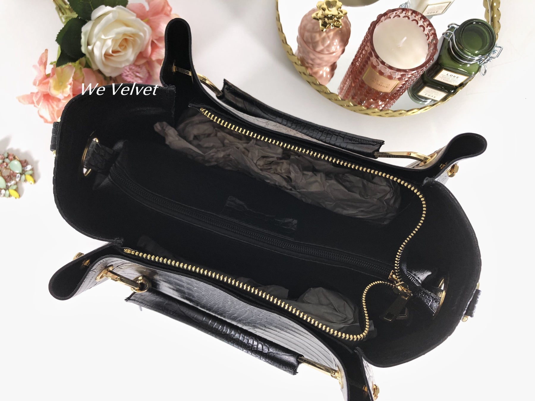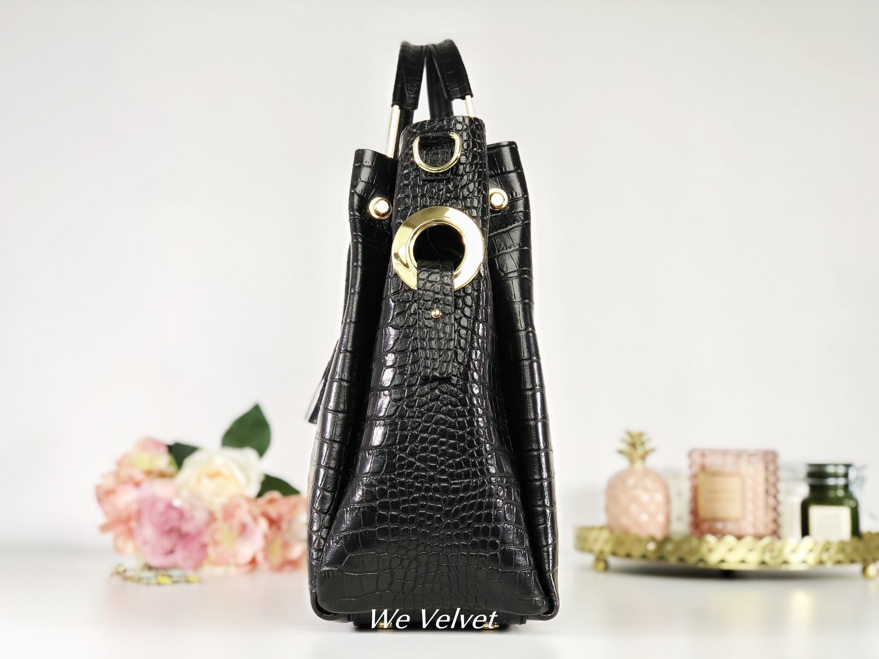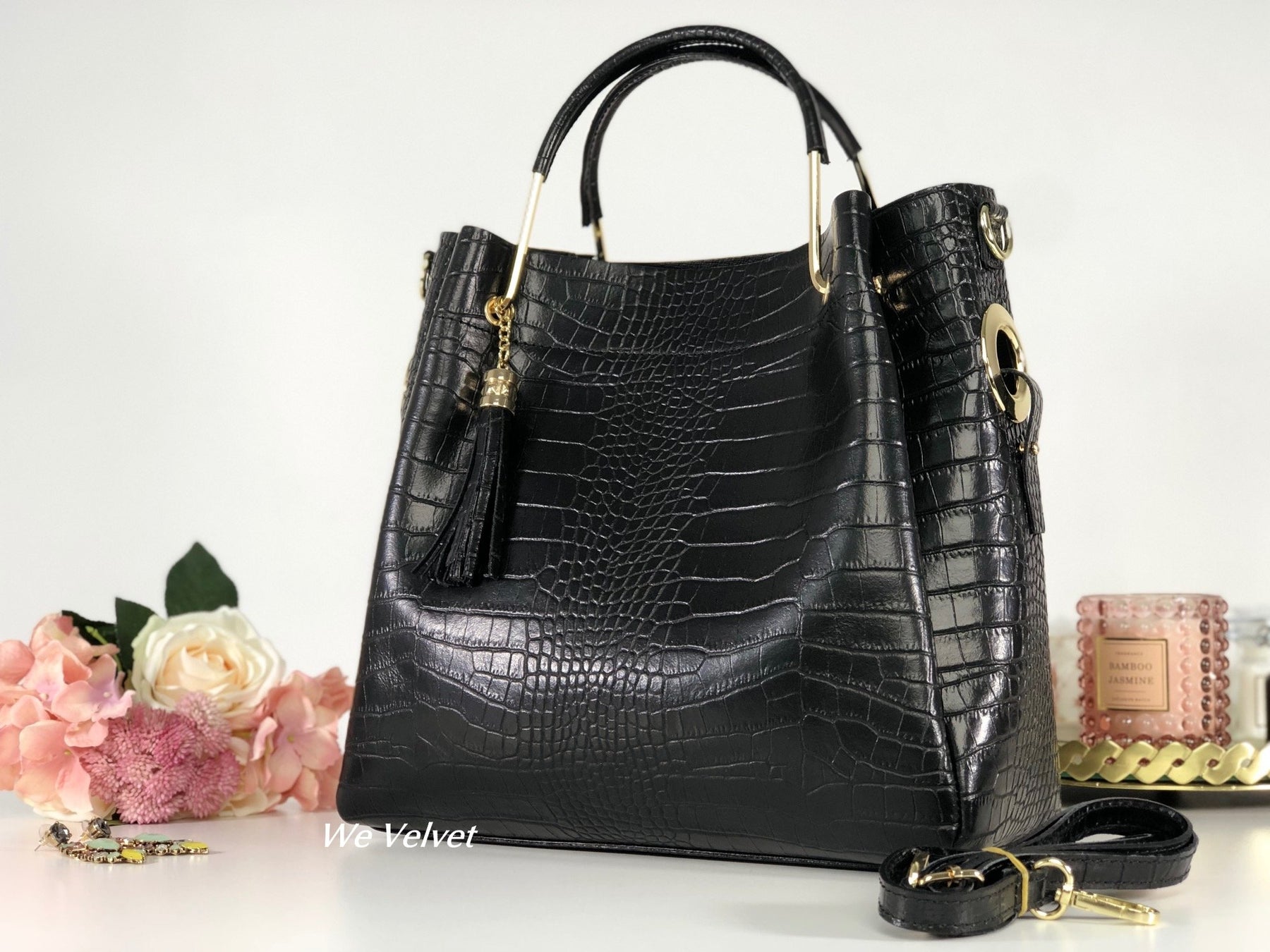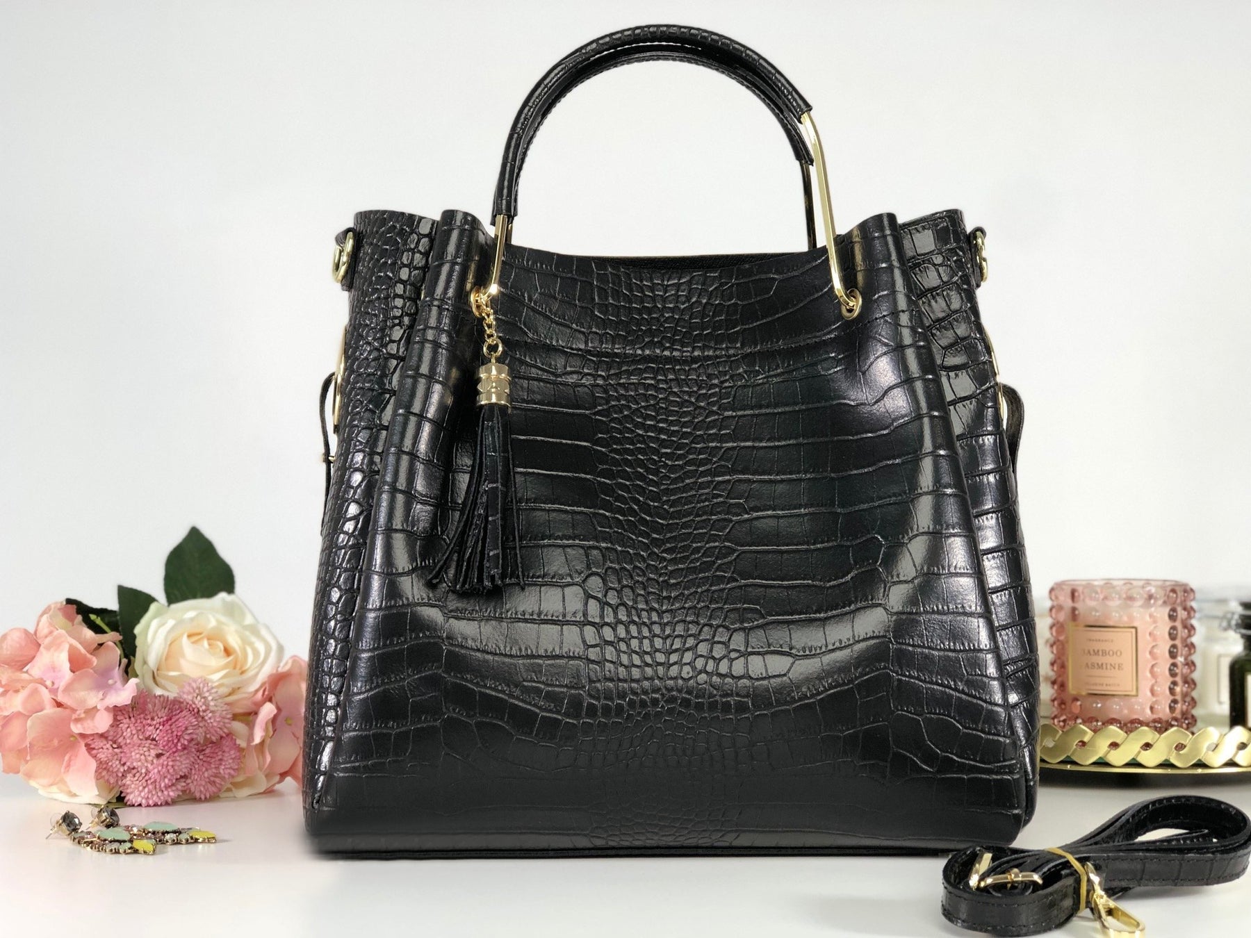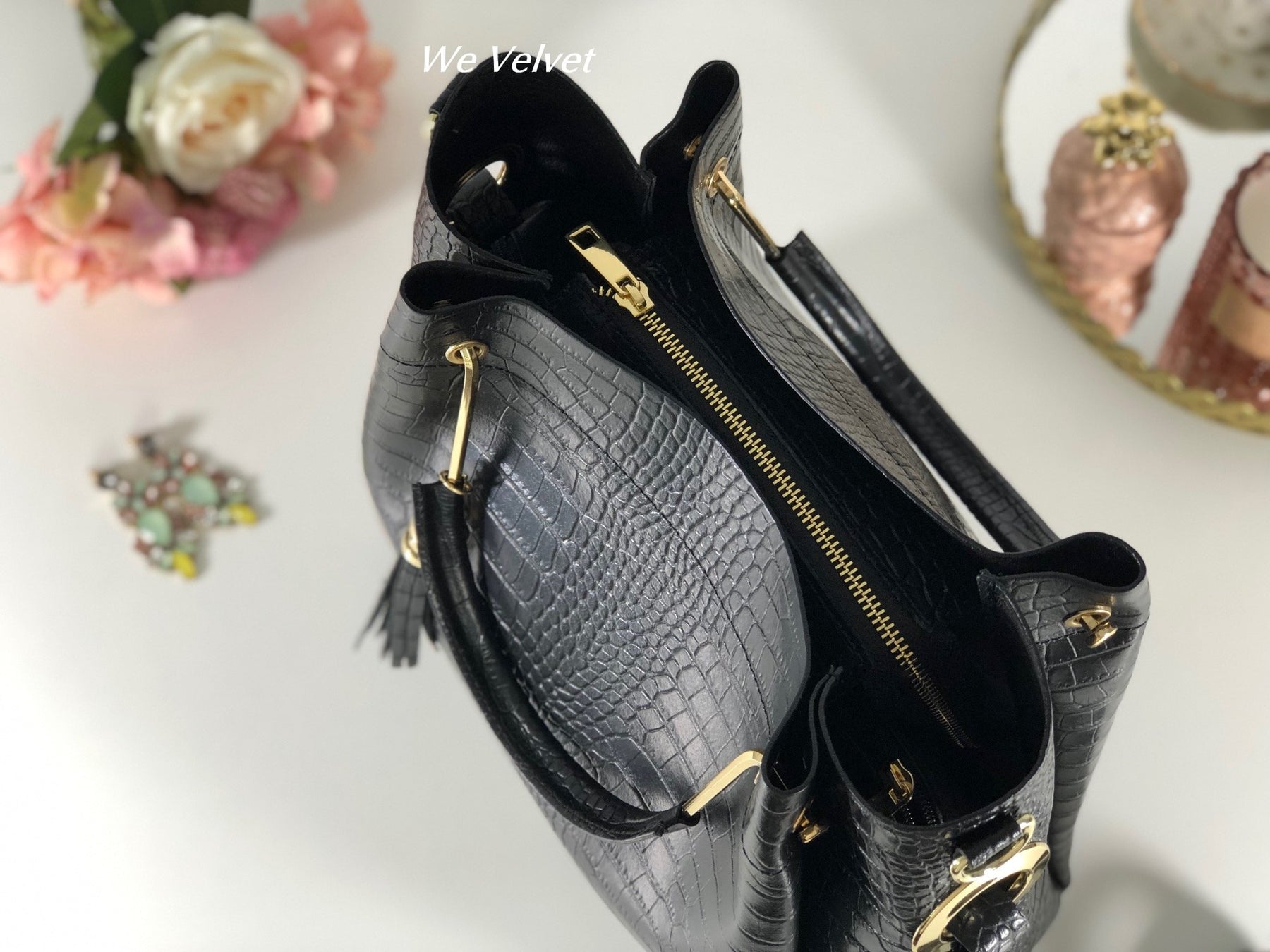 Geantă neagră piele naturală cu imprimeu croco Allegria