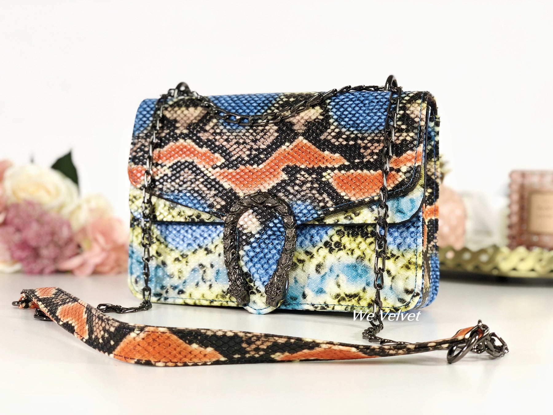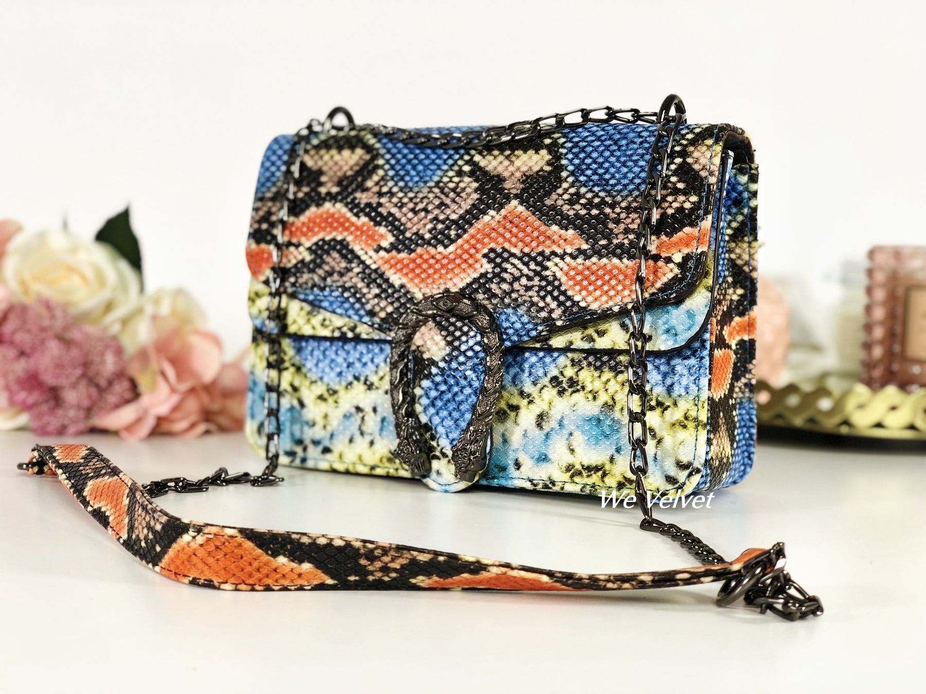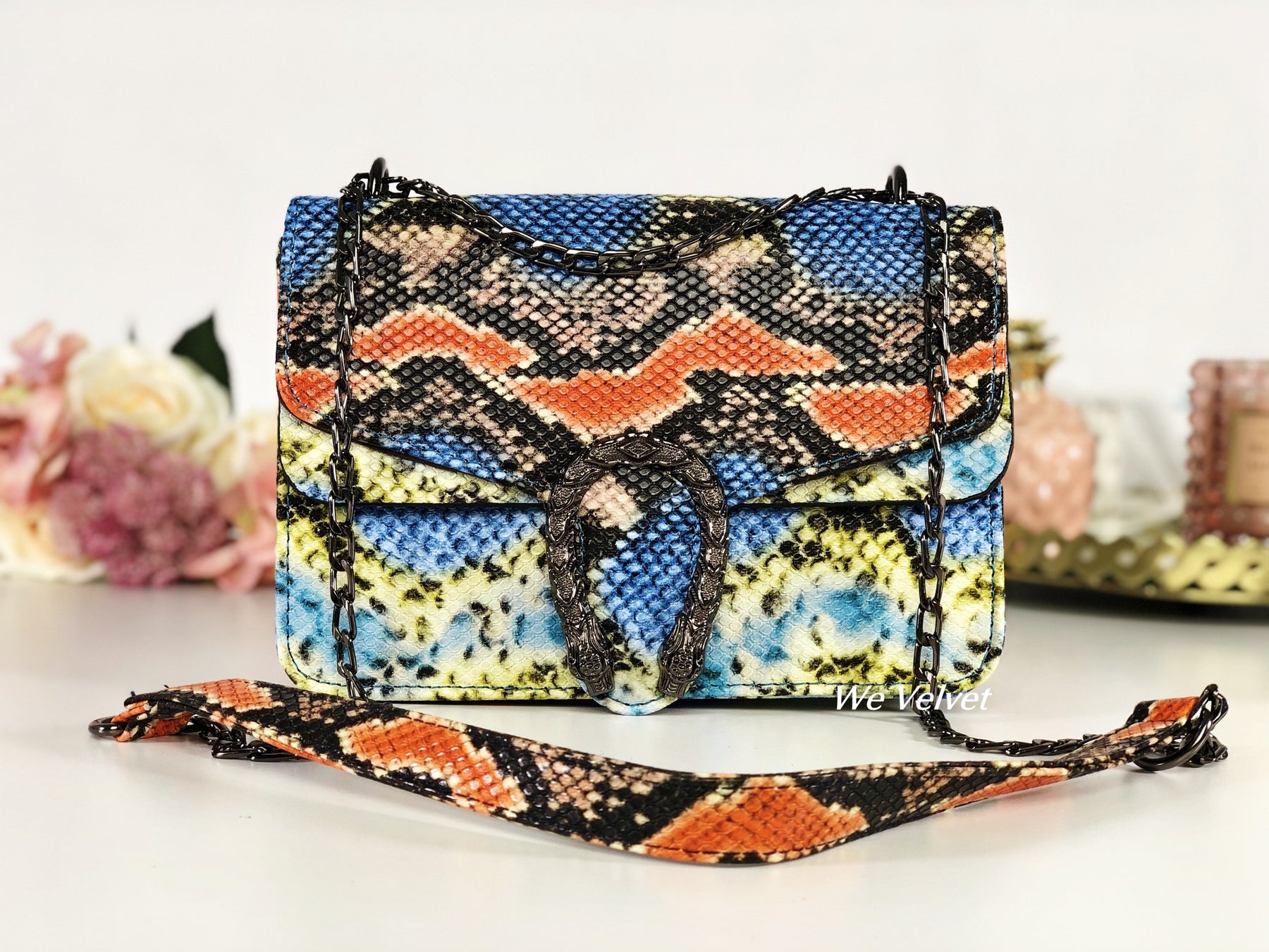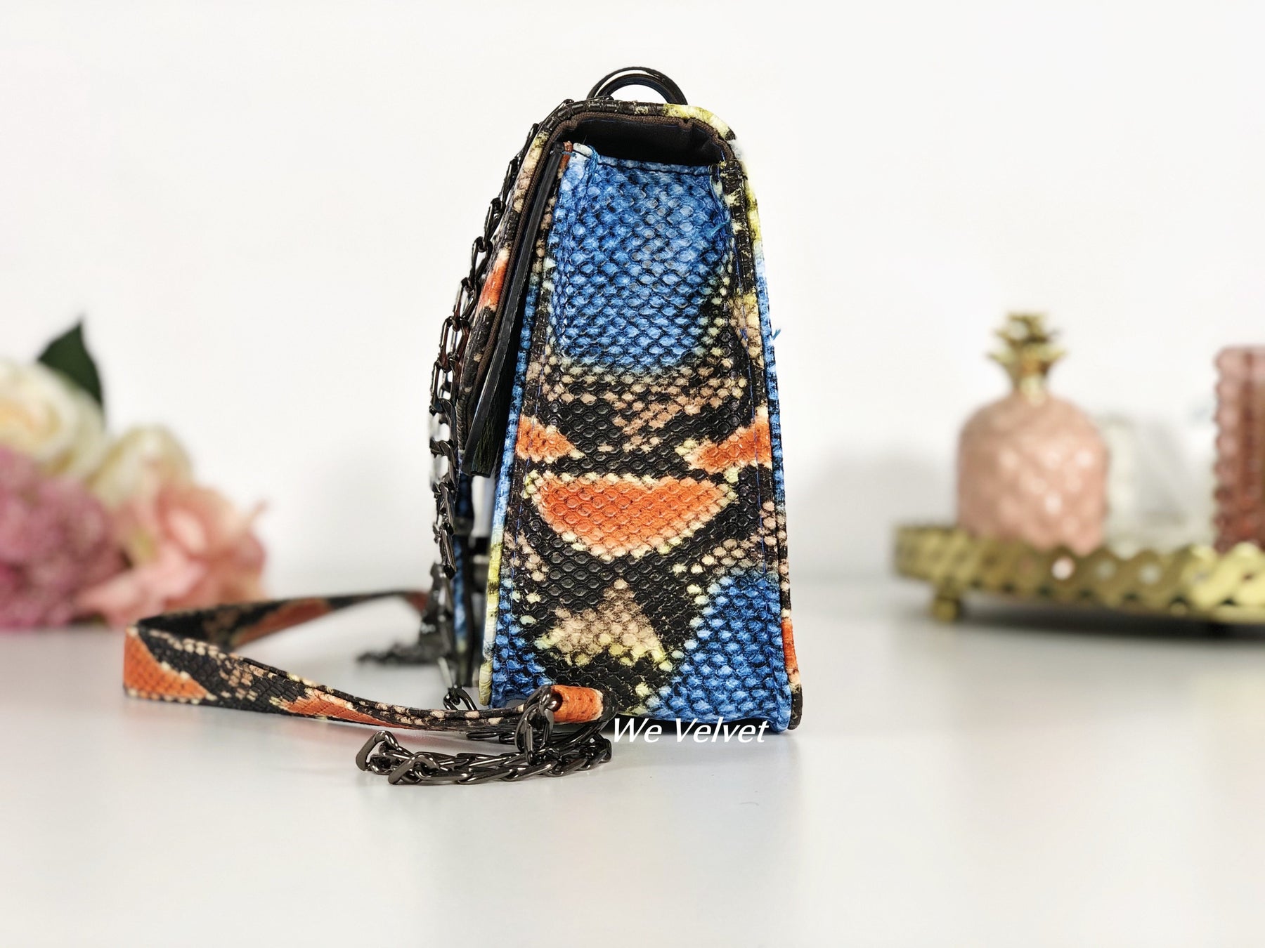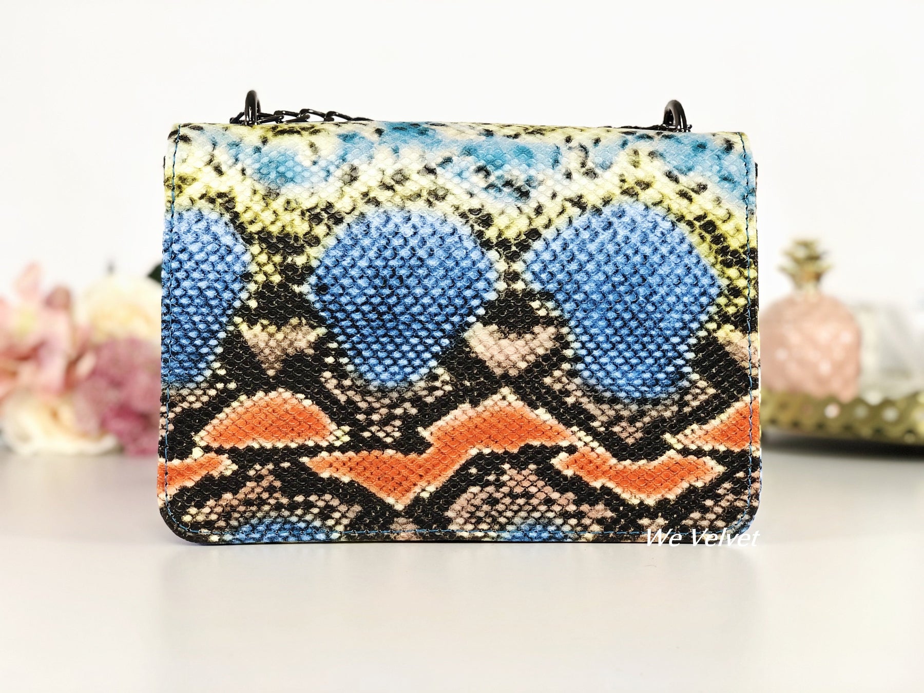 Geantă small albastră piele eco cu print snake portocaliu Aliza