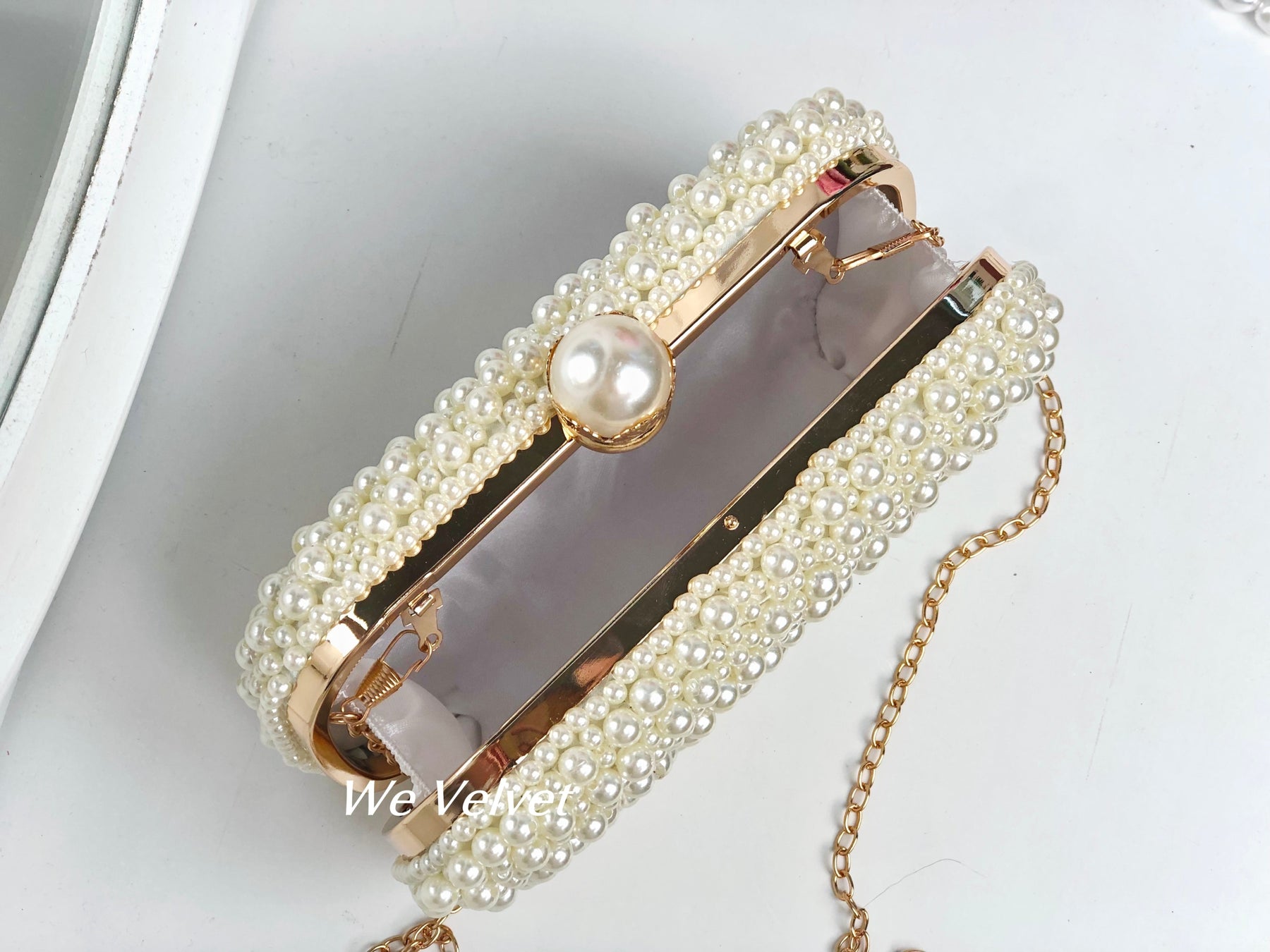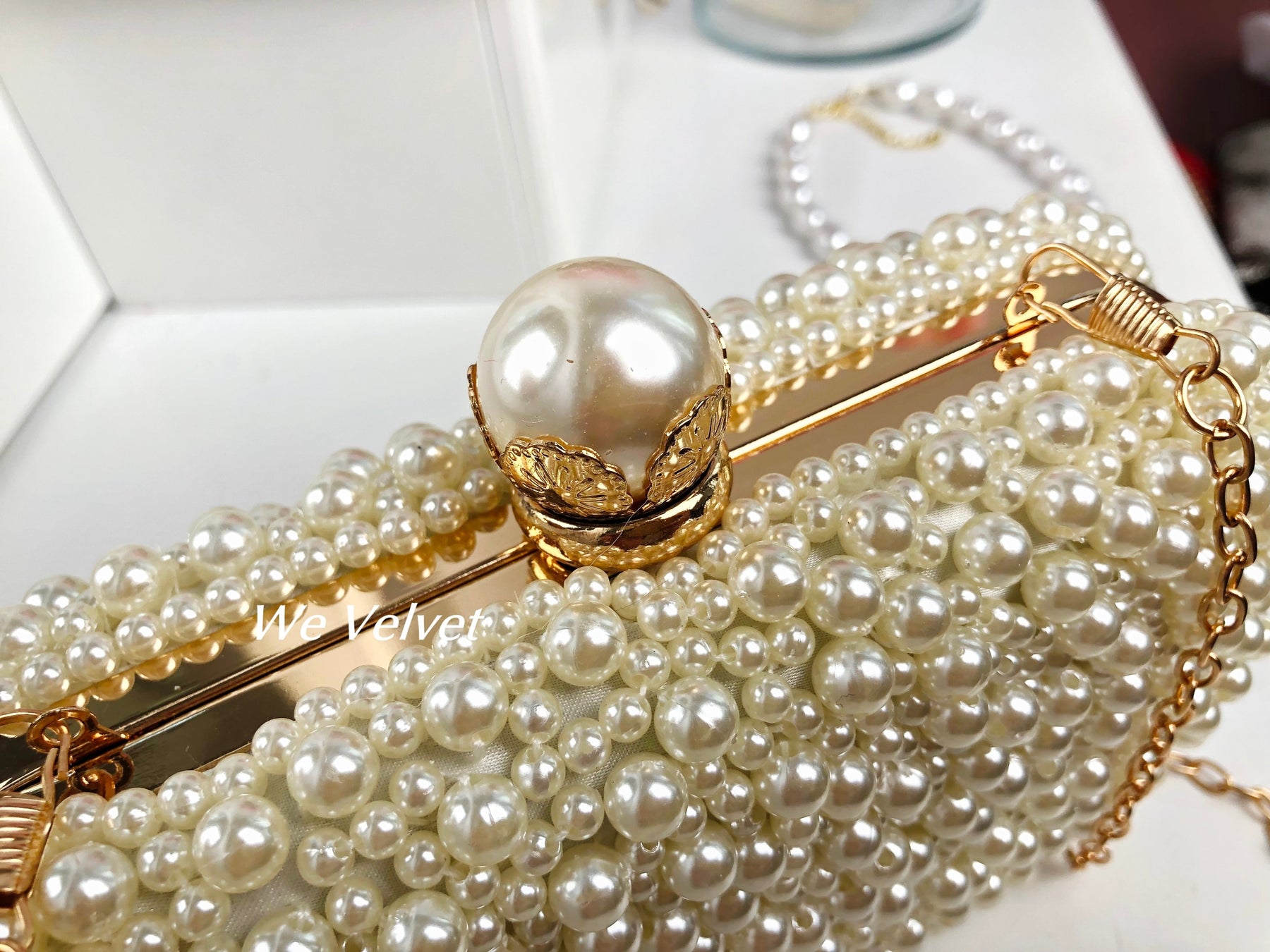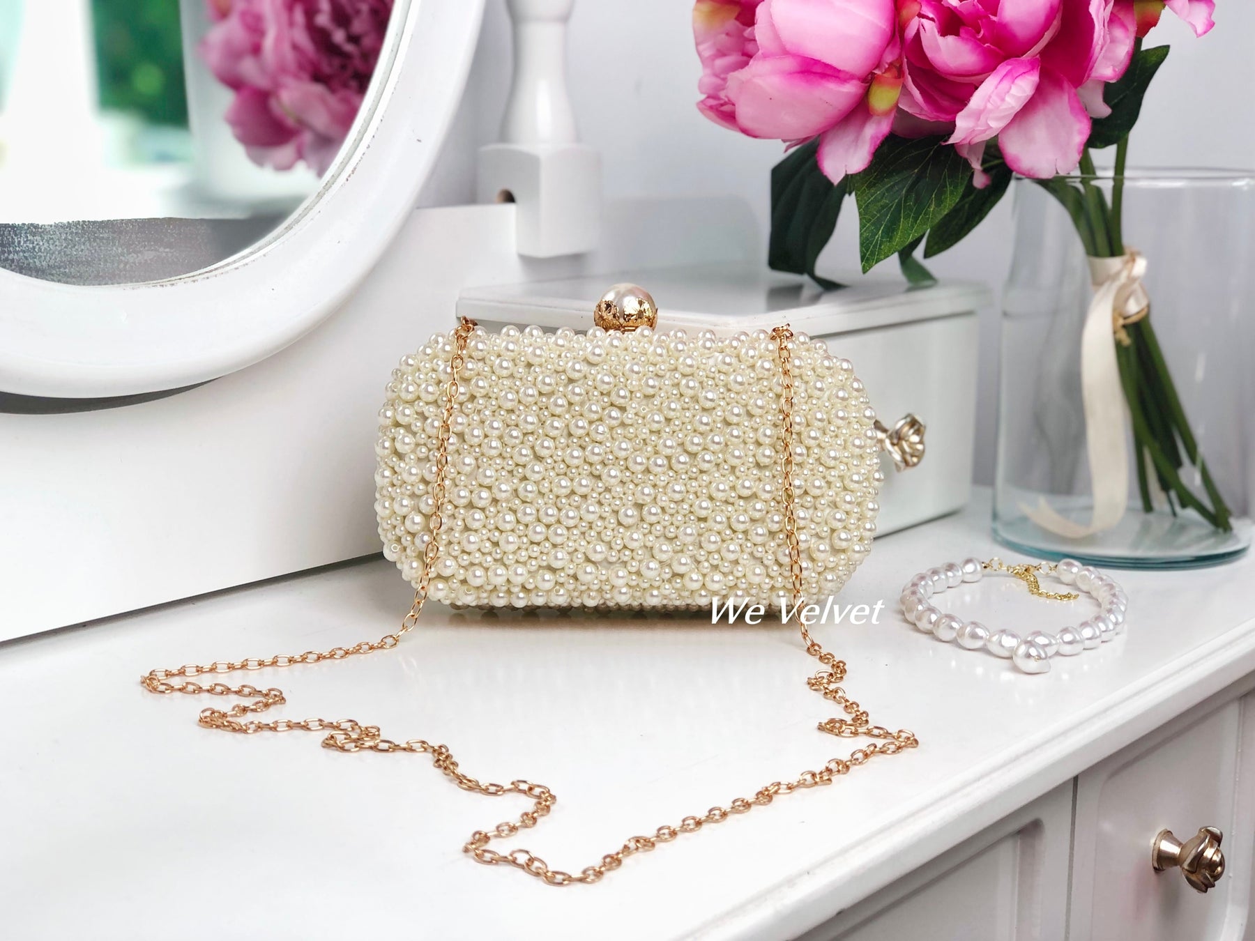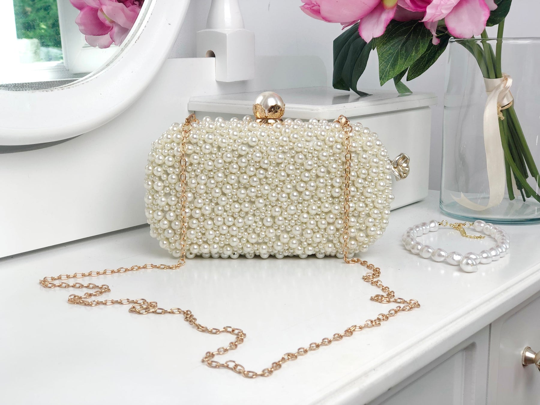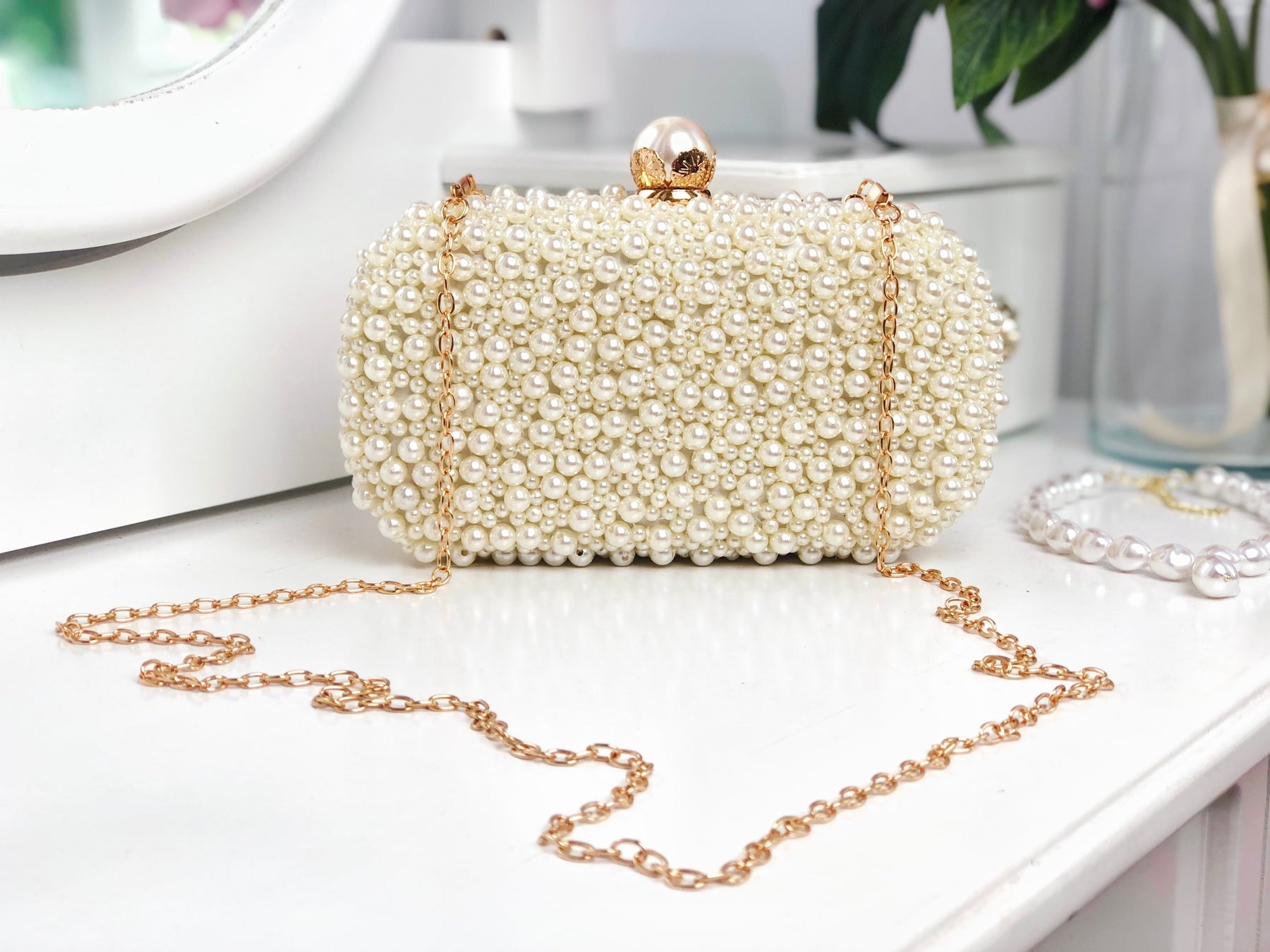 O geantă elegantă, tip clutch, perfectă pentru orice ocazie specială din viața ta! Este decorată cu perluțe finuțe ce îți vor scoate în evidență toate ținutele!