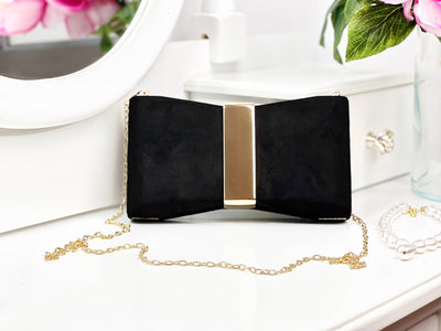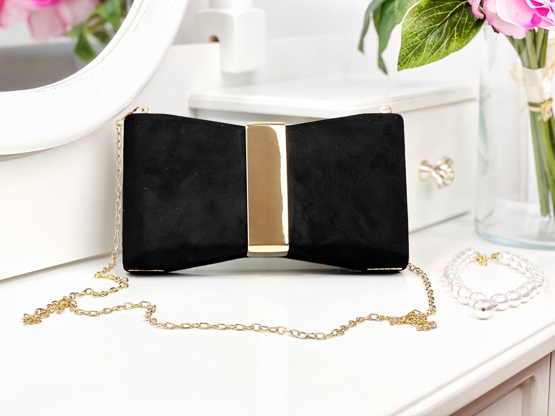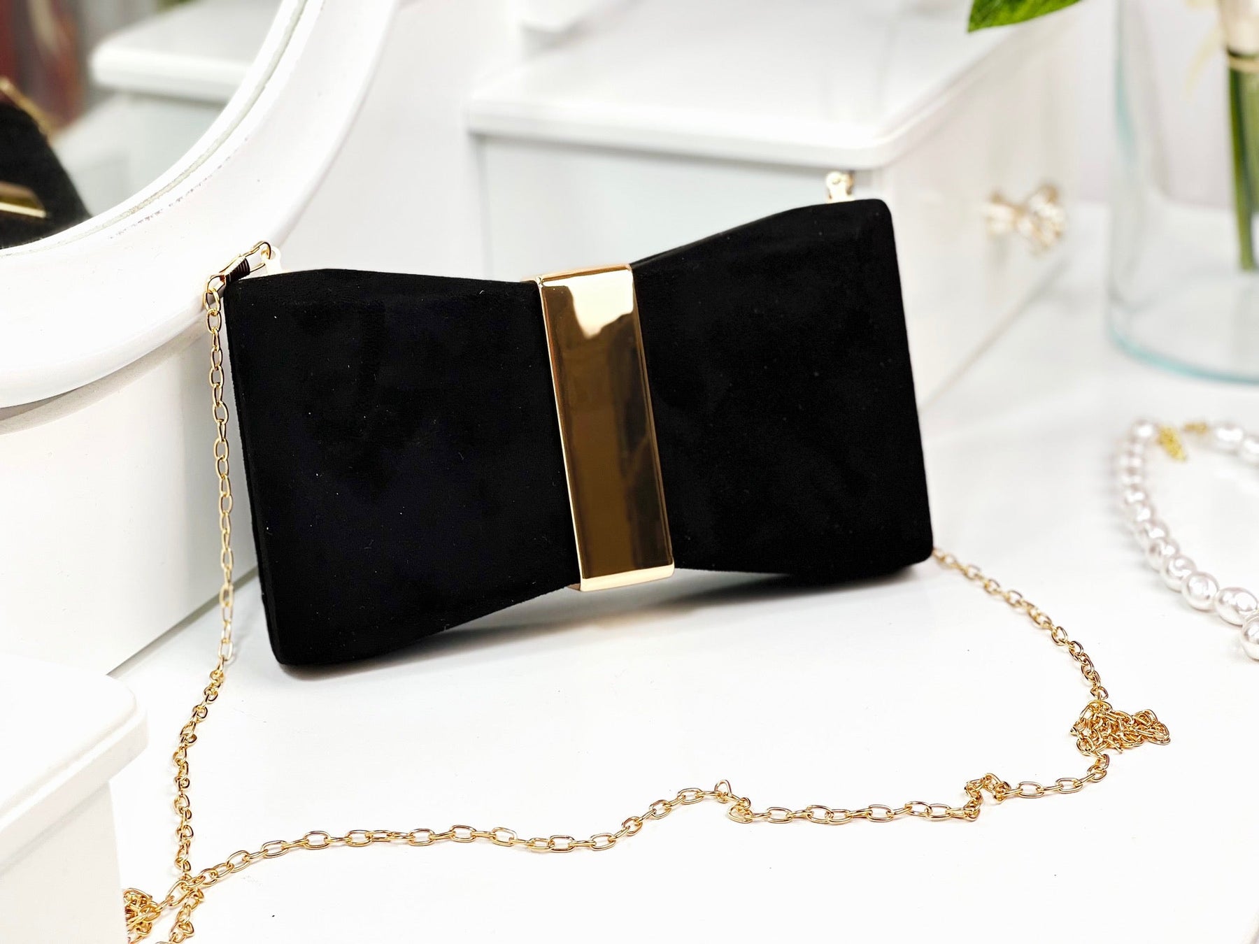O geantă inedită, în formă de fundiță, acompaniată de accesorii metalice aurii, ce vor complimenta orice tip de ținută!