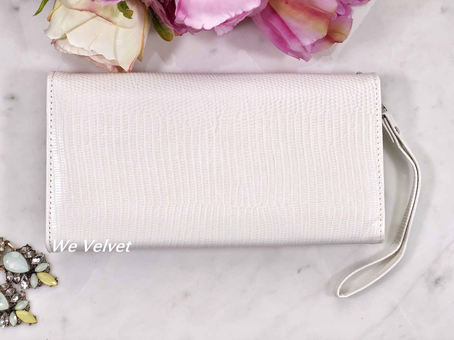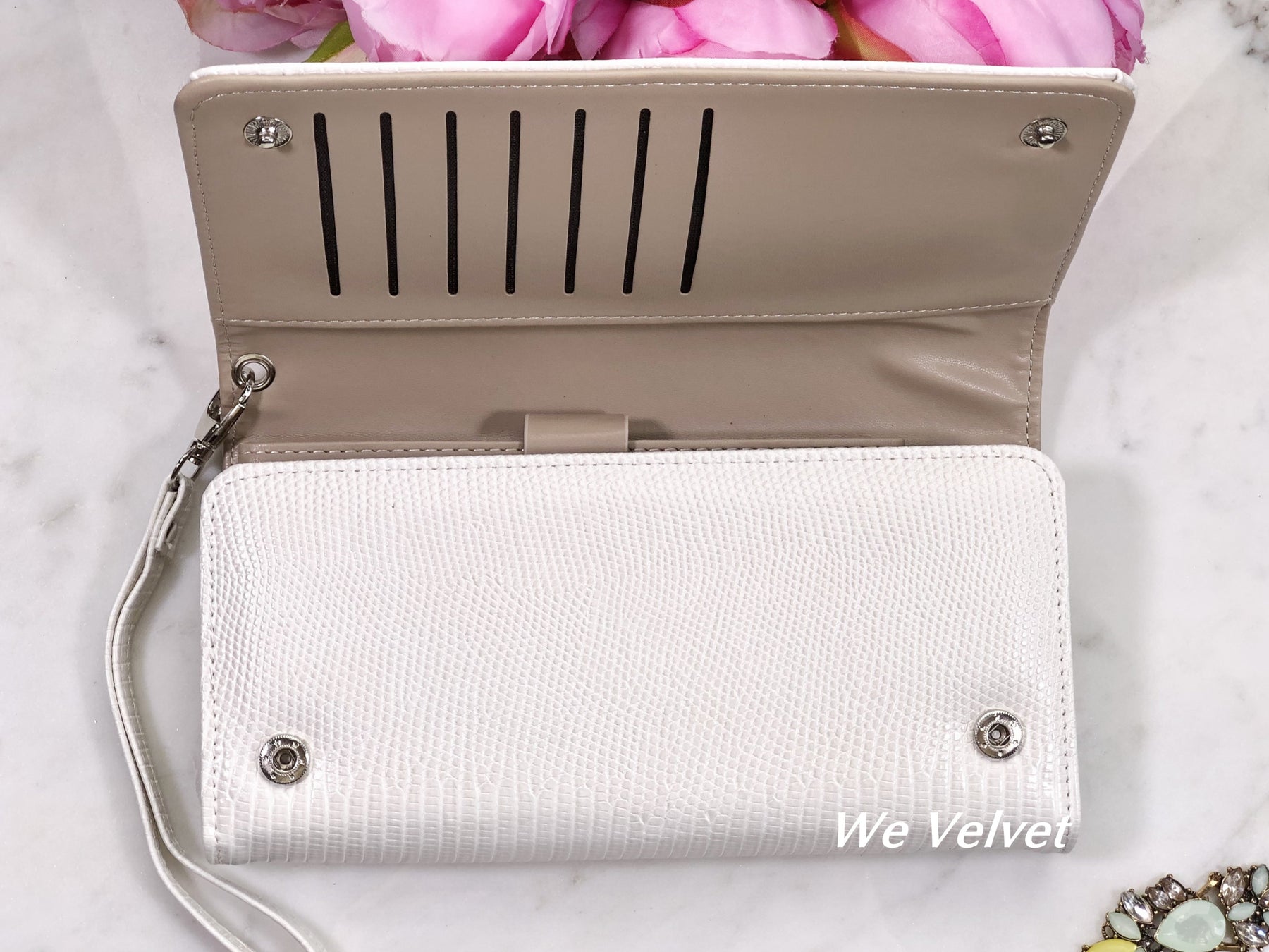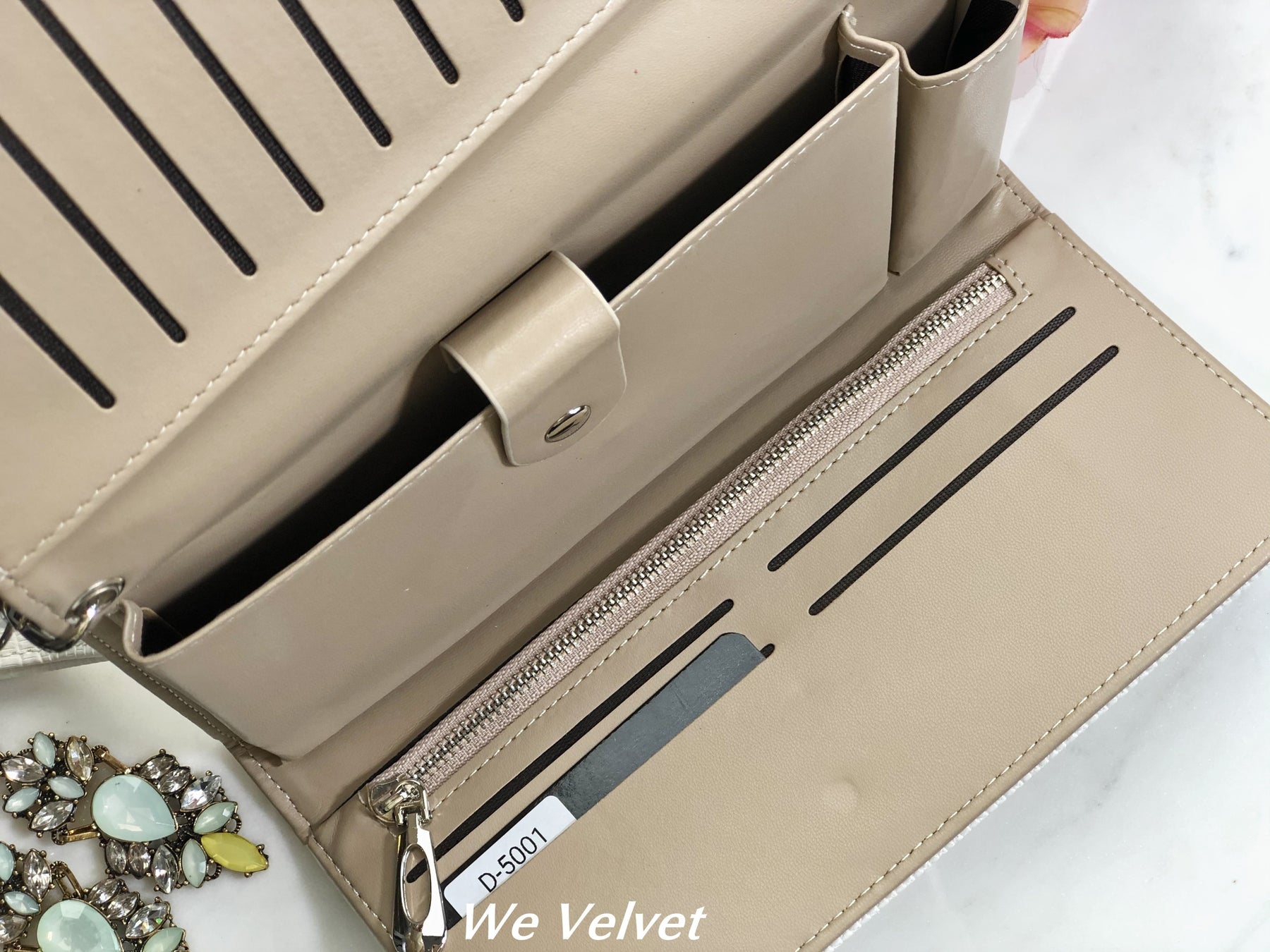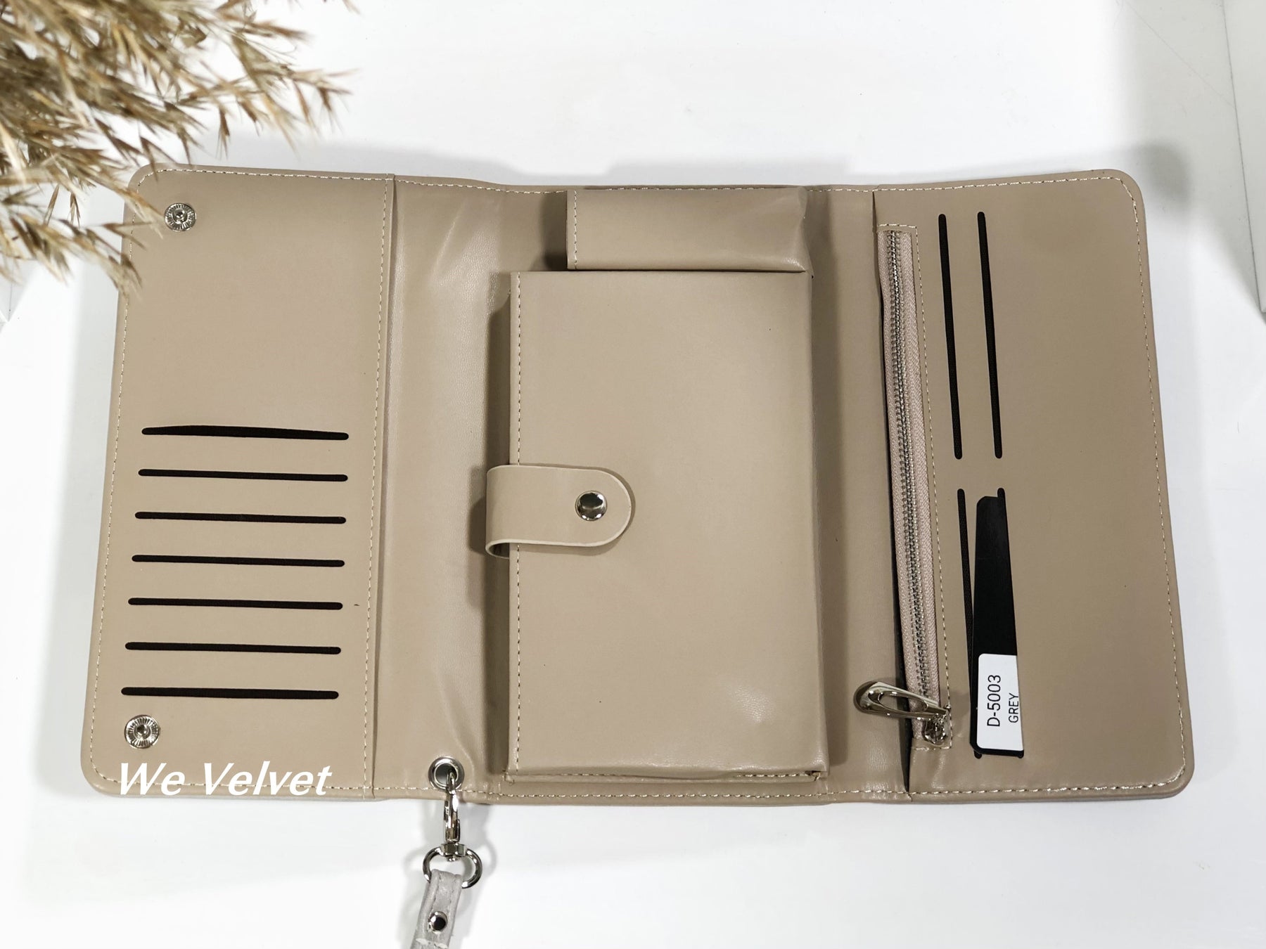 - Dispune de 11 compartimente pentru carduri, 2 compartimente pentru bancnote, un buzunar cu fermoar, un compartiment liber și un compartiment cu capsă.