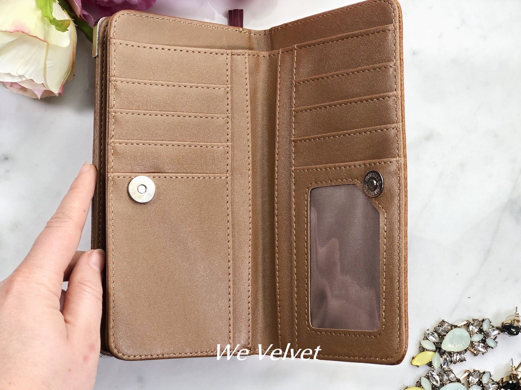 • La interior dispune de 16 compartimente pentru carduri, 10 compartimente pentru bancnote și documente și un compartiment separat, cu fermoar și 2 buzunare libere