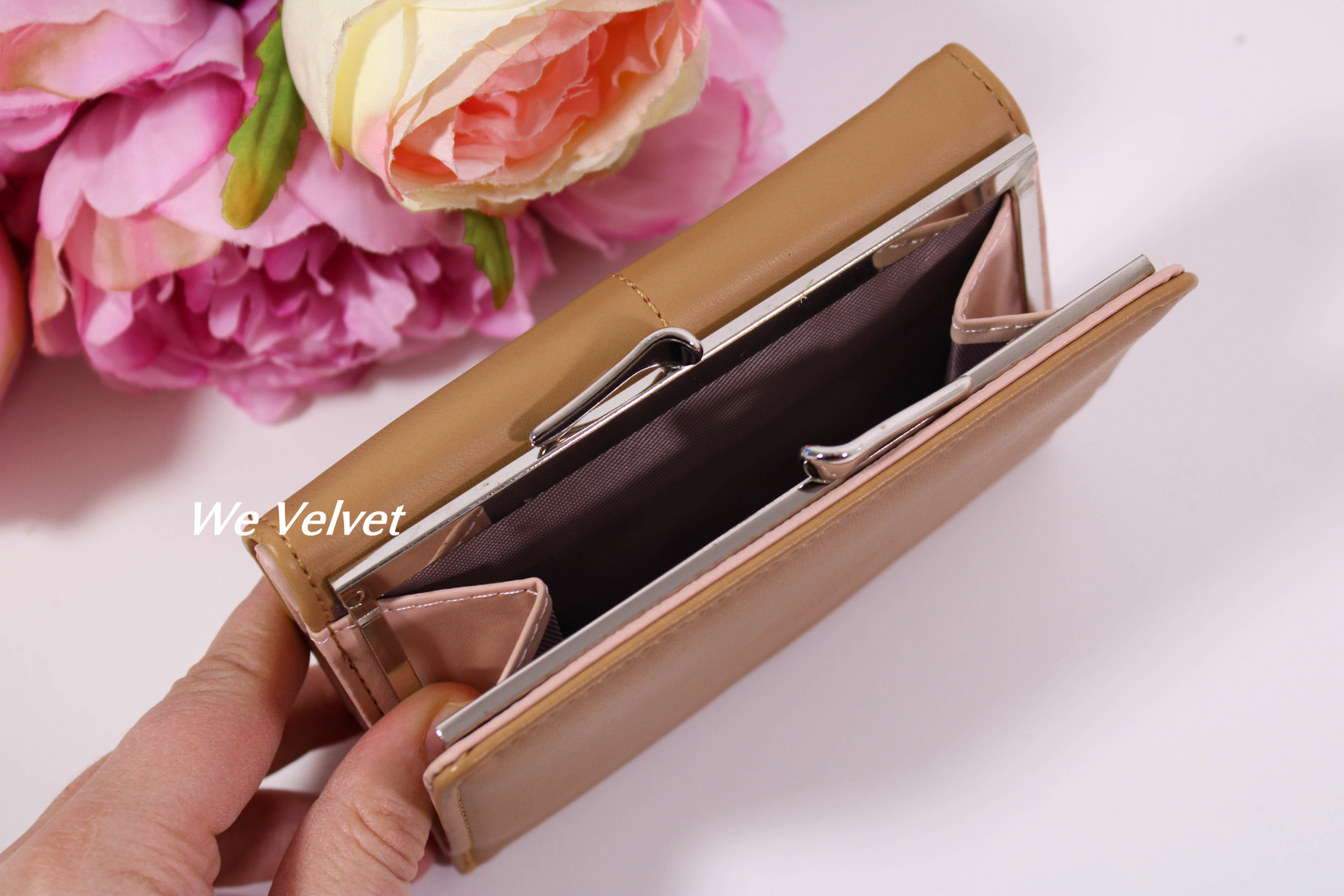 • La exterior dispune de un compartiment cu închidere tip clutch pentru monede