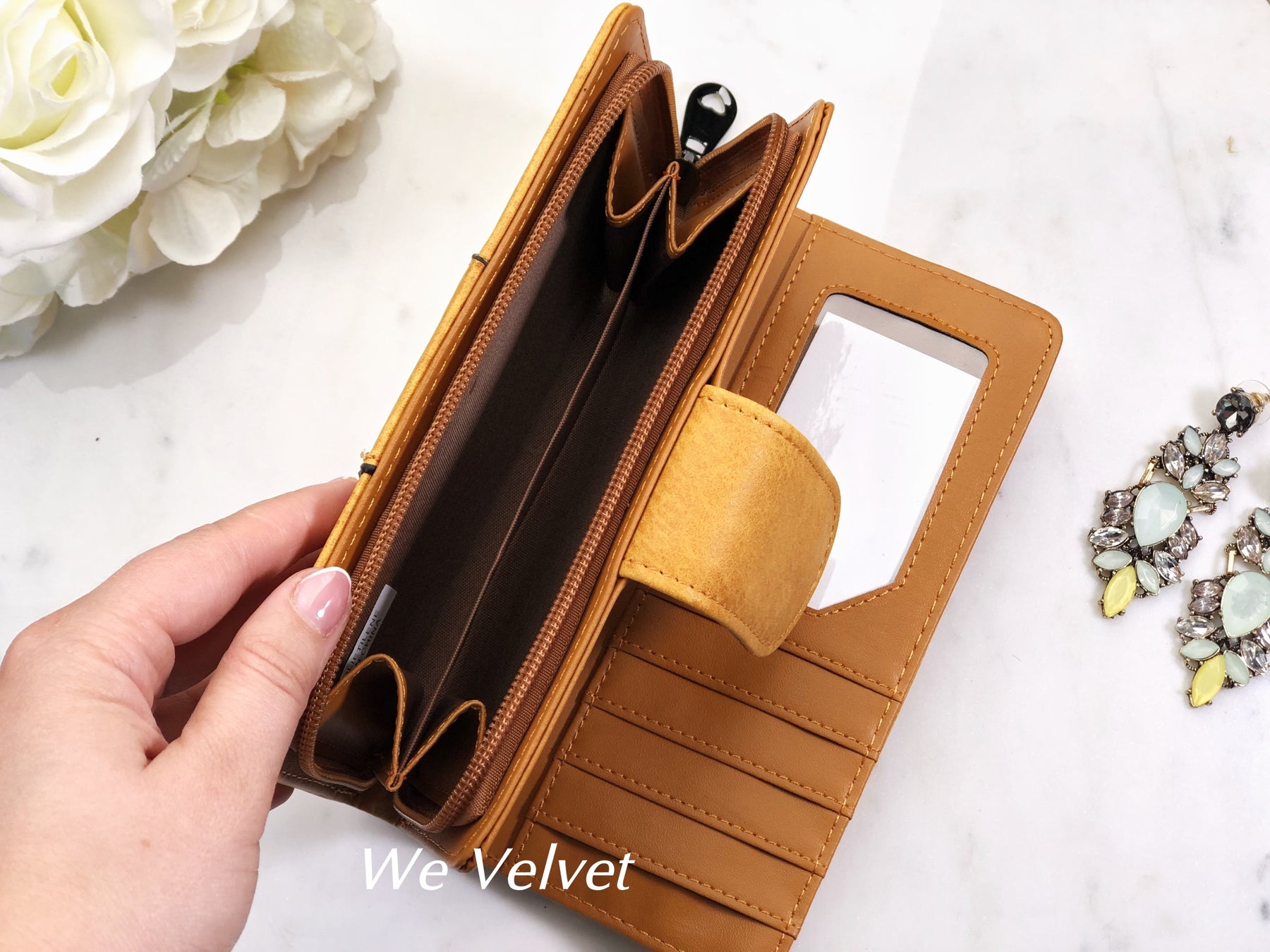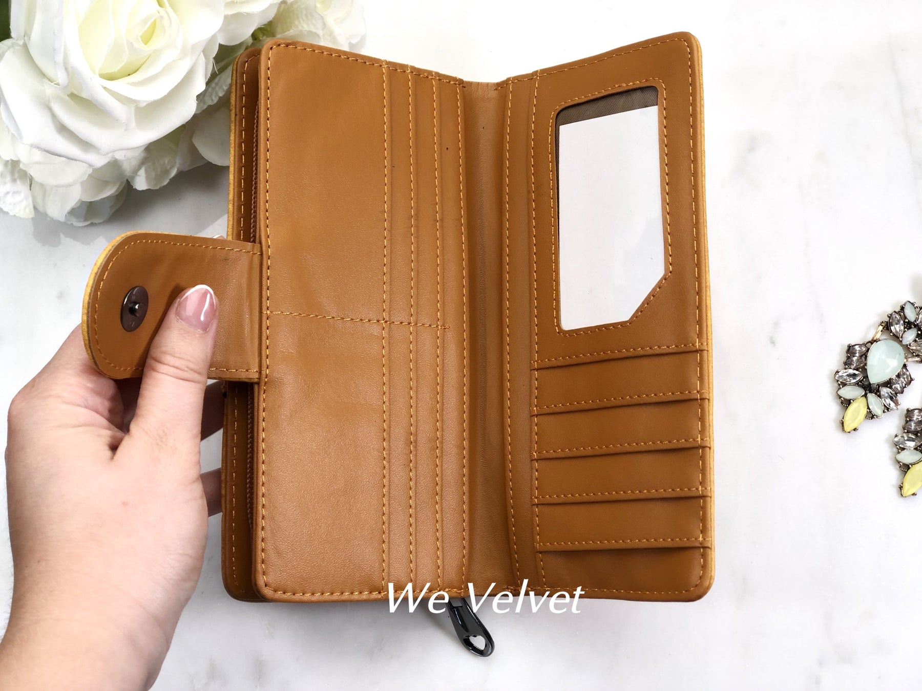 - La interior dispune de 11 compartimente pentru carduri și documente, 2 compartimente pentru bancnote, un buzunar separat cu alte 2 compartimente pentru bancnote sau monede