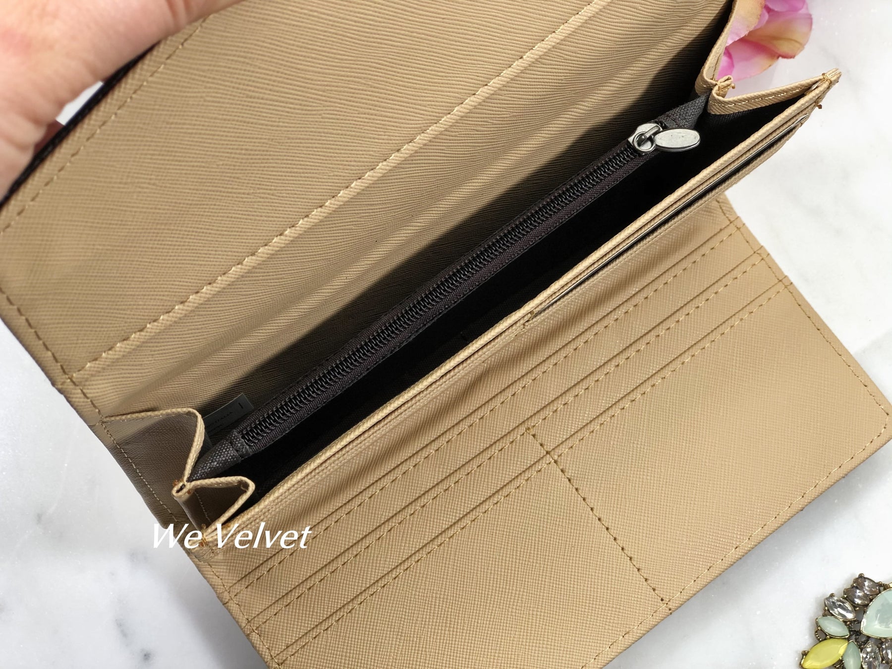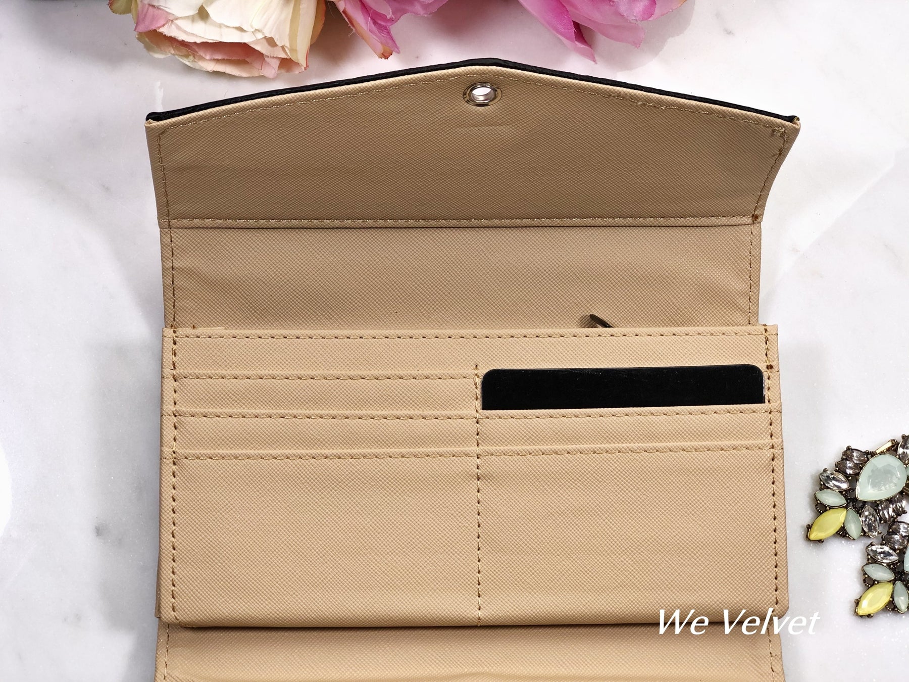 - Dispune de 10 compartimente pentru carduri, 3 compartimente pentru bancnote și documente și 1 buzunar cu fermoar pentru monede