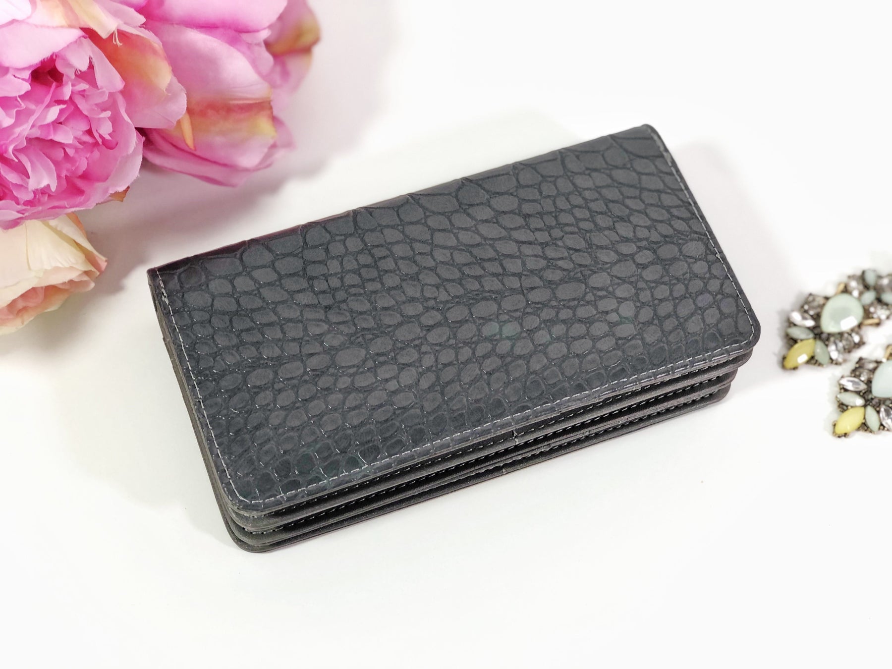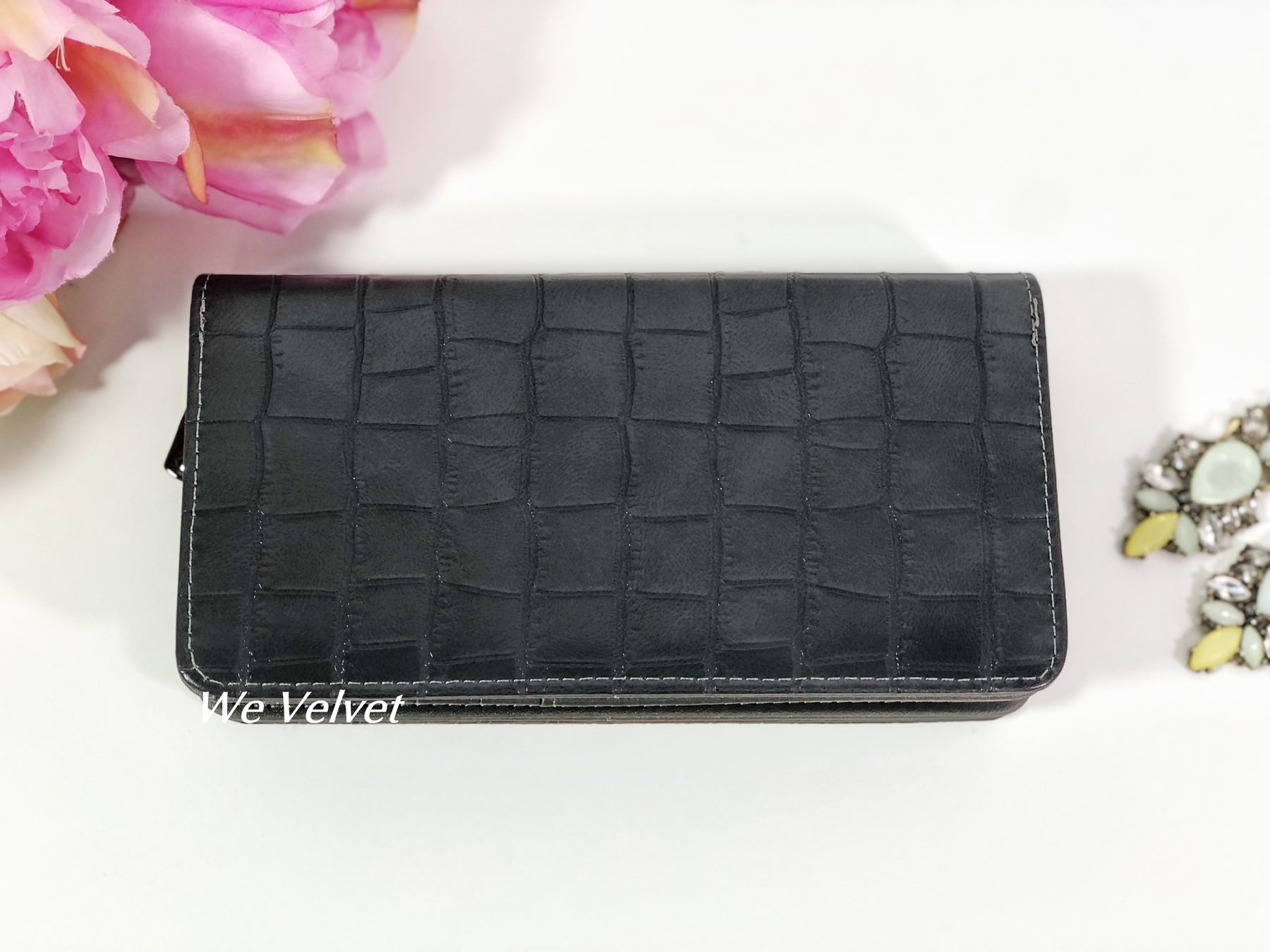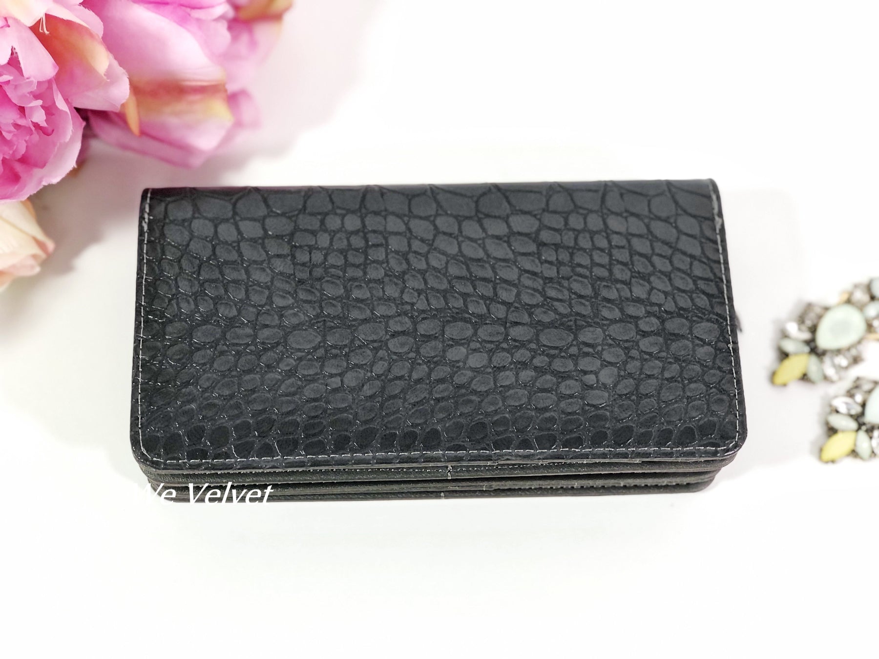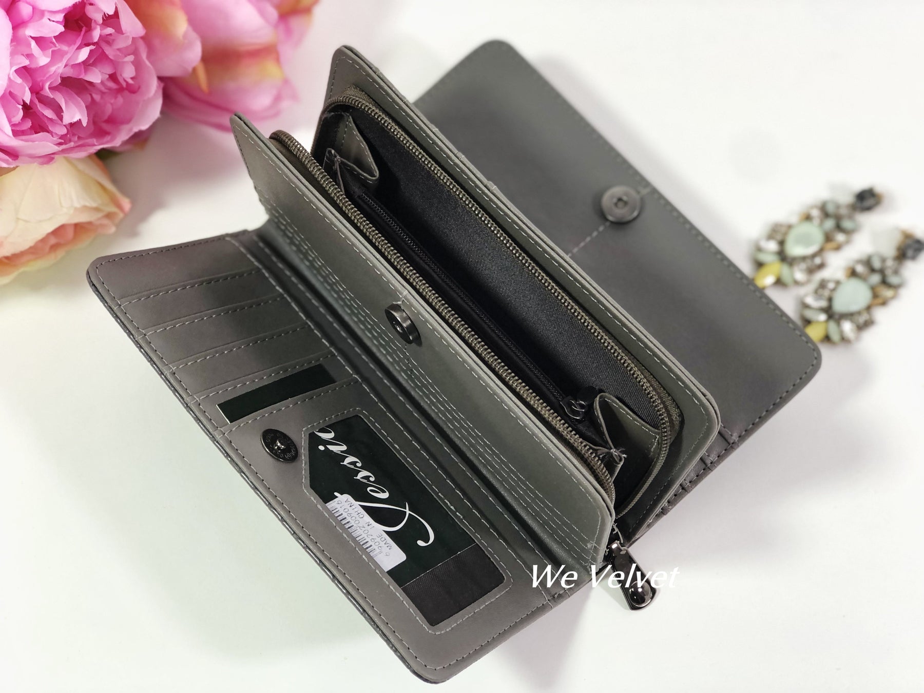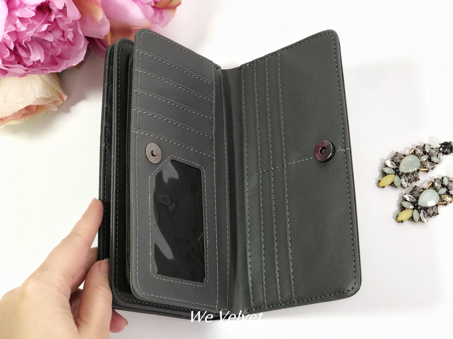 • La interior dispune de 22 de compartimente pentru carduri, 6 compartimente pentru documente, 2 compartimente pentru bancnote și un buzunar cu fermoar pentru monede