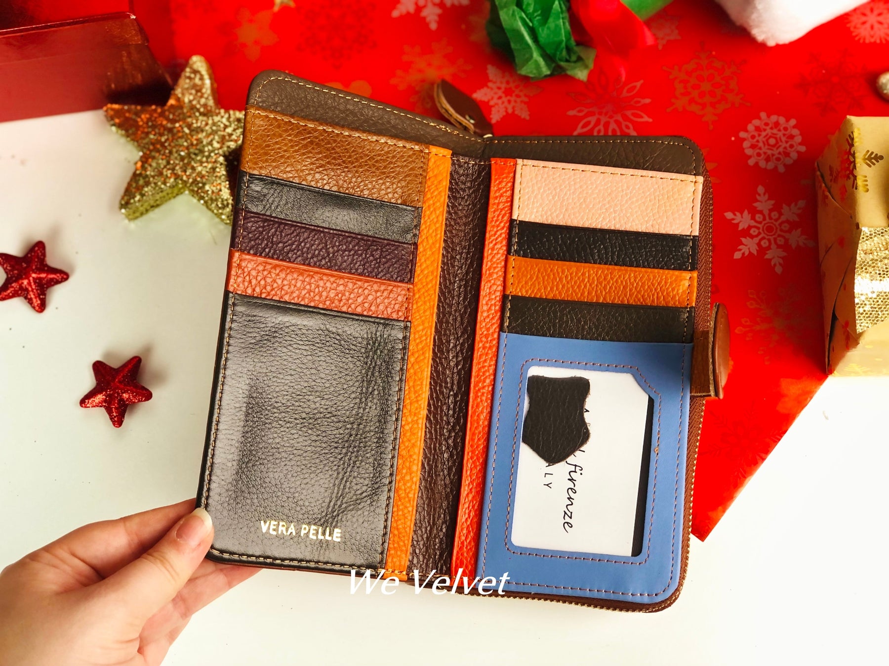 • La interior dispune de 16 compartimente pentru carduri, 6 compartimente pentru documente, 4 compartimente pentru bancnote și un buzunar cu fermoar pentru monede