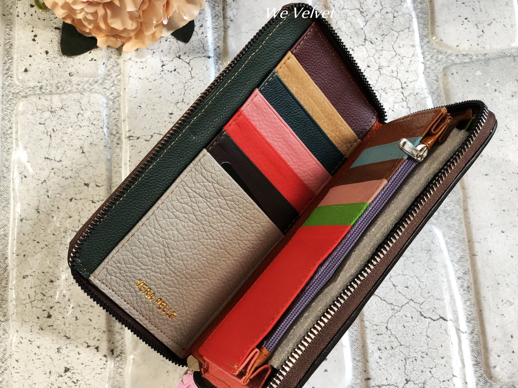 • Dispune de 11 compartimente pentru carduri, 3 compartimente pentru bancnote și un buzunar pentru monede