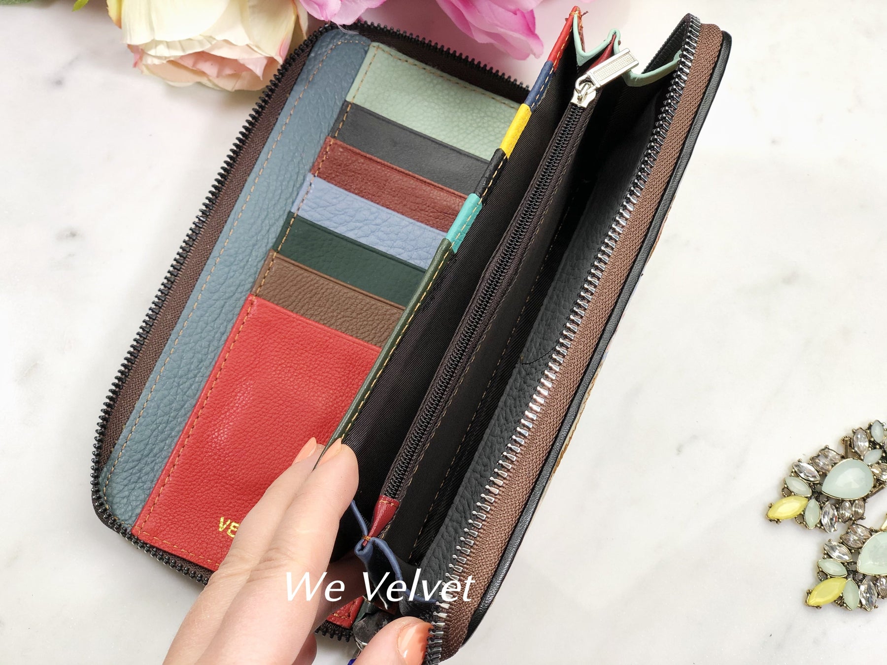 • La interior prezintă un buzunar cu fermoar și două compartimente libere, pentru bancnote și documente