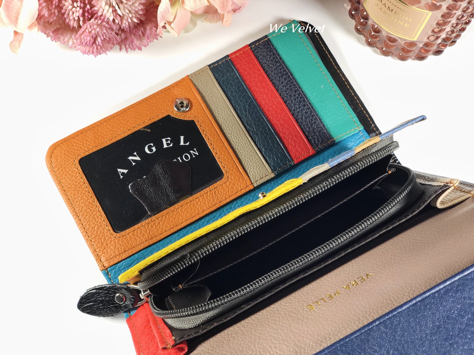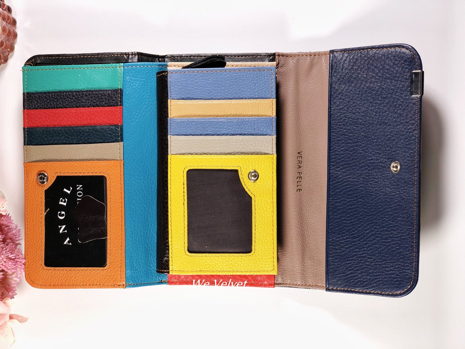 Portofel multicolor piele naturală cu accente teal și roșii Angelino