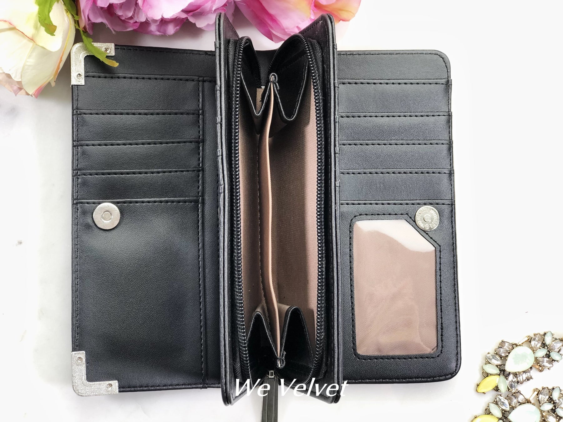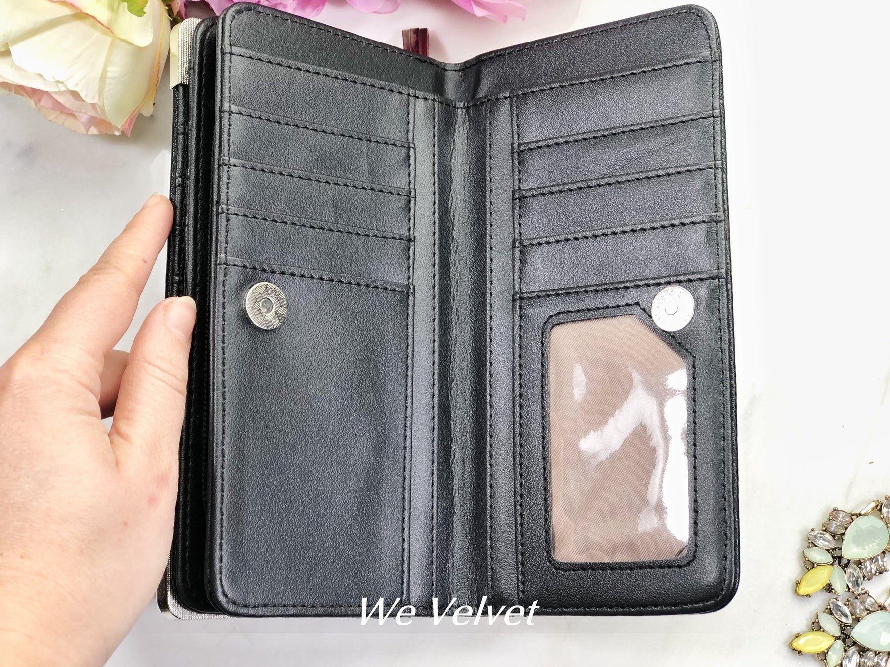 - La interior dispune de 16 compartimente pentru carduri, 10 compartimente pentru bancnote și documente și un compartiment separat, cu fermoar și 2 buzunare libere