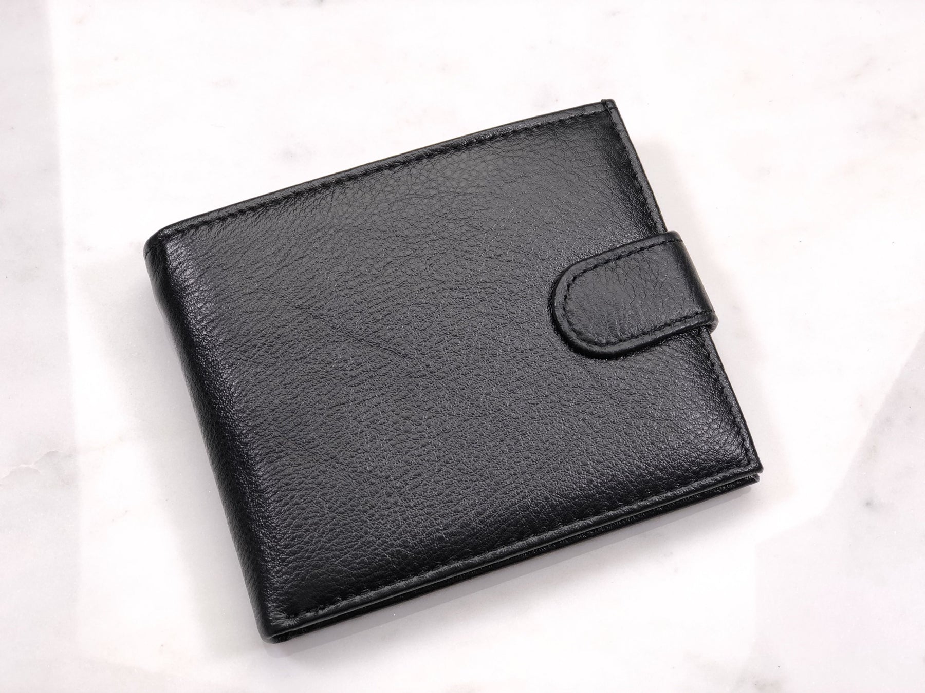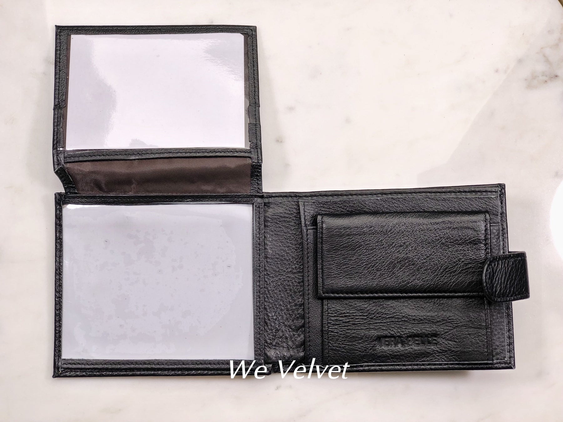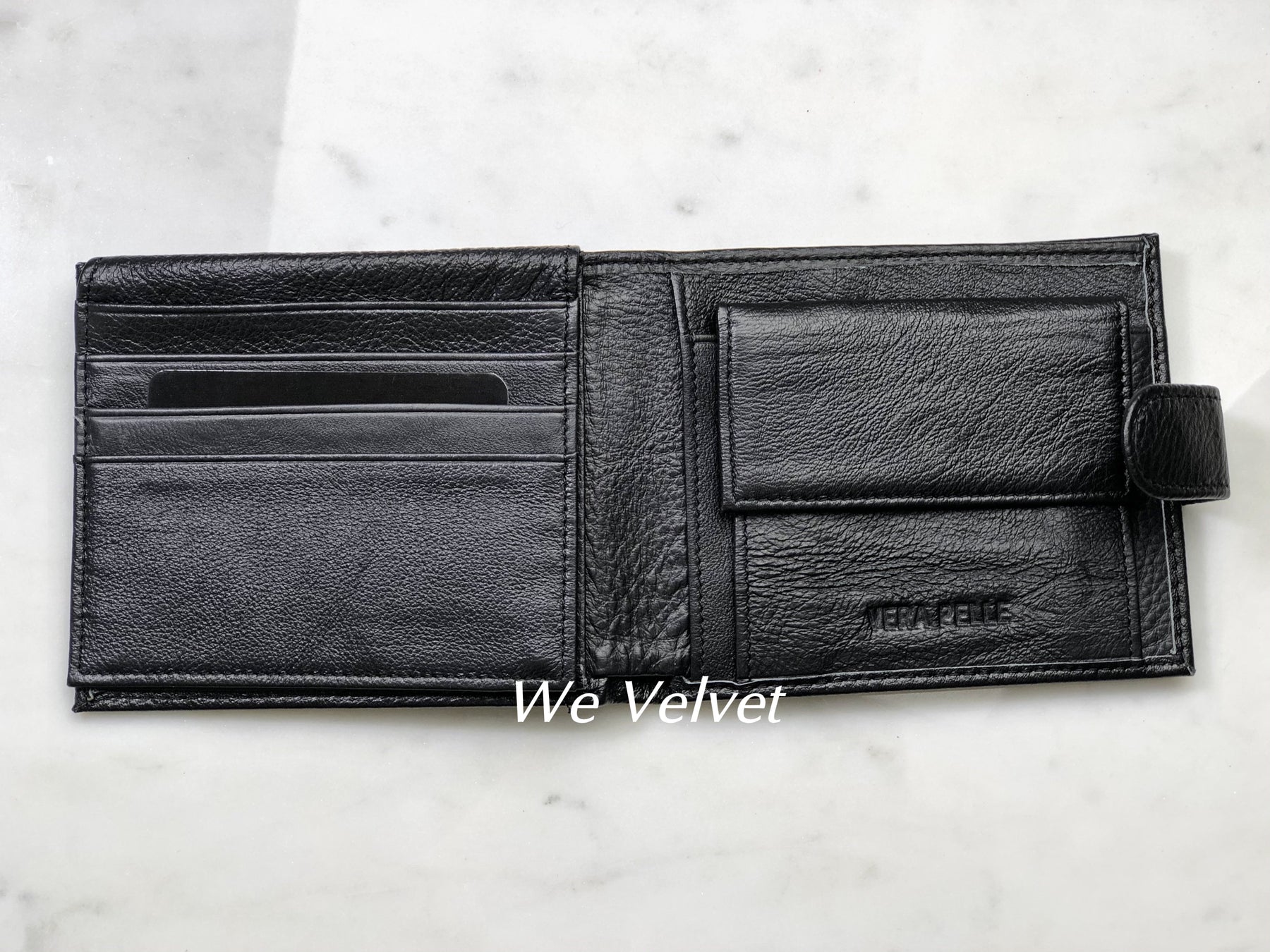 - Portofelul dispunde de 4 compartimente pentru carduri, unul cu capsă, pentru monede, și 3 compartimente pentru acte, două transparente