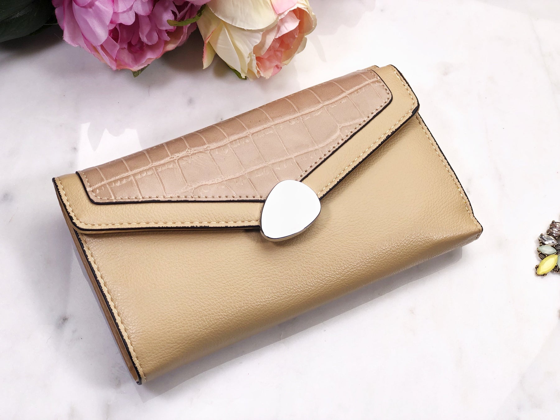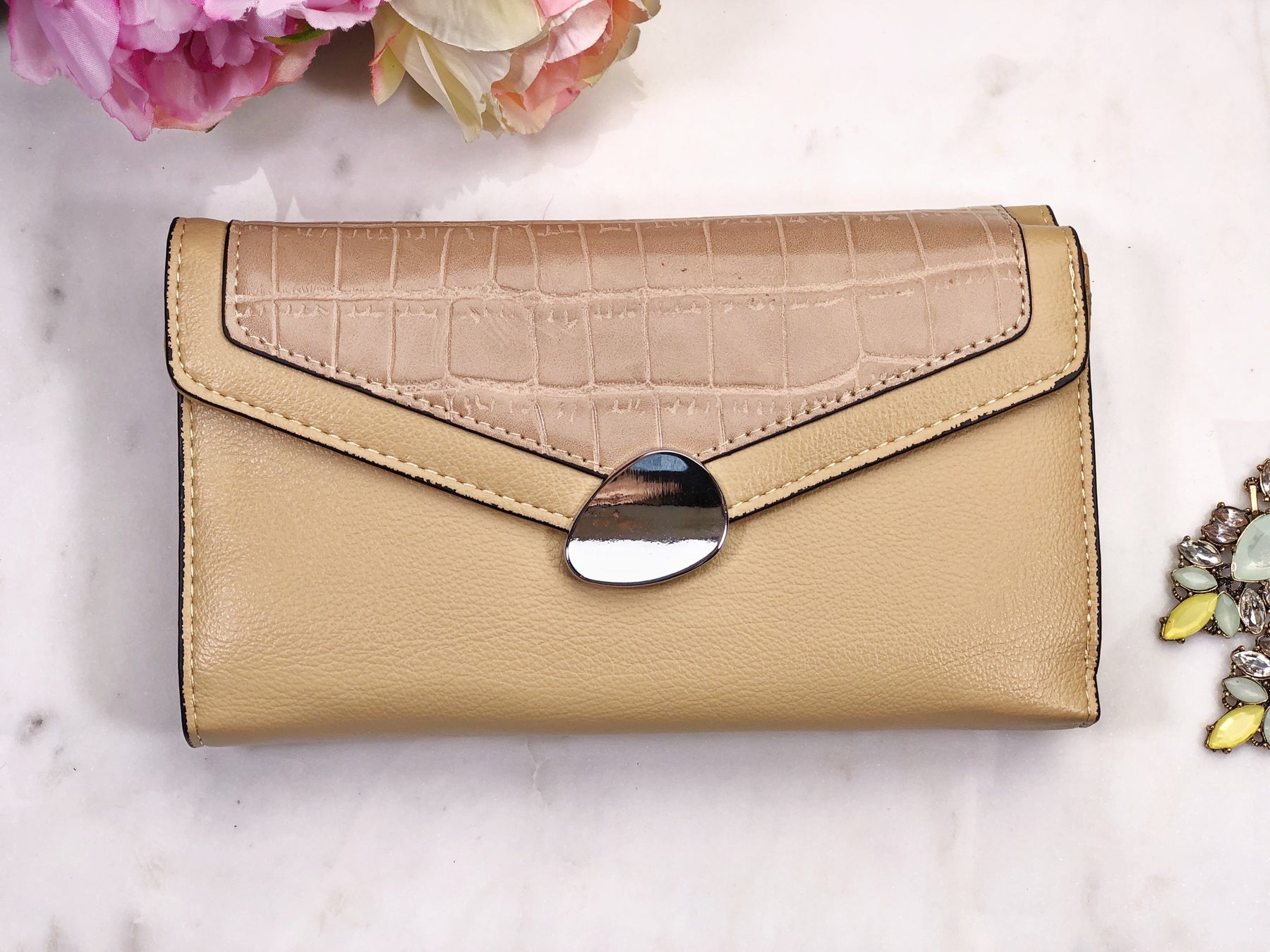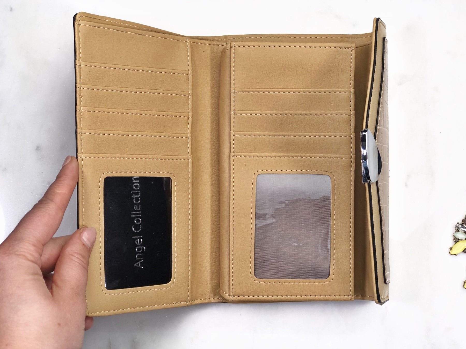Nici nu ai crede că portofelul Eunice este din piele ecologică! Materialul de cea mai bună calitate îi conferă o textură foarte plăcută la atingere iar finisajele și detaliile fine își vor păstra aspectul mult timp. Contrastul dintre pielea ecologică ușor texturată și cea cu imprimeu croco fac portofelul un accesoriu foarte stilat. În interior vei descoperi o mulțime de compartimente pentru carduri, un buzunar cu fermoar și 2 compartimente libere. Portofelul se închide cu un magnet mascat de un accesoriu metallic.